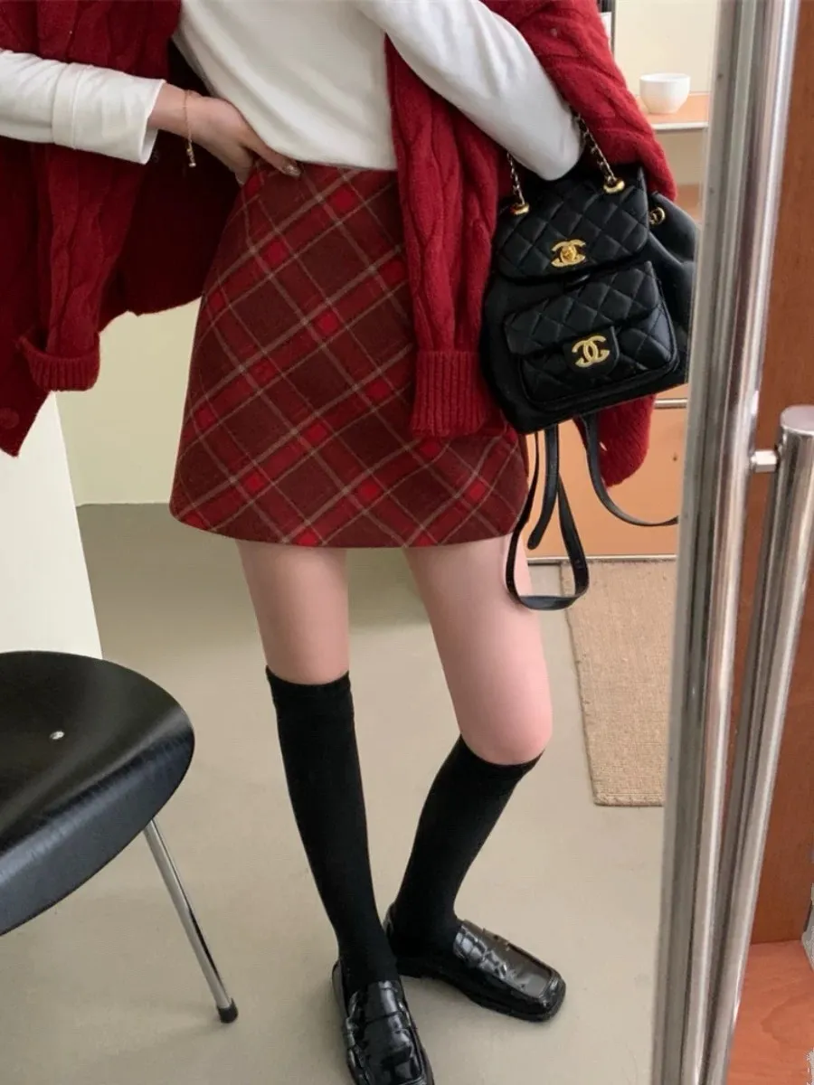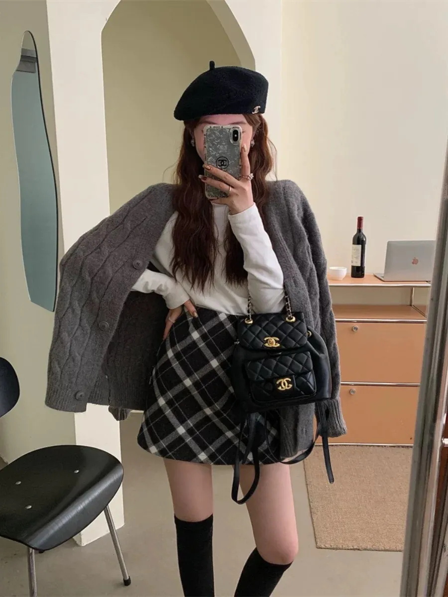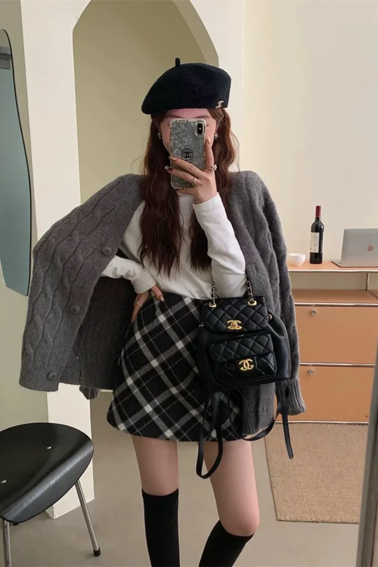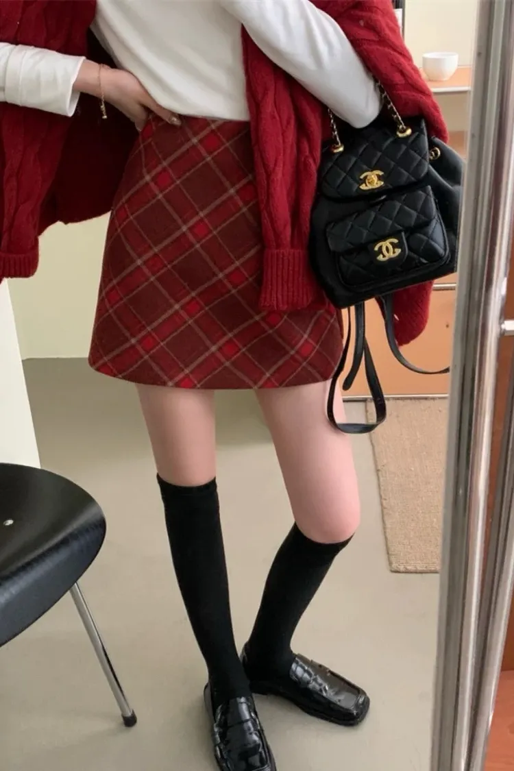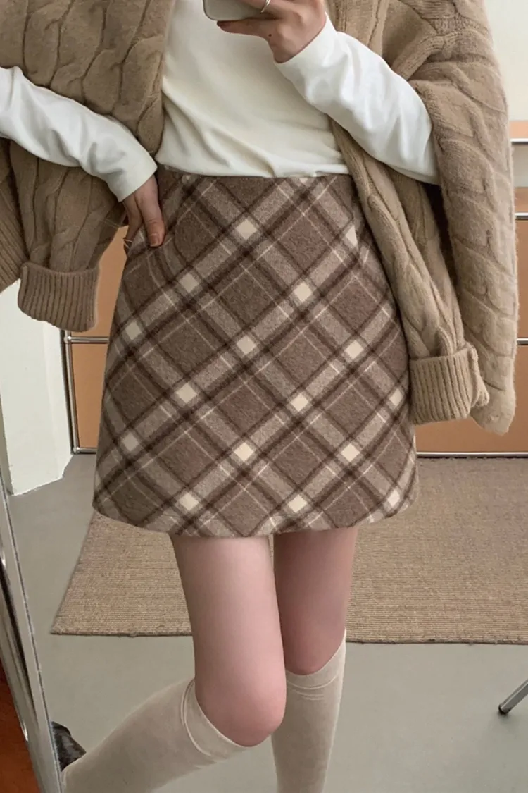秋冬毛呢格紋百搭A字短裙