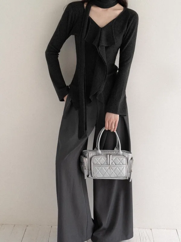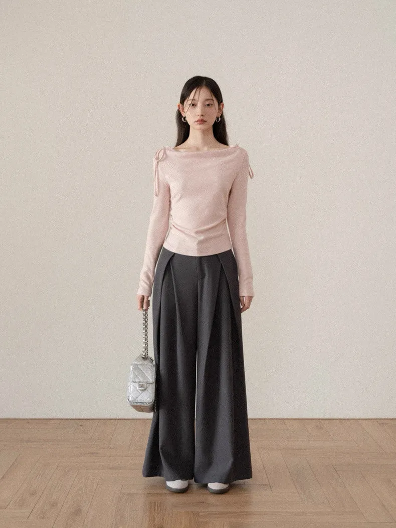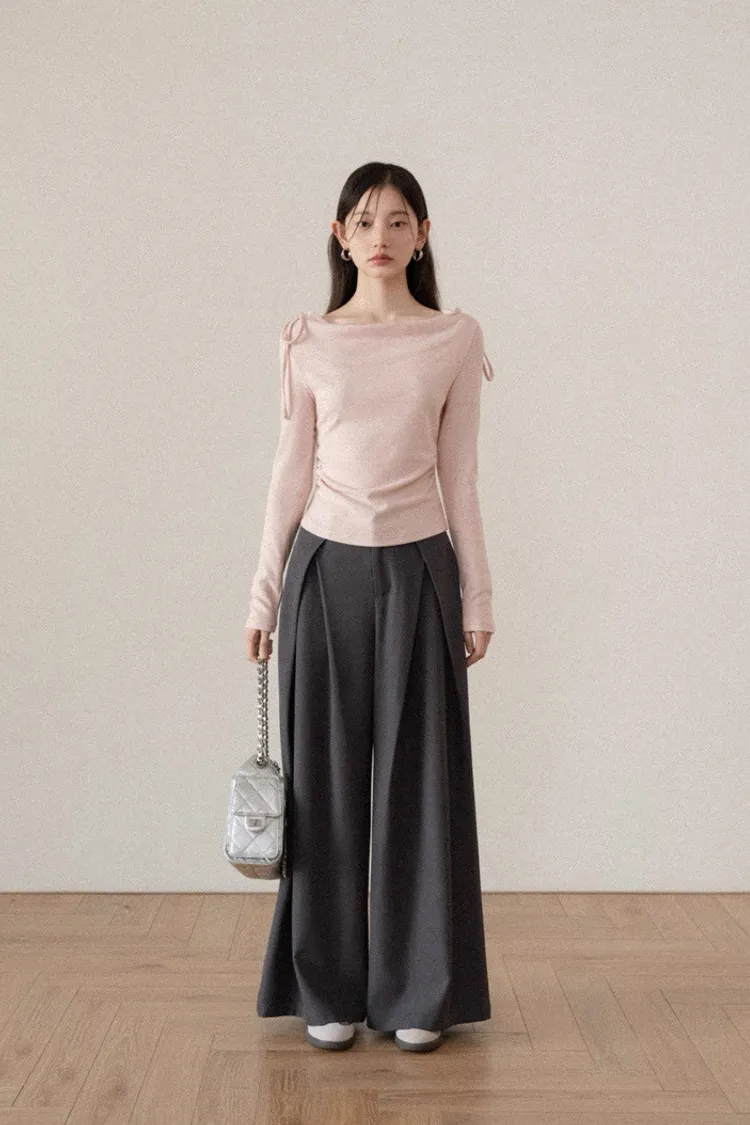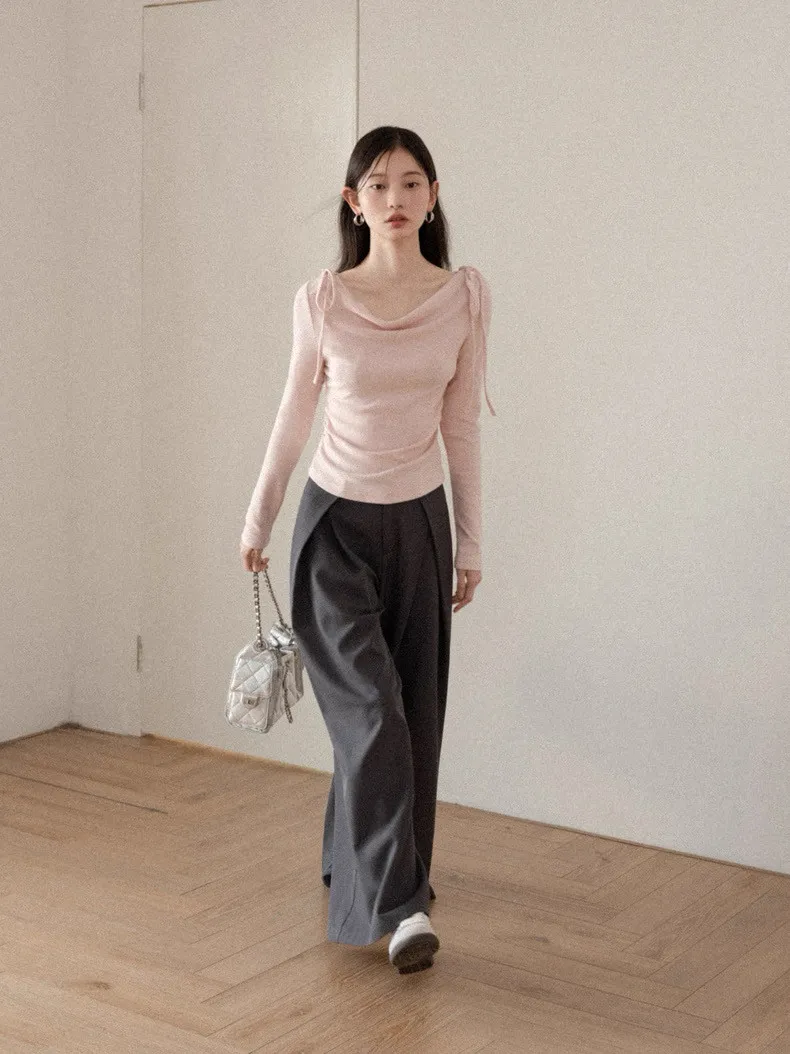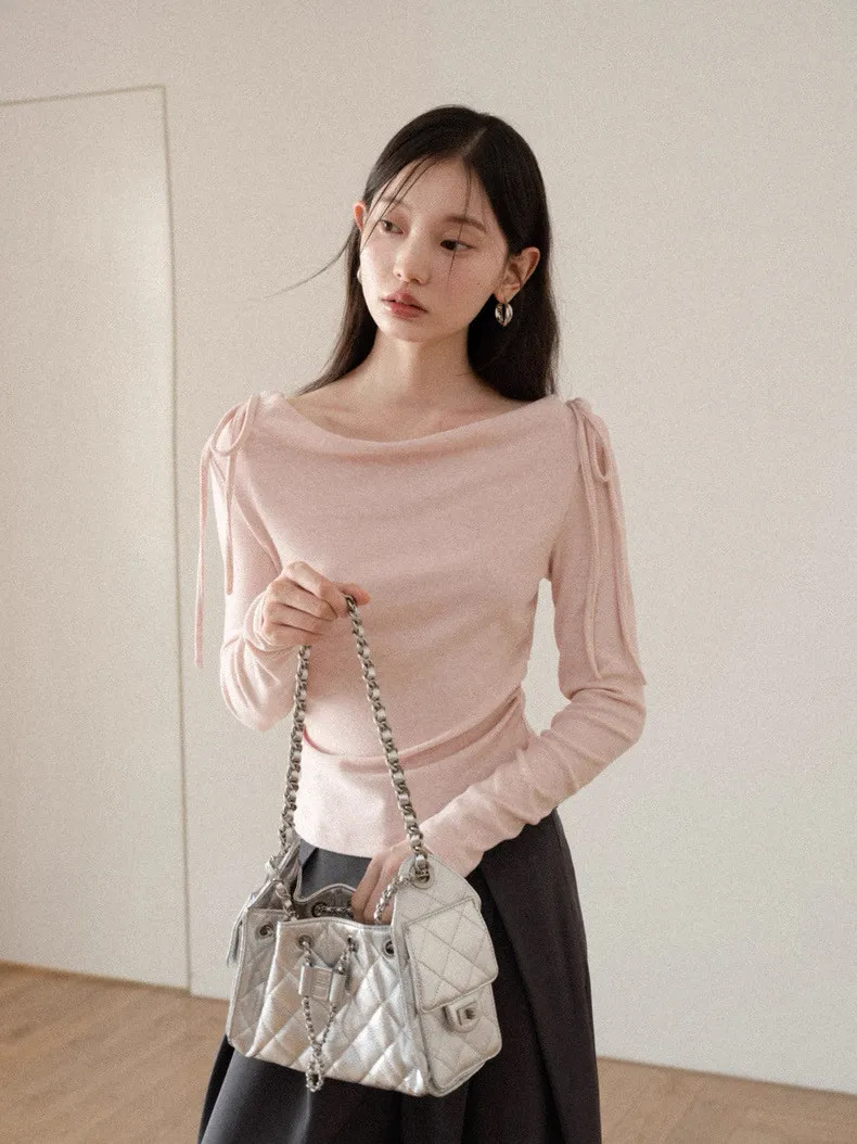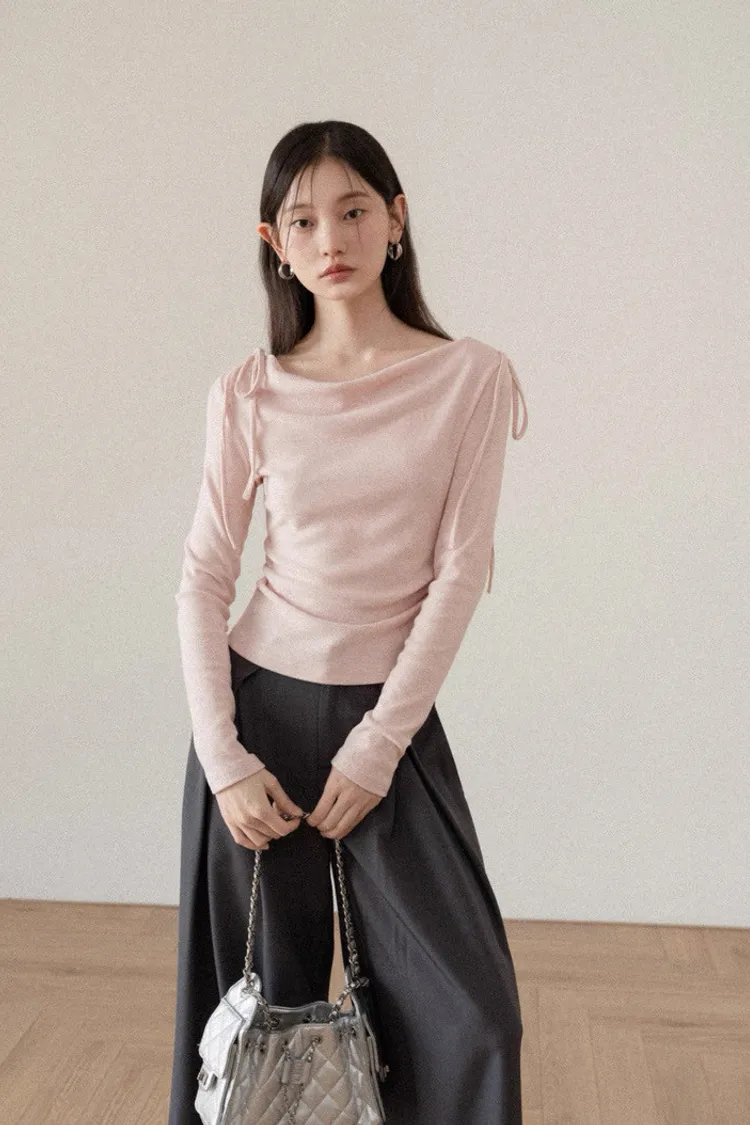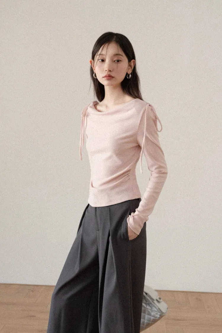 韓系溫柔粉色長袖綁帶棉T