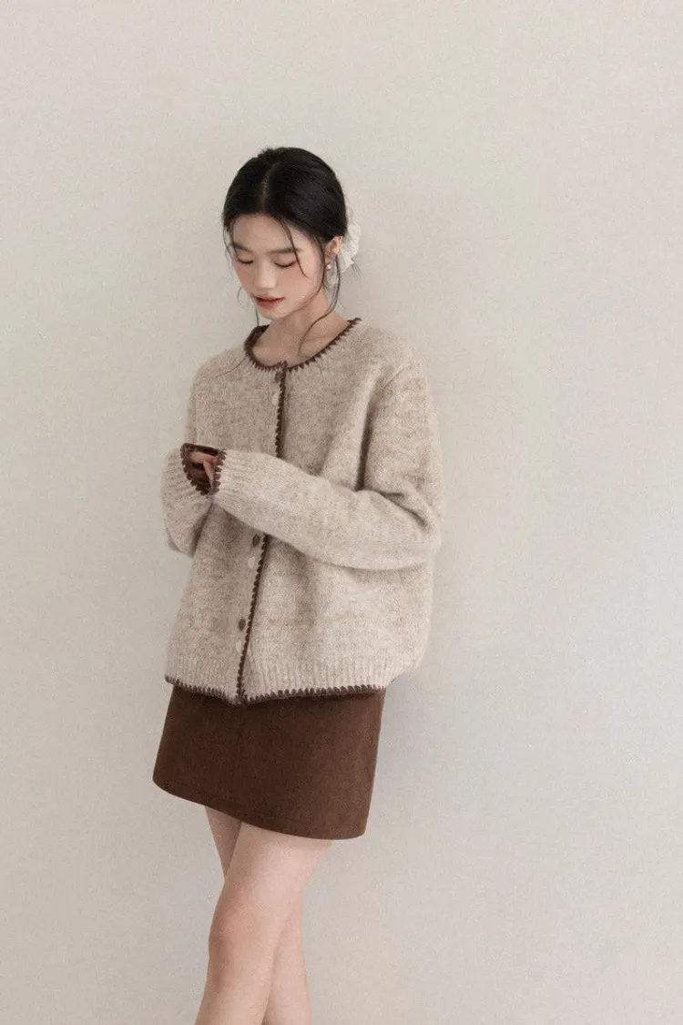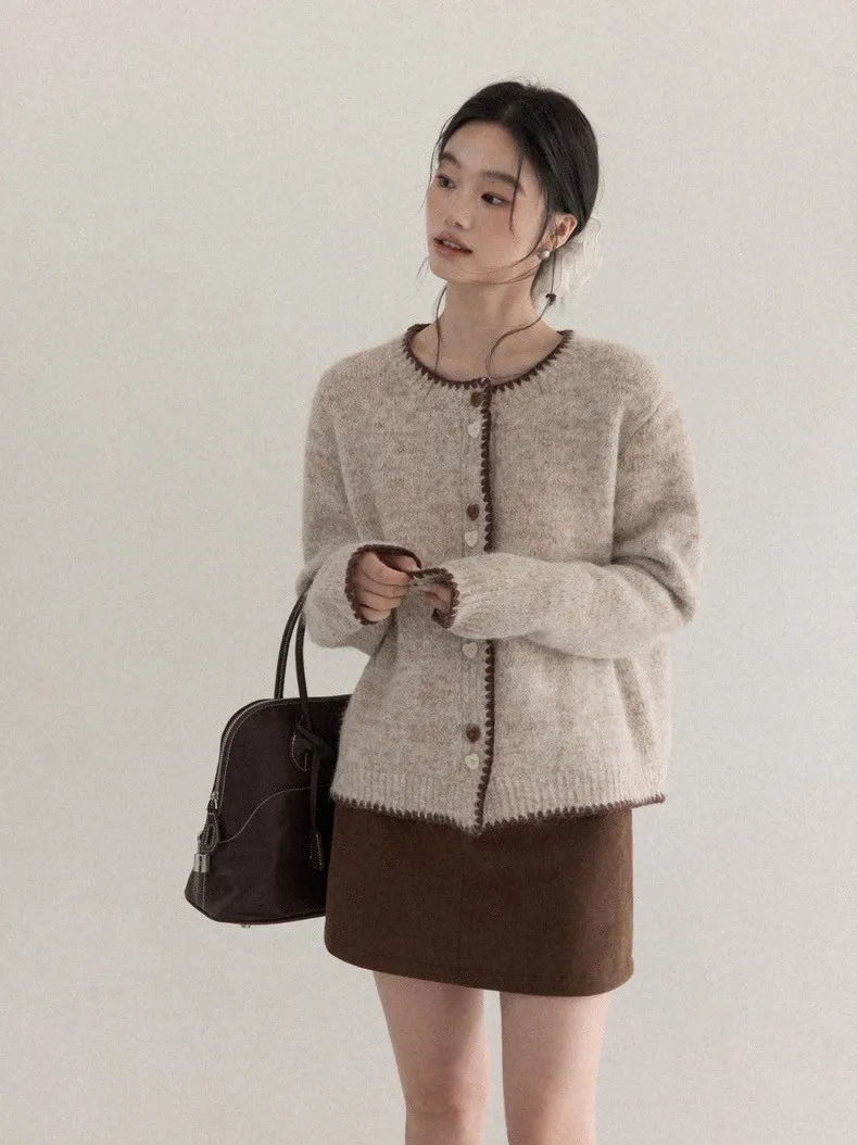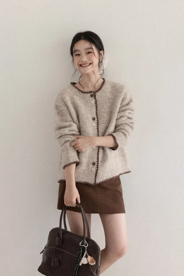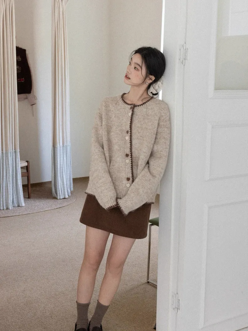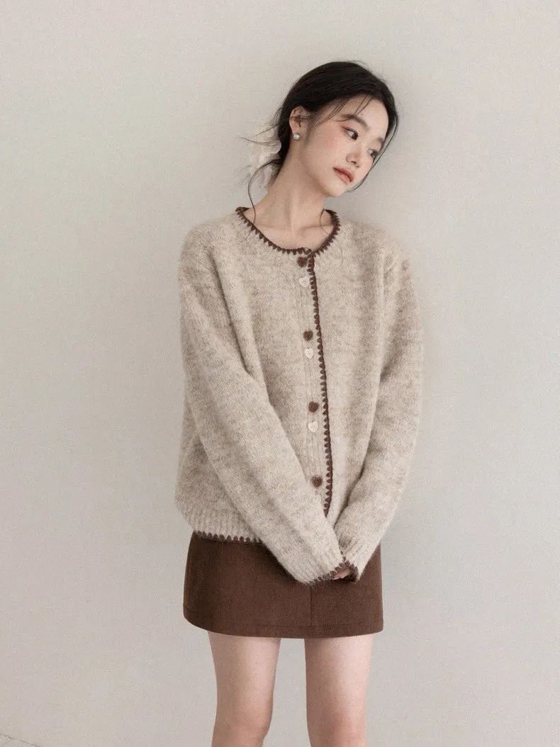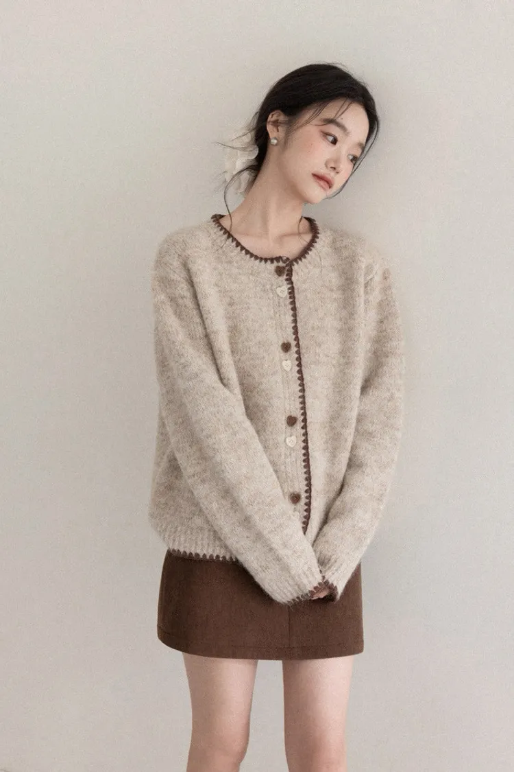 慵懶風卡其甜美愛心釦針織開衫