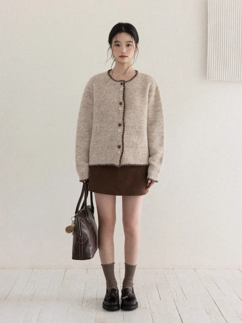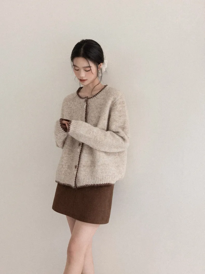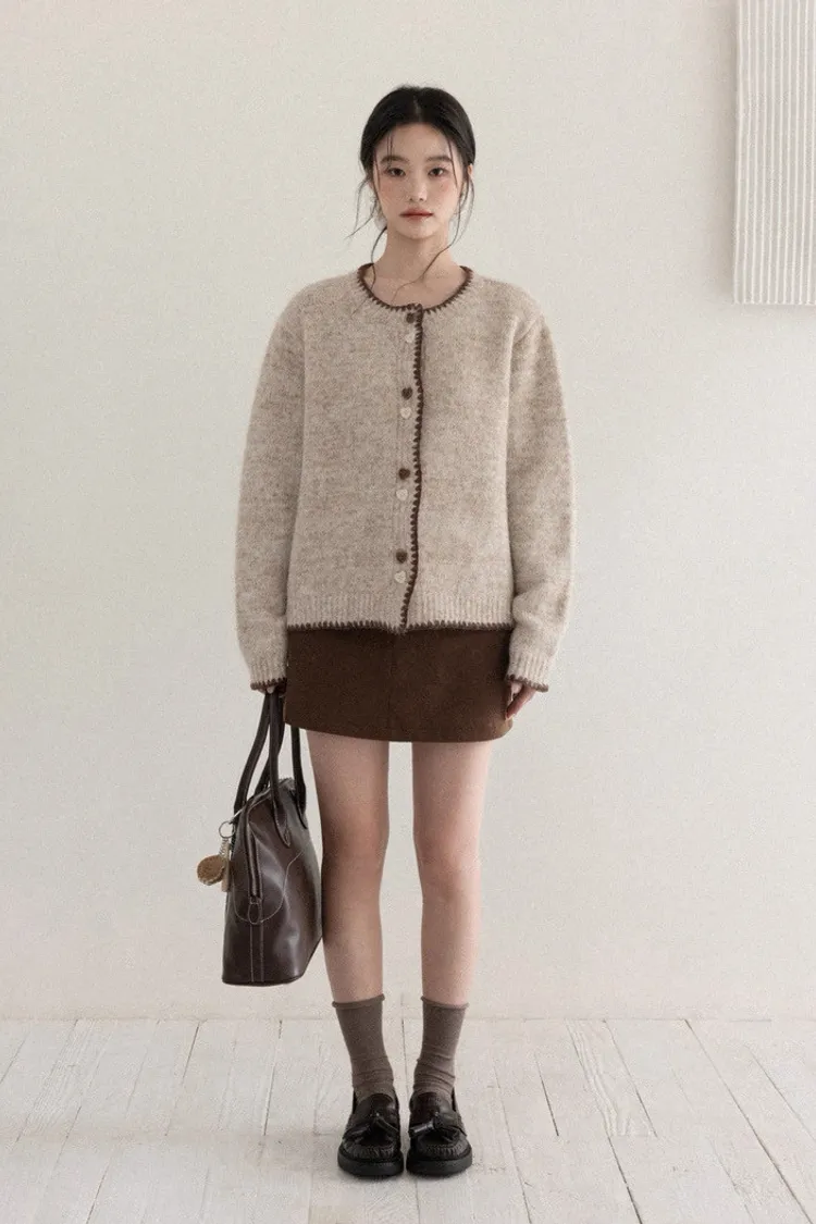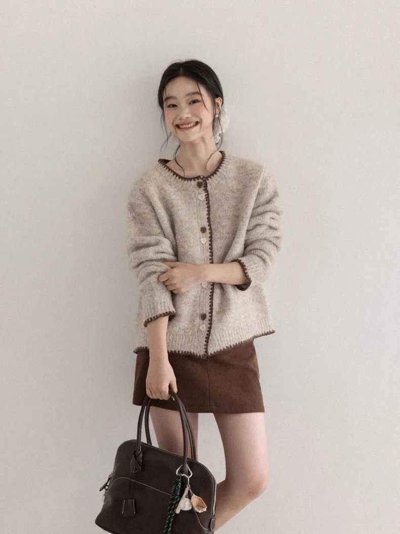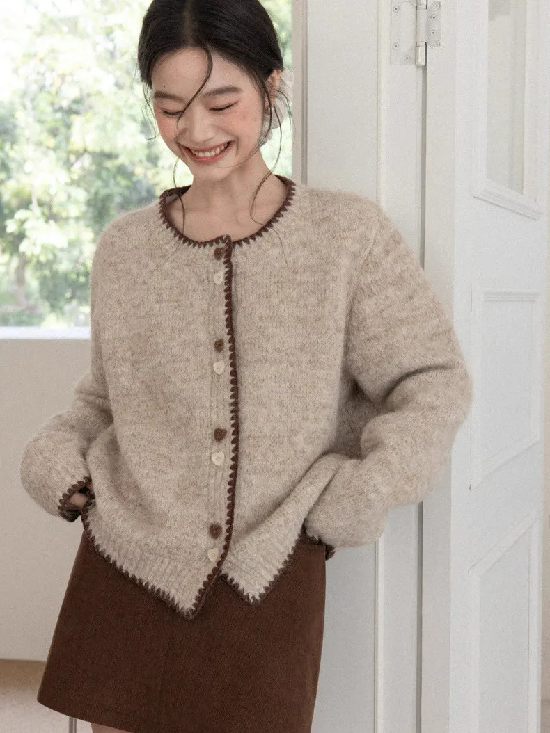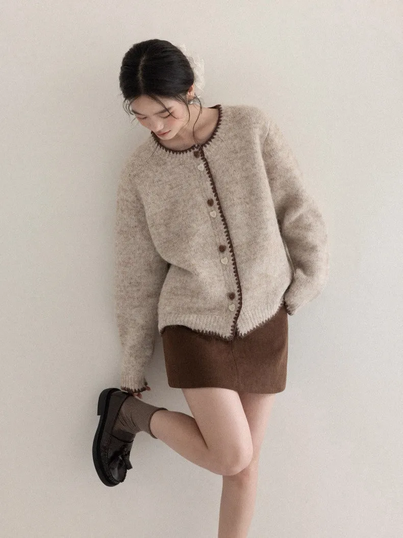慵懶風卡其甜美愛心釦針織開衫