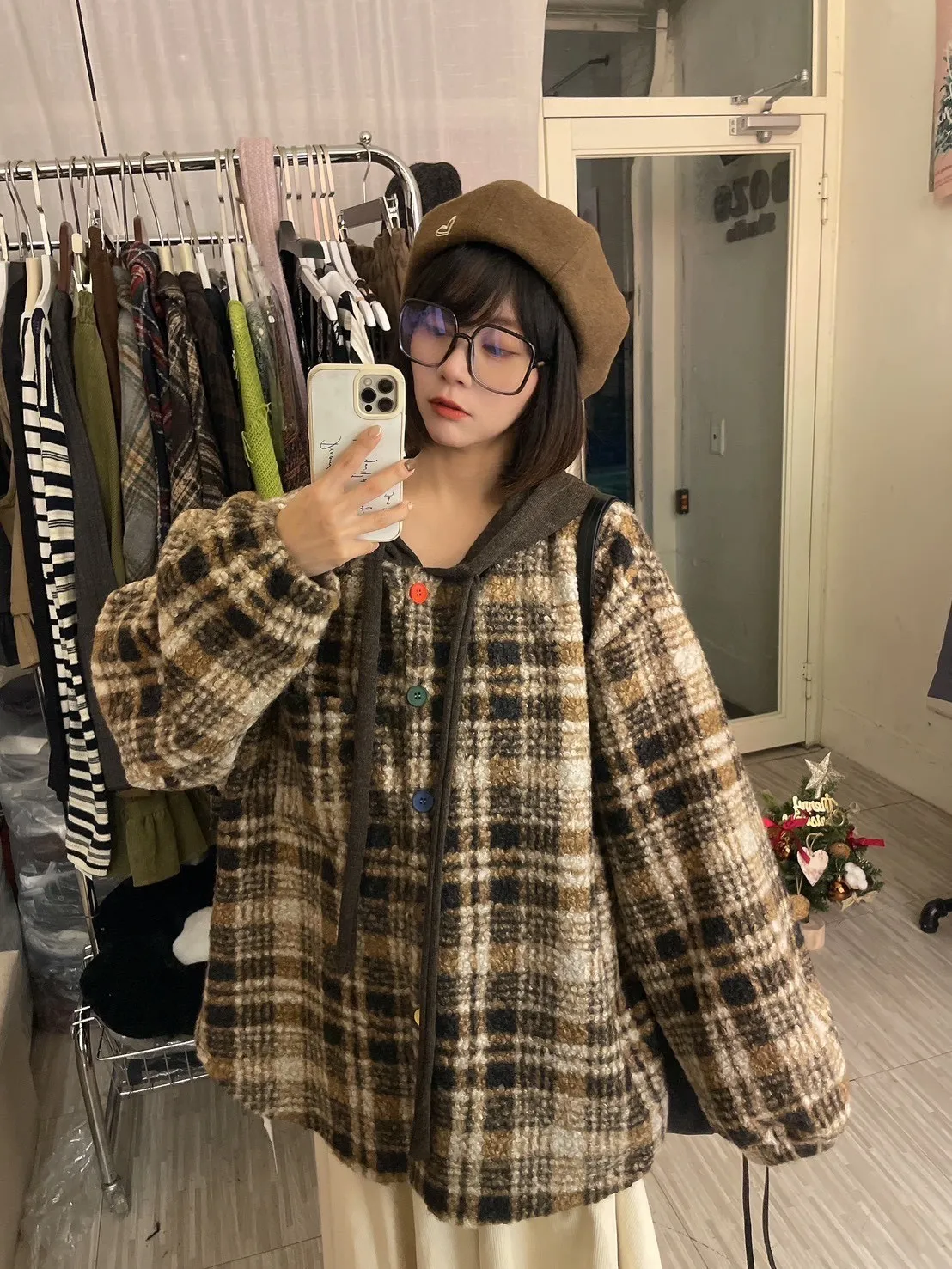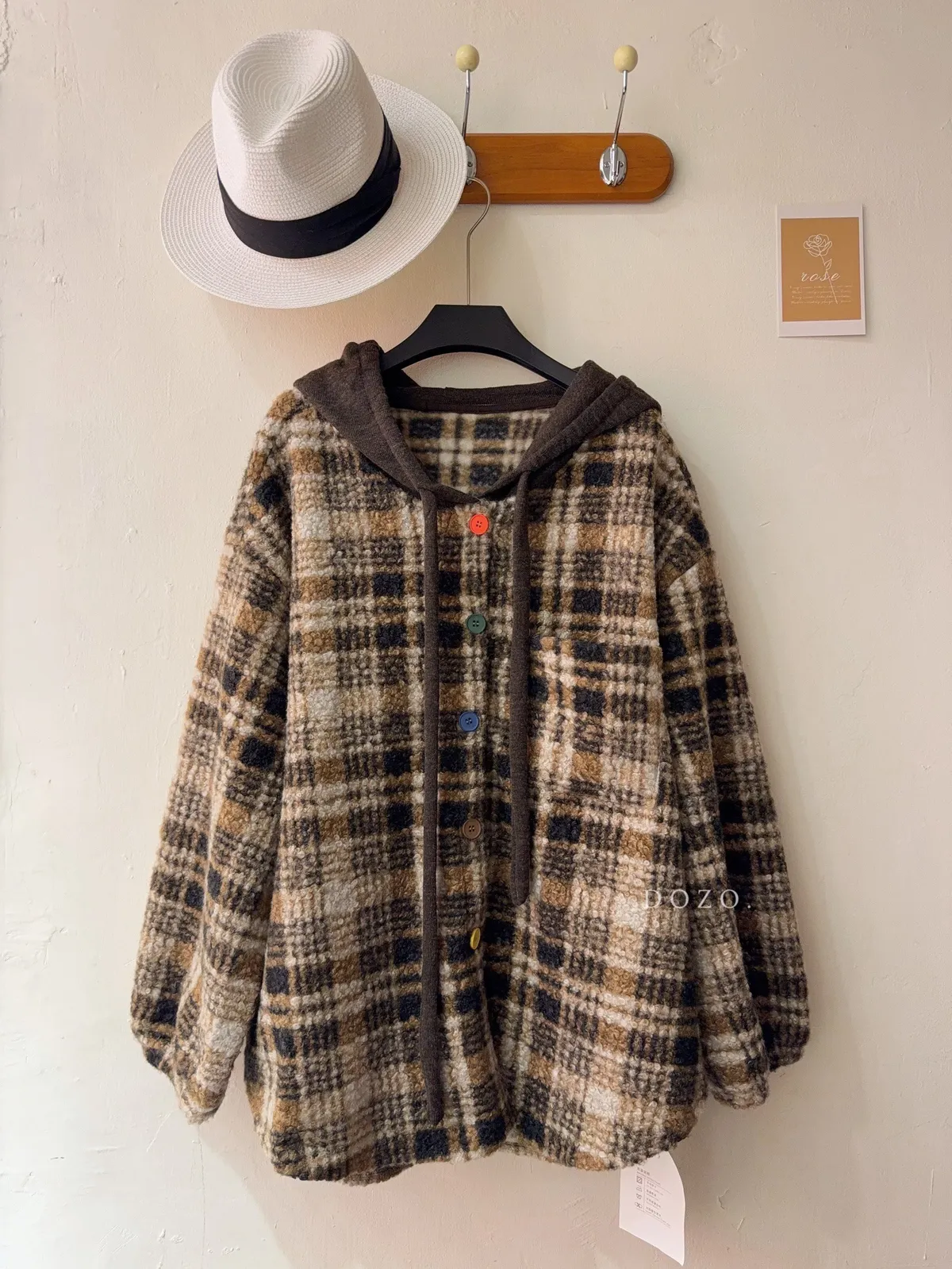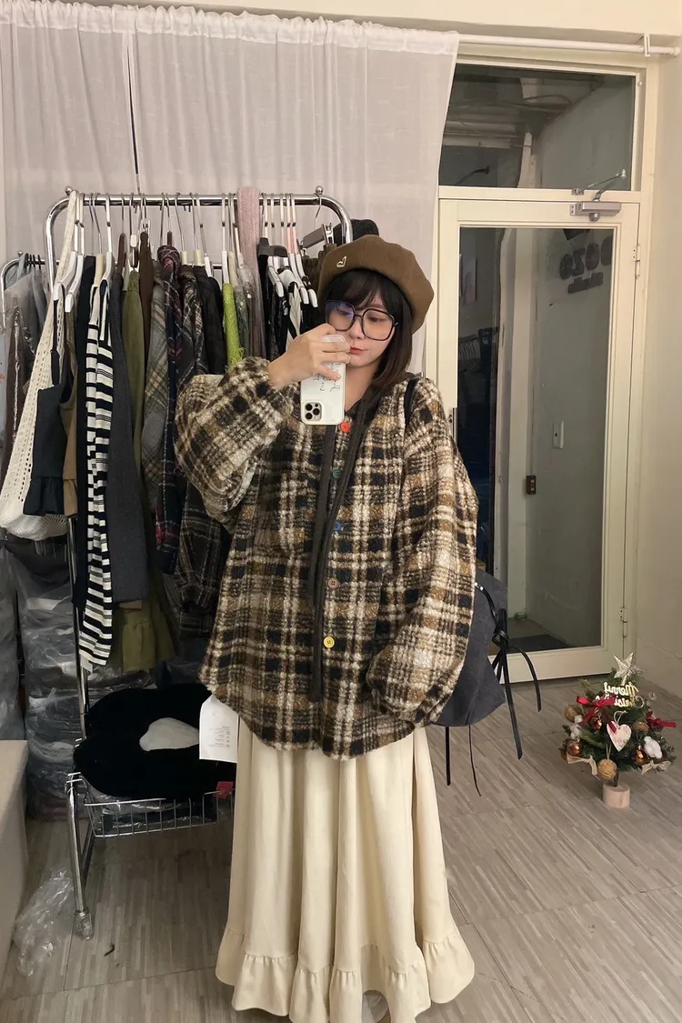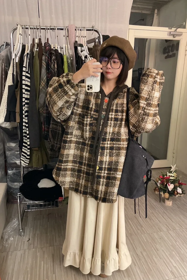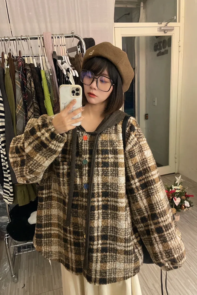 暖冬街道日系彩釦連帽格紋外套