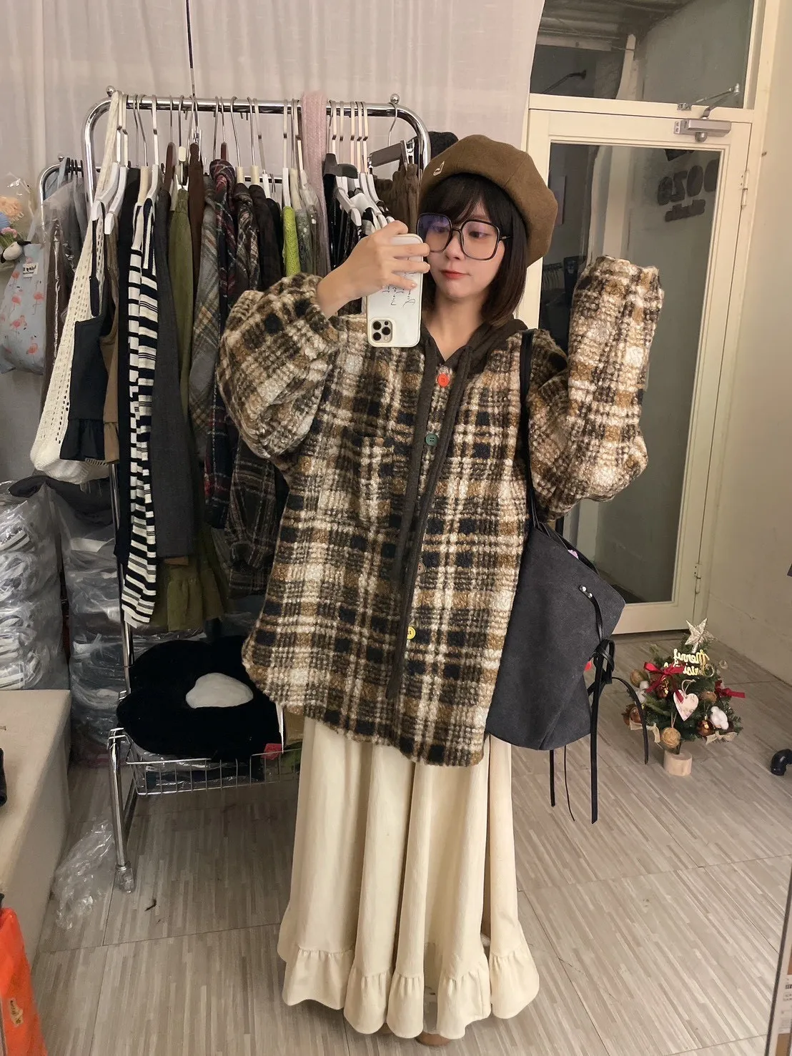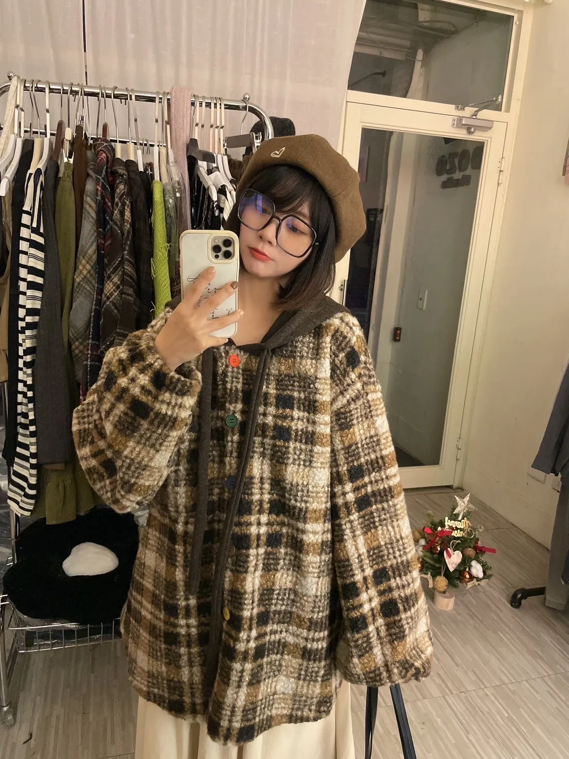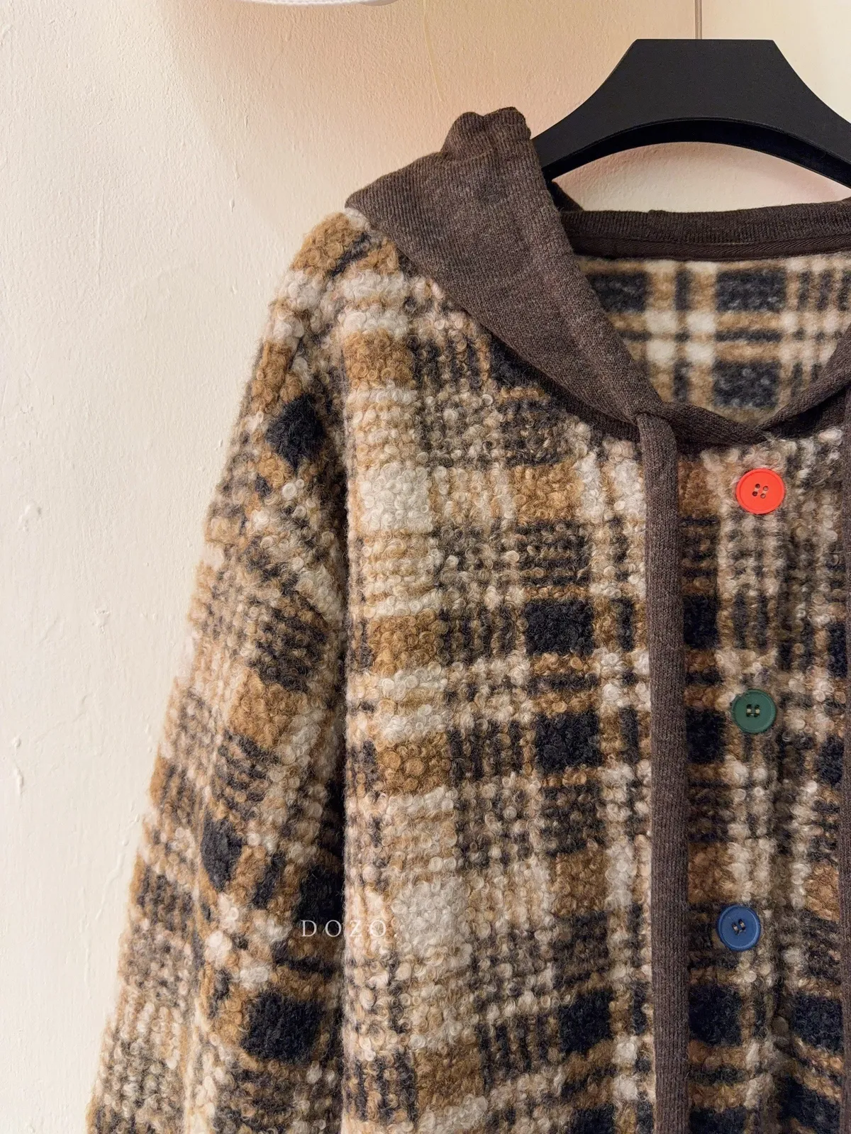 暖冬街道日系彩釦連帽格紋外套