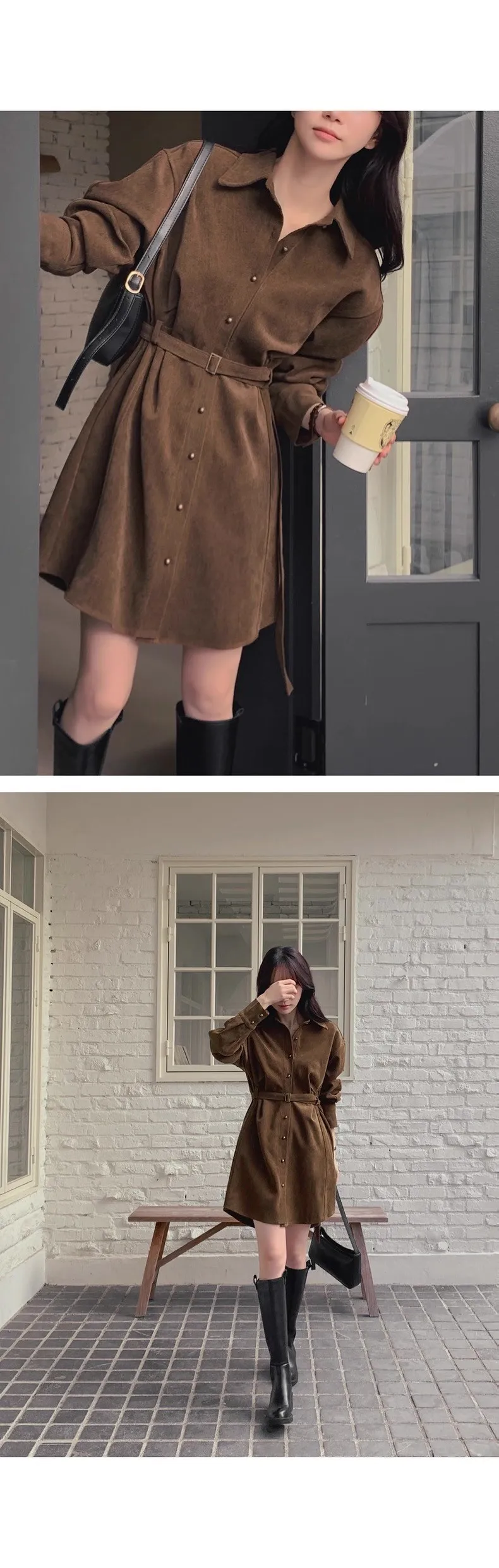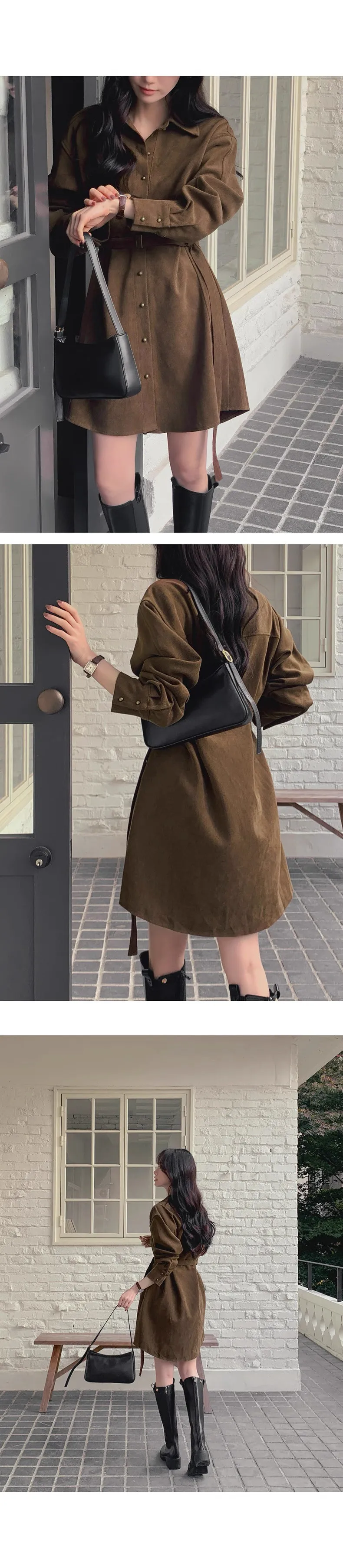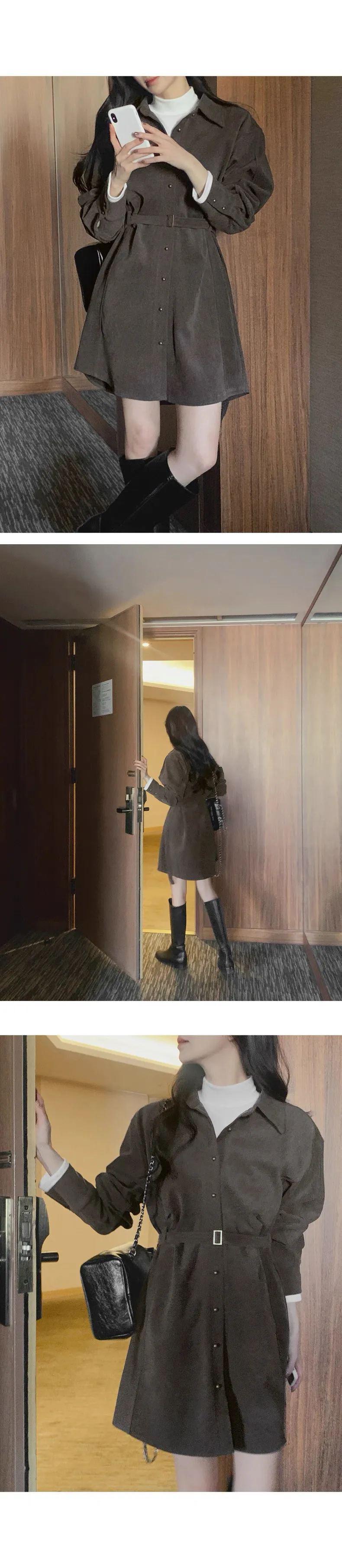 復古風翻領連身排釦連身裙(附皮帶)
