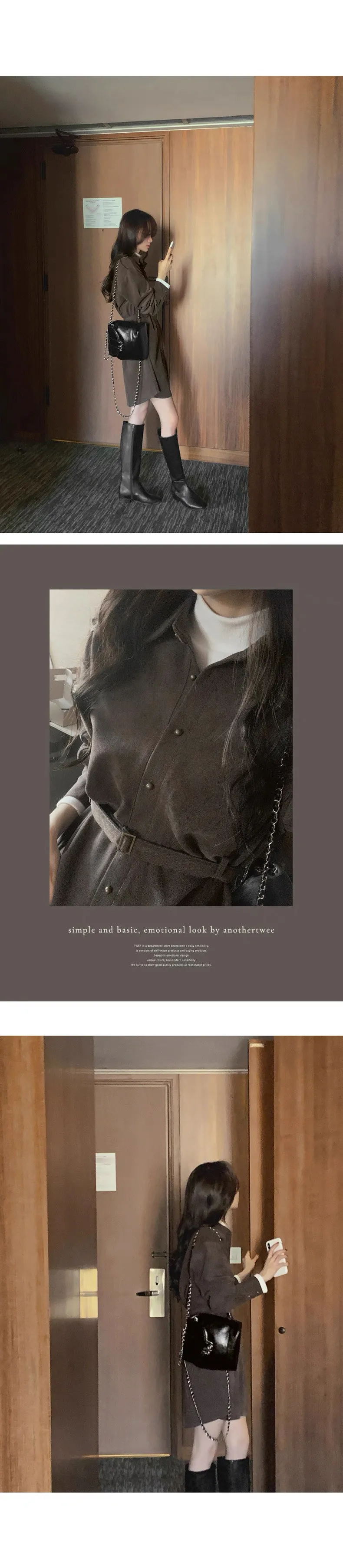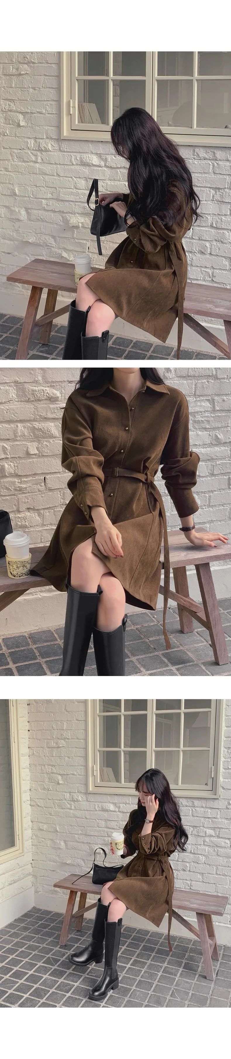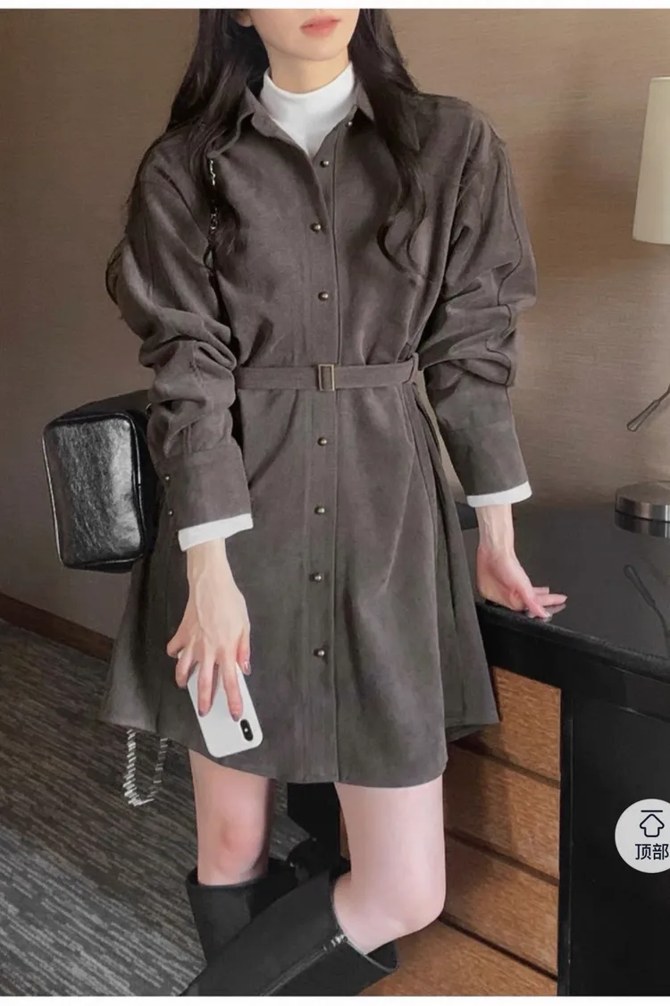 復古風翻領連身排釦連身裙(附皮帶)