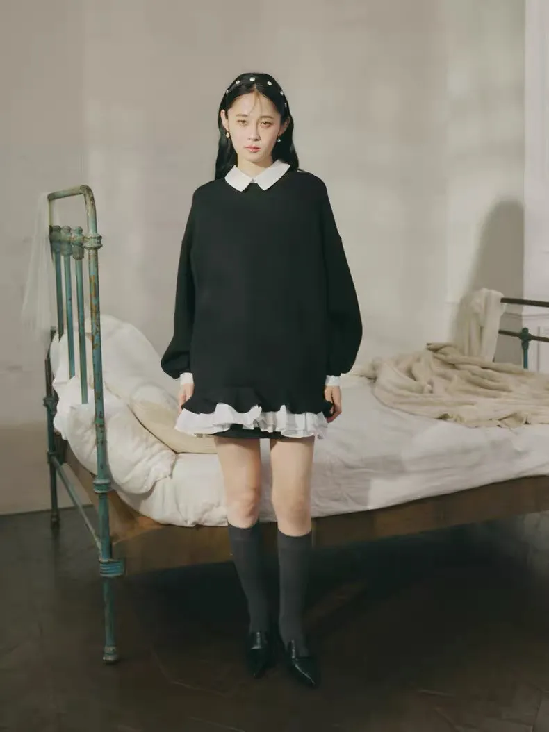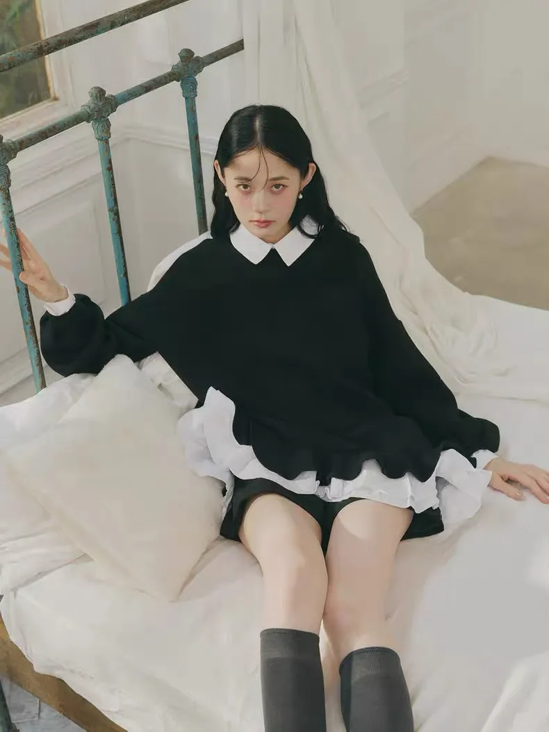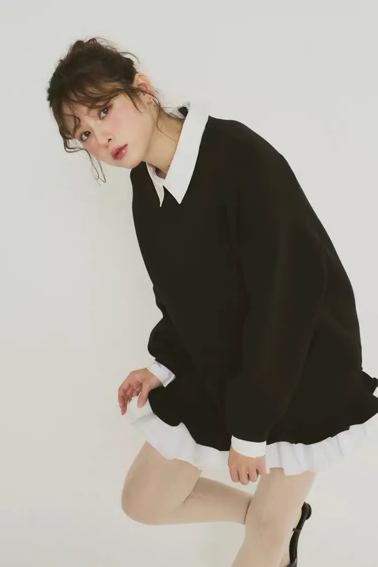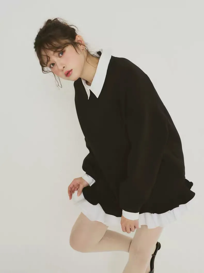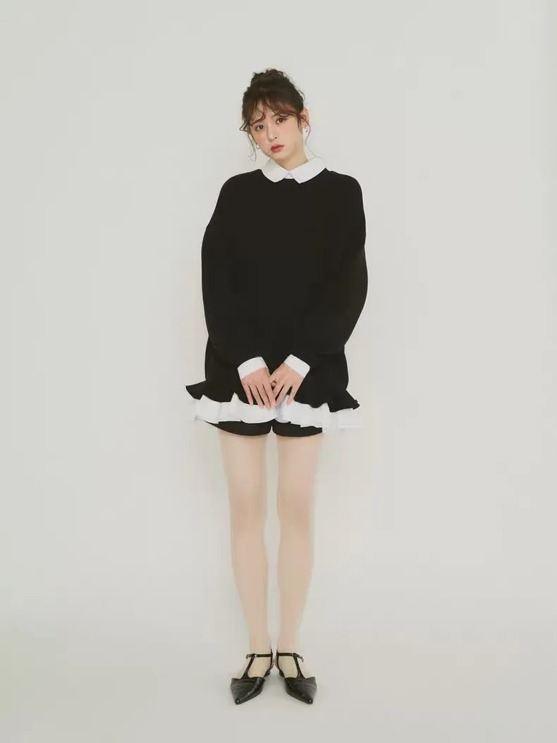 法式減齡撞色下擺蛋糕裙翻領上衣
