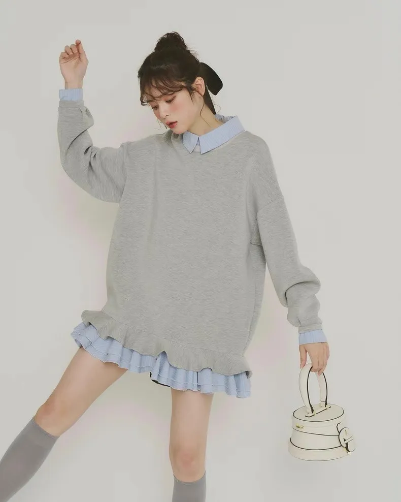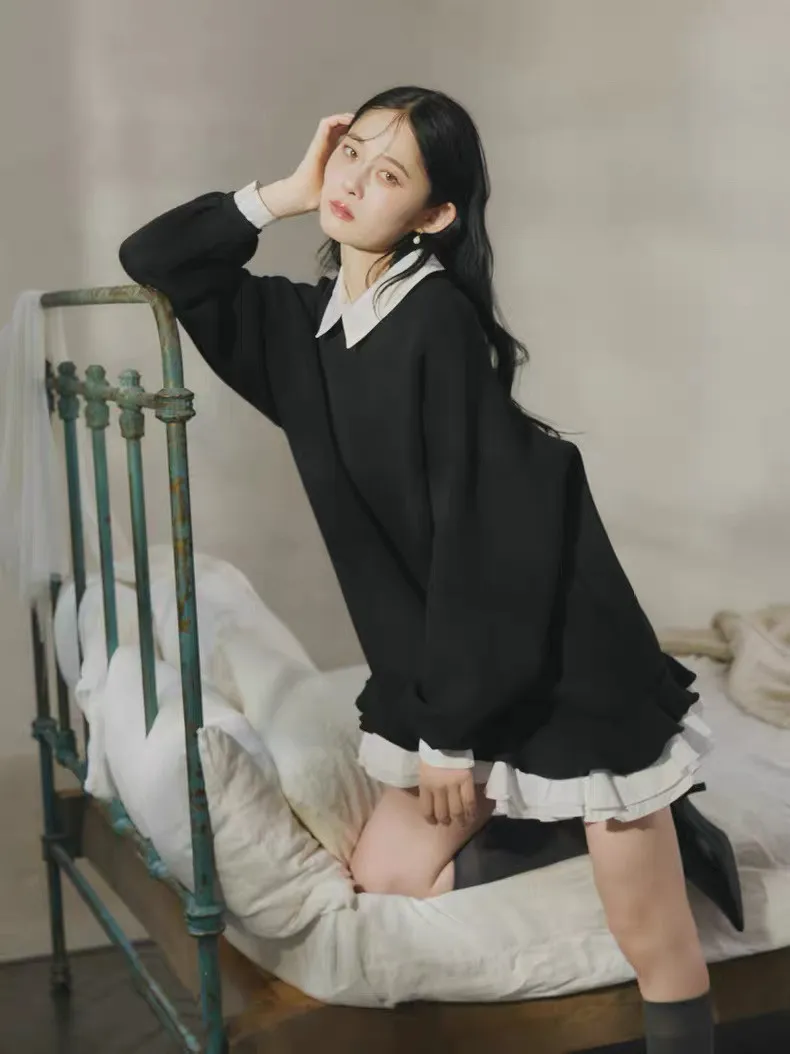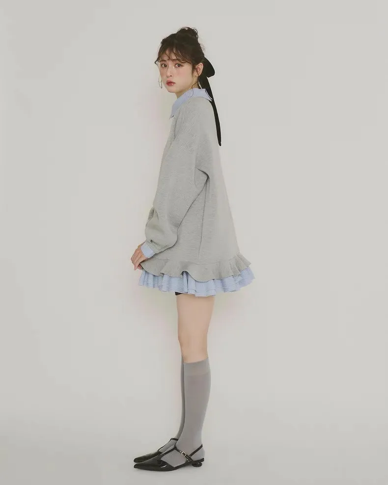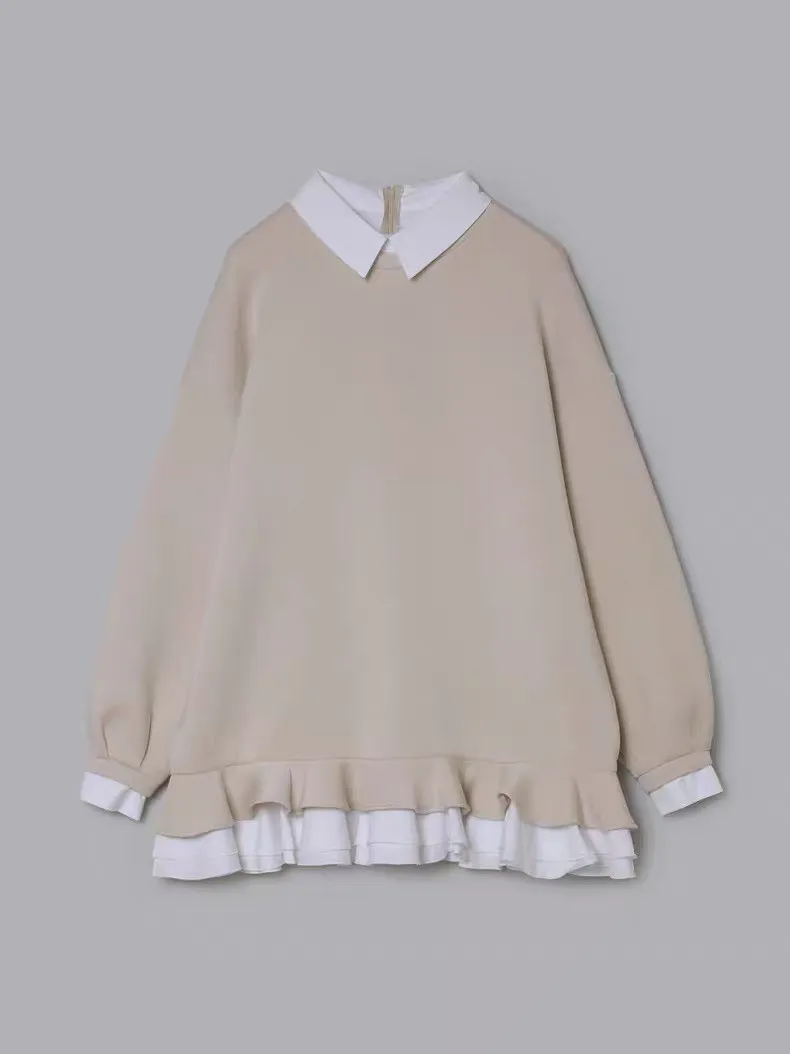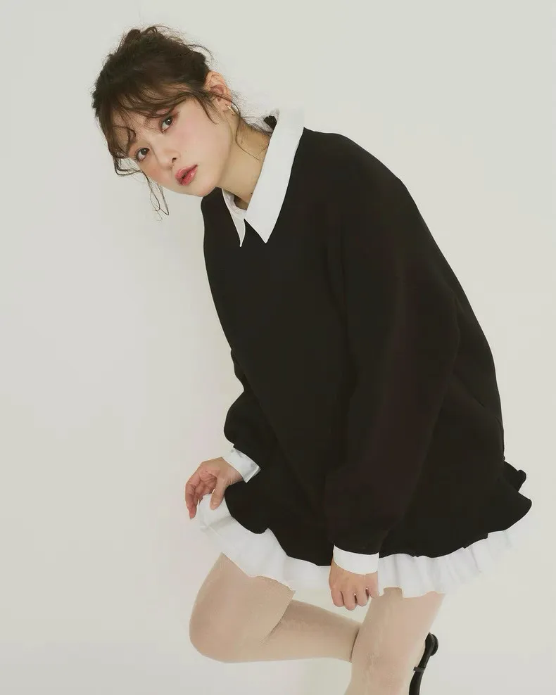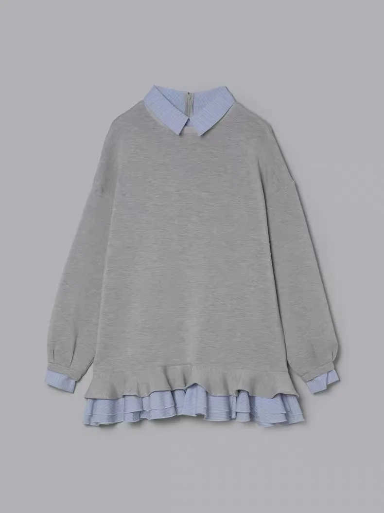 法式減齡撞色下擺蛋糕裙翻領上衣