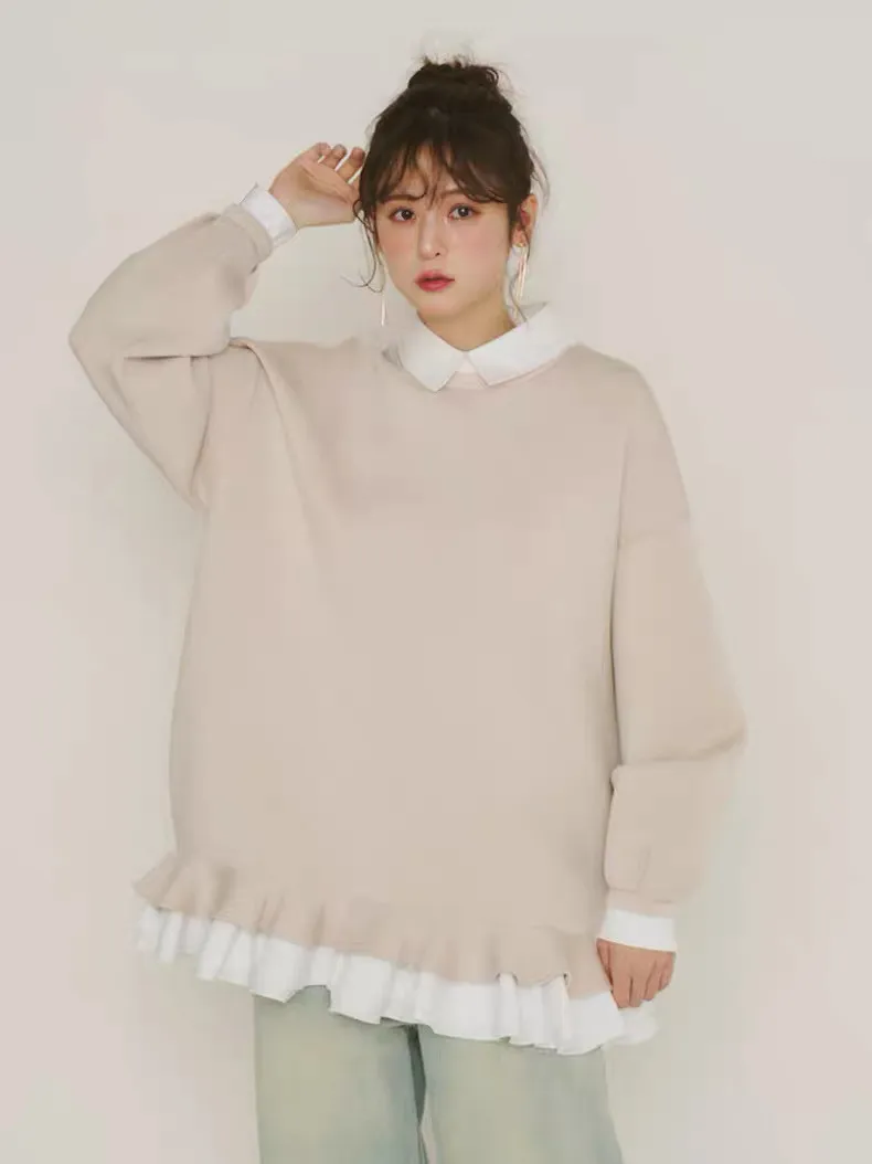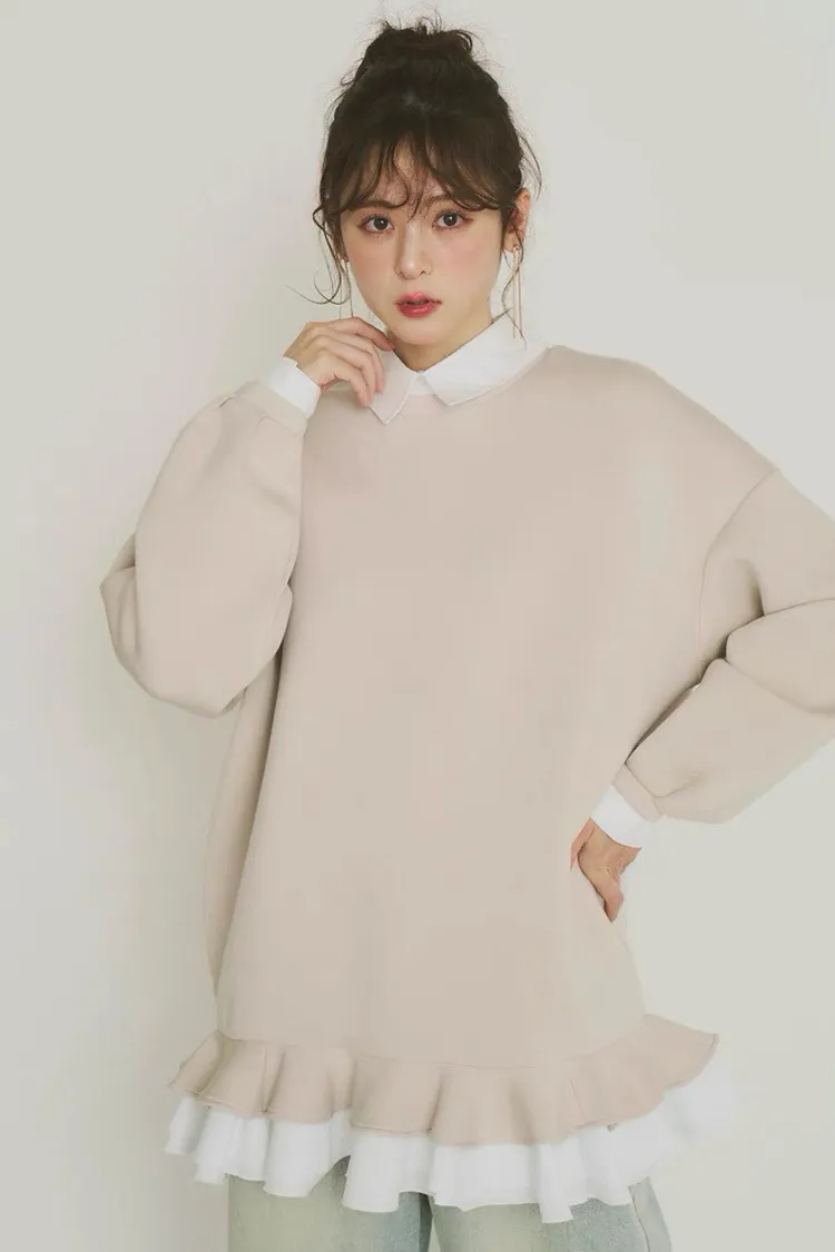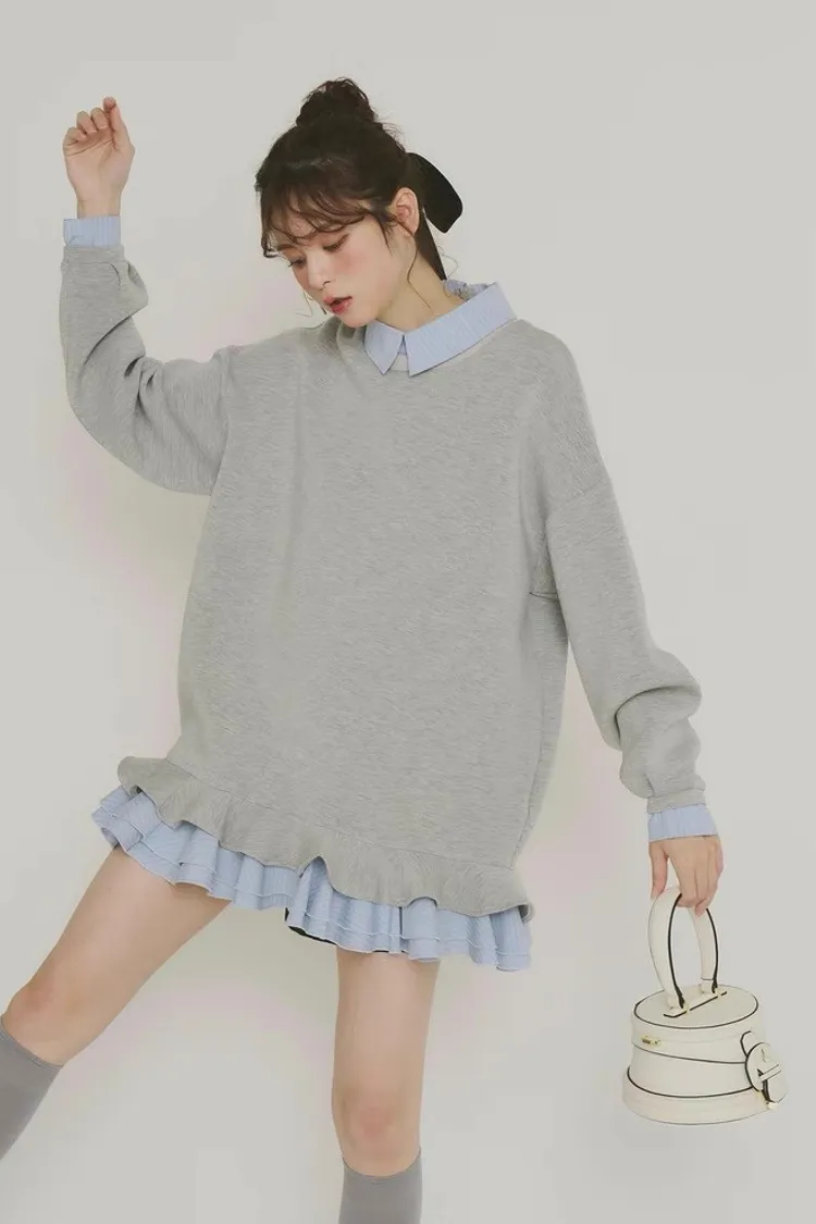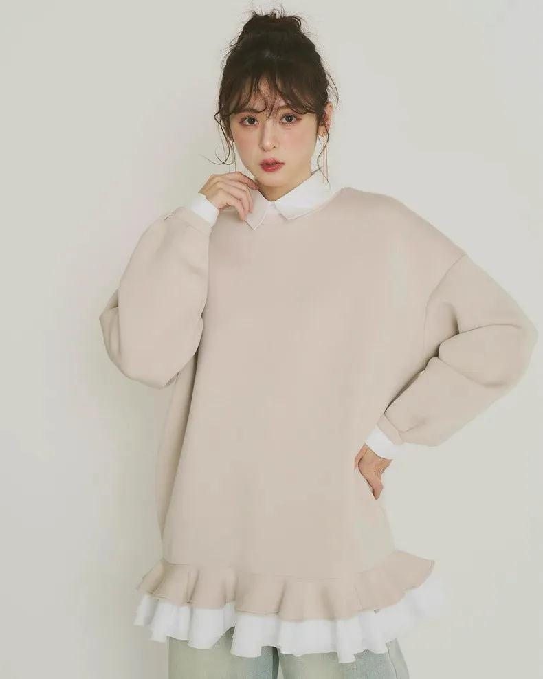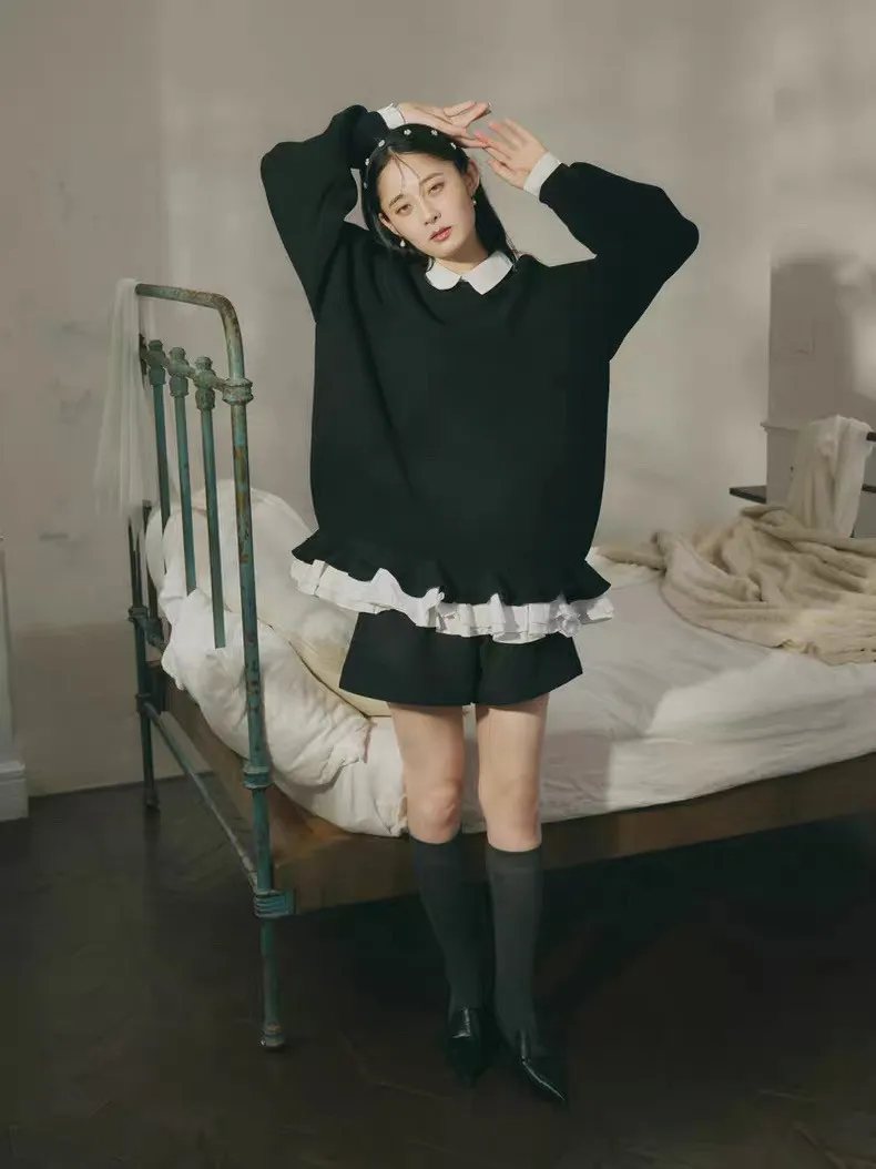 法式減齡撞色下擺蛋糕裙翻領上衣
