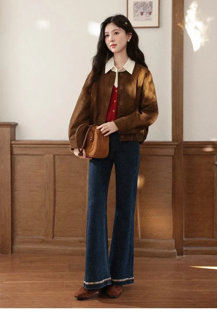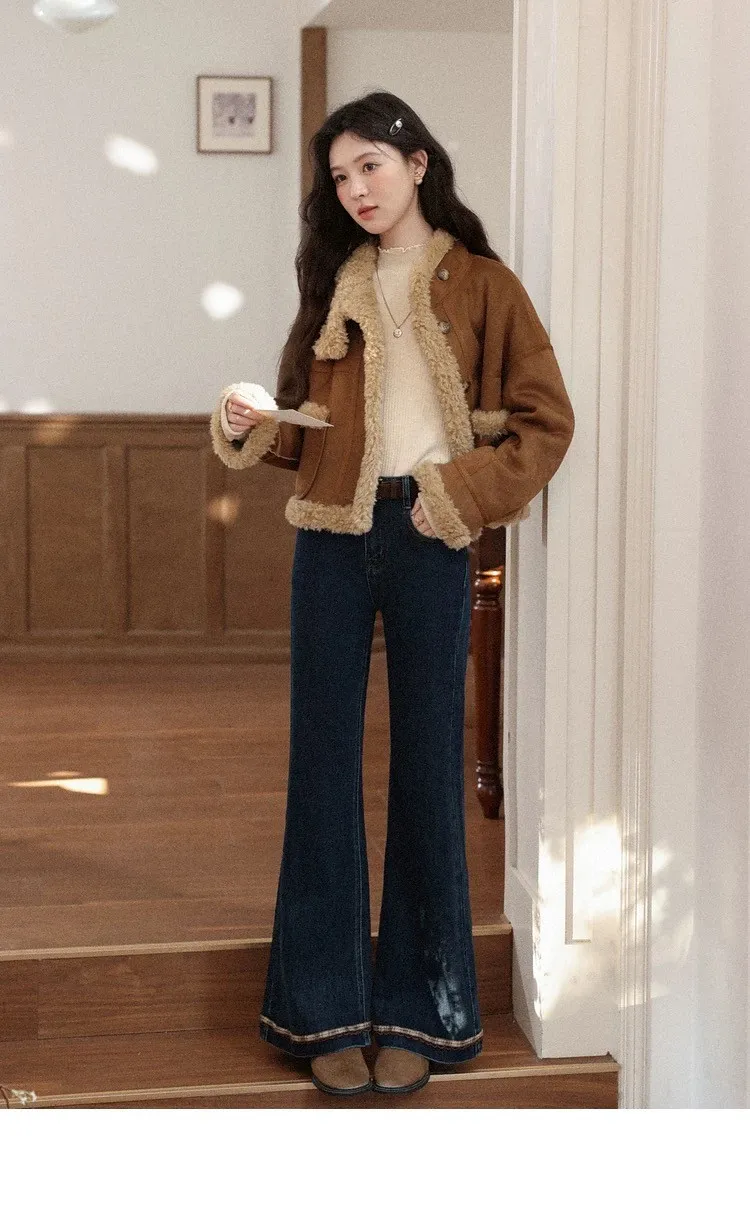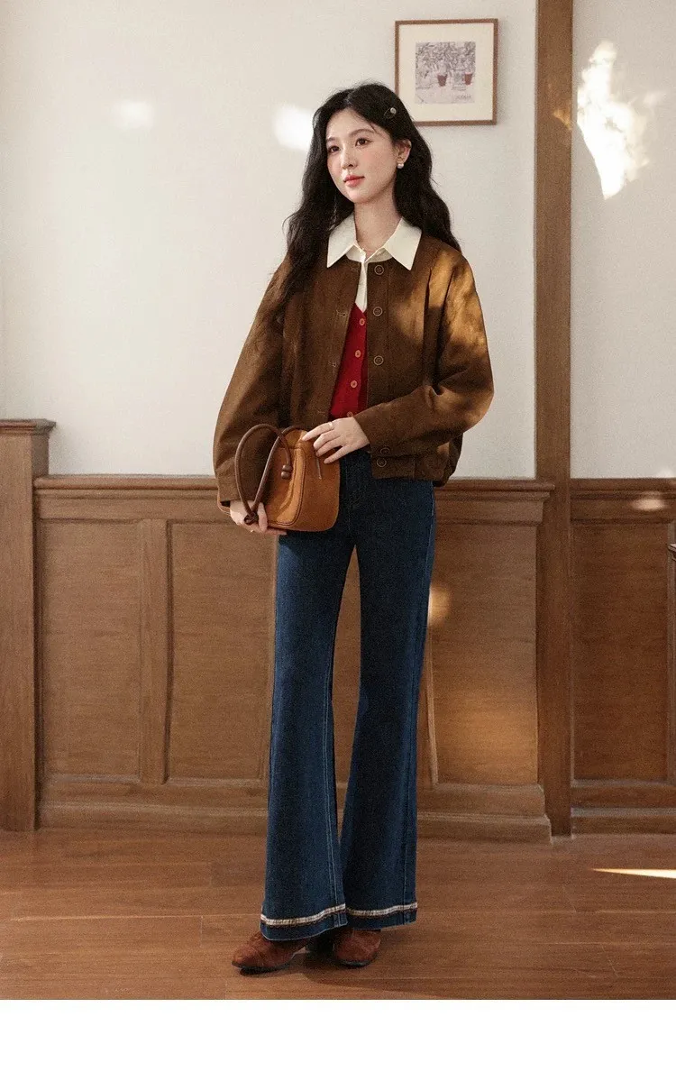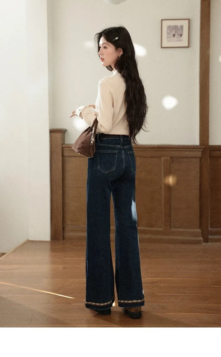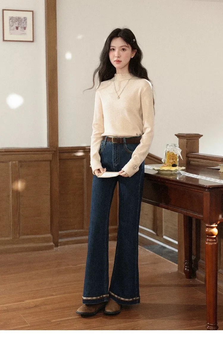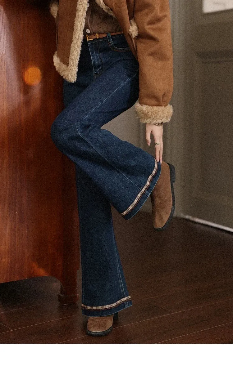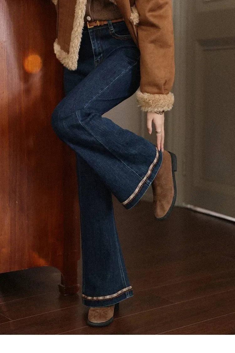 復古感格紋刺繡花邊小眾設計微喇叭褲