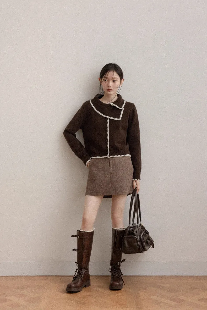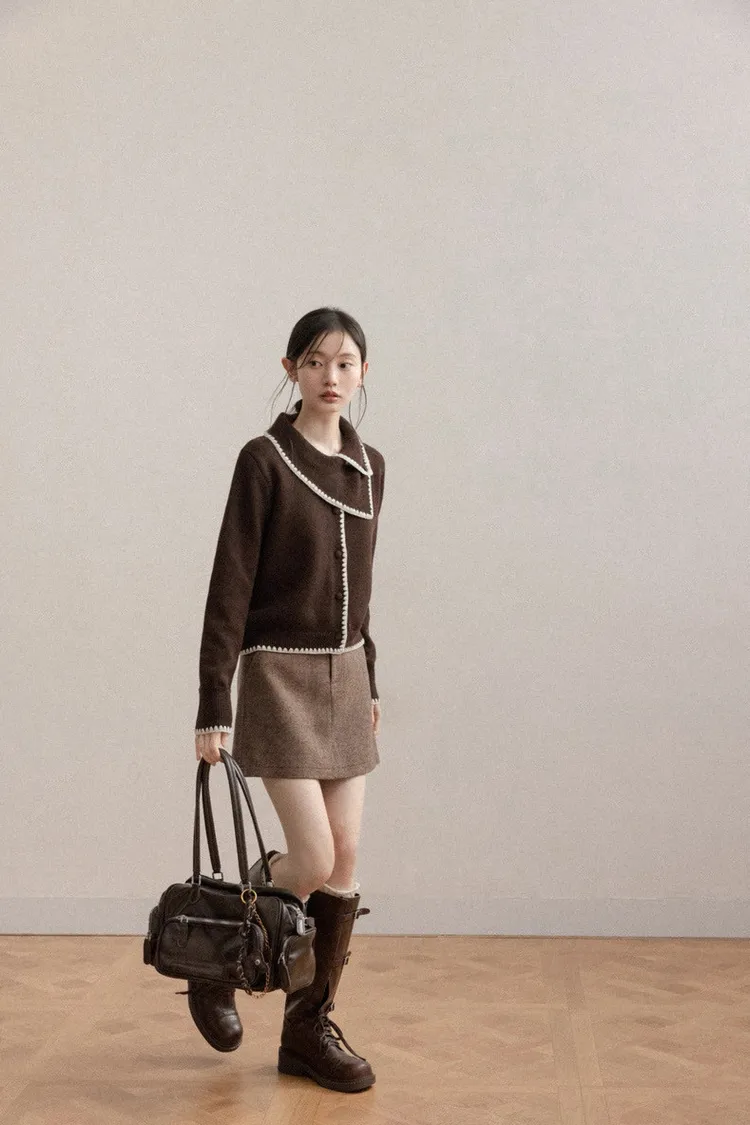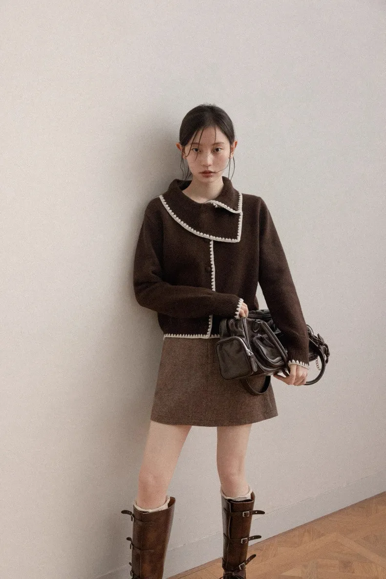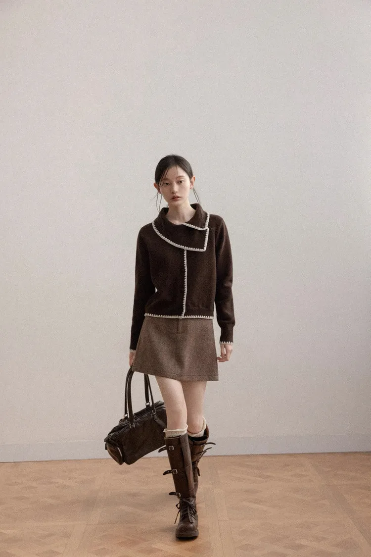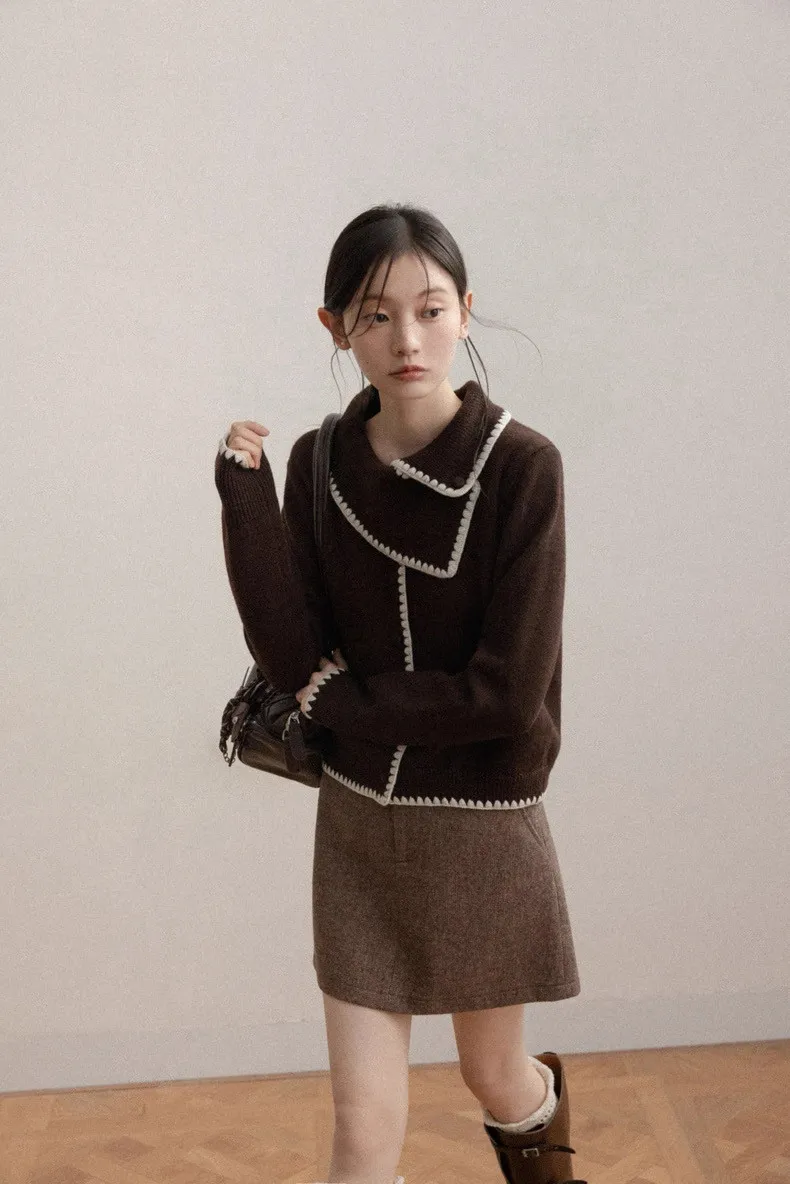 美拉德復古滾邊緹花撞色設計大領針織上衣