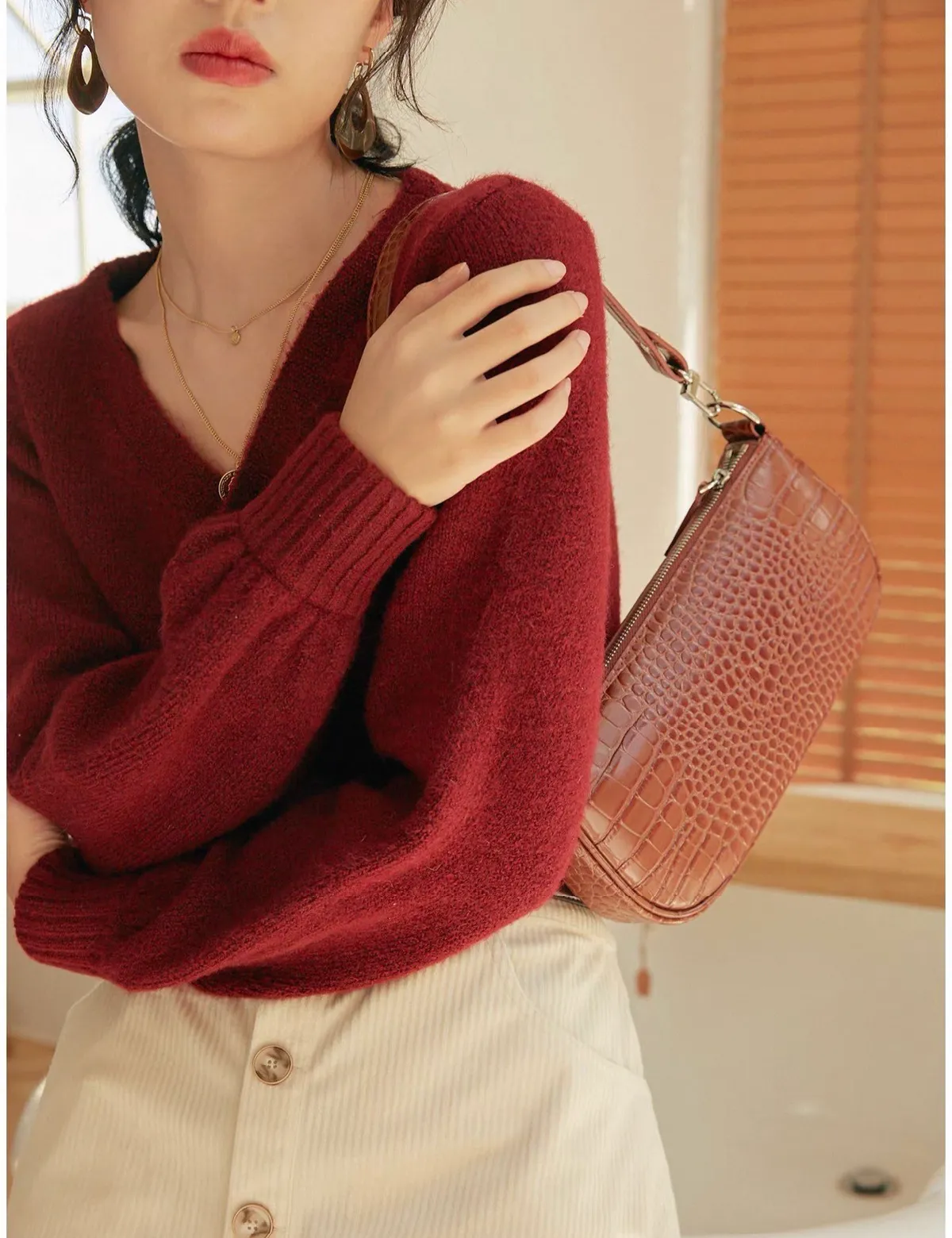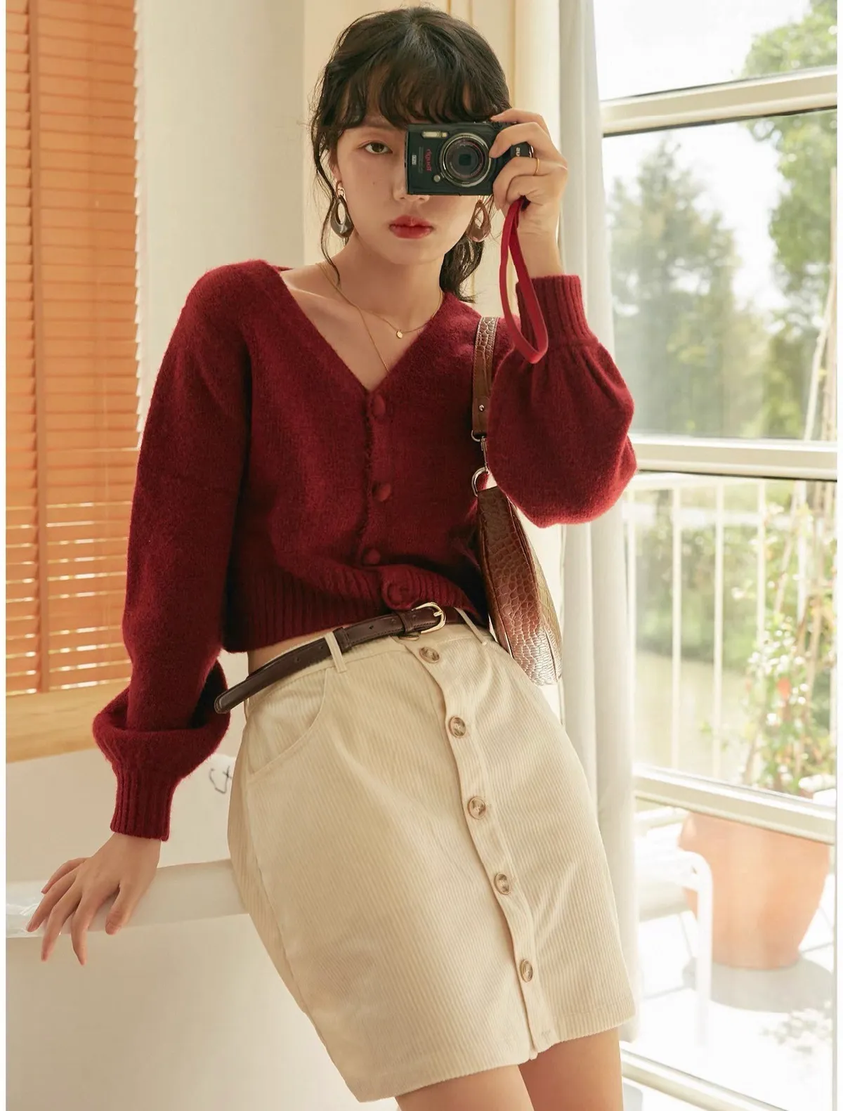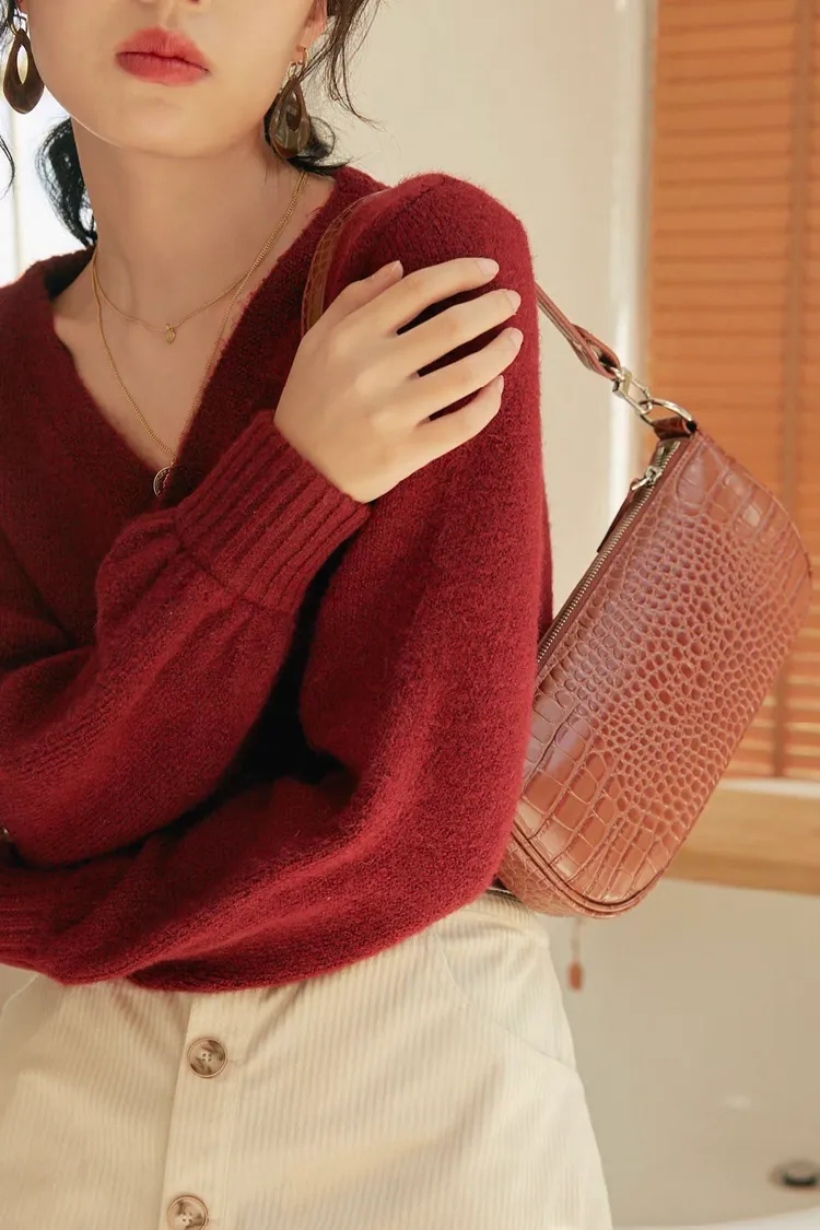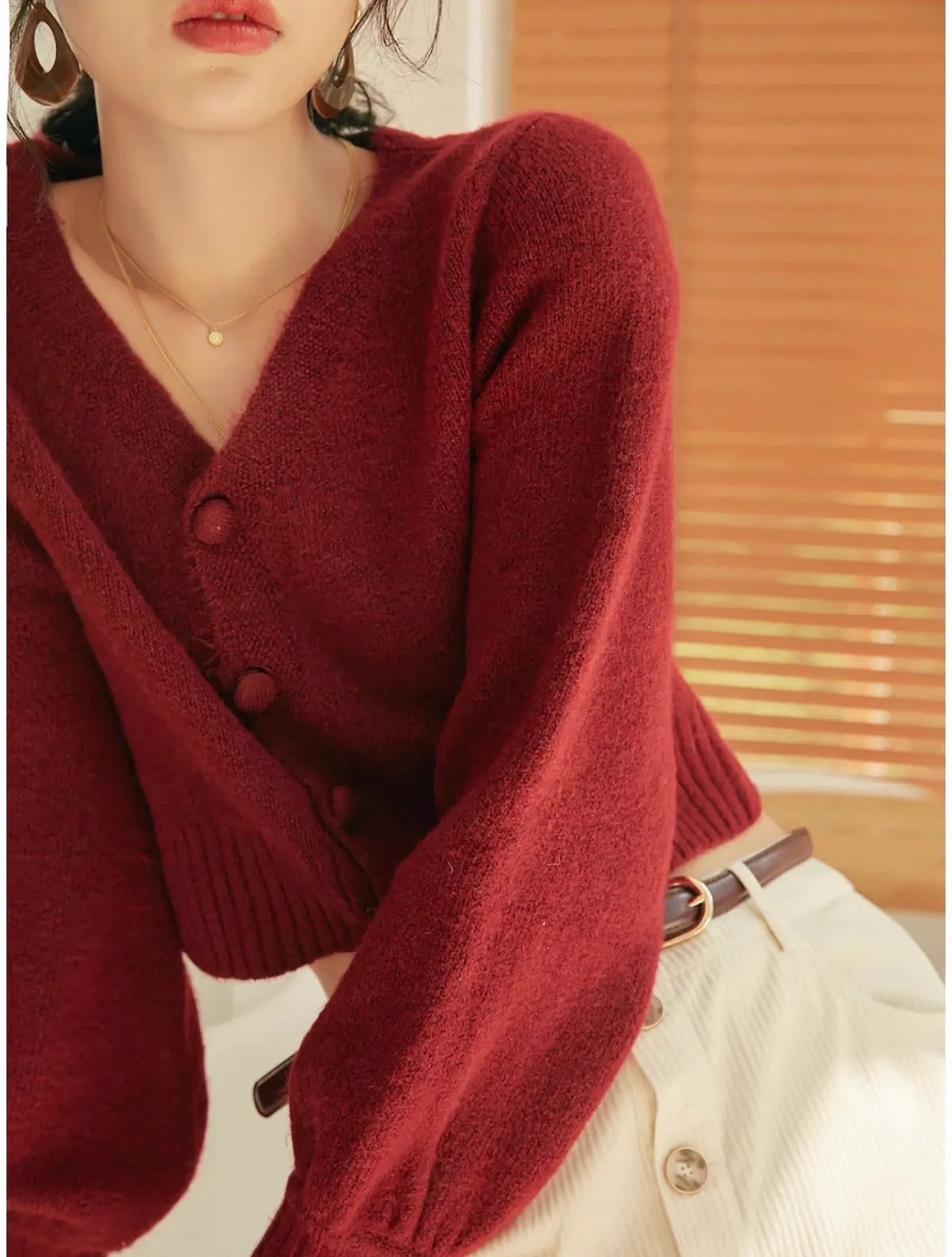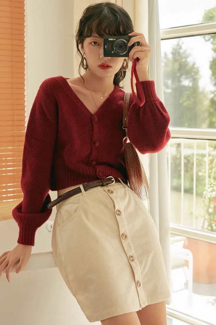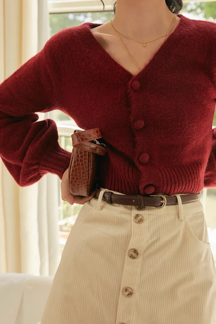 法式高級感V領大圓釦設計短版針織上衣