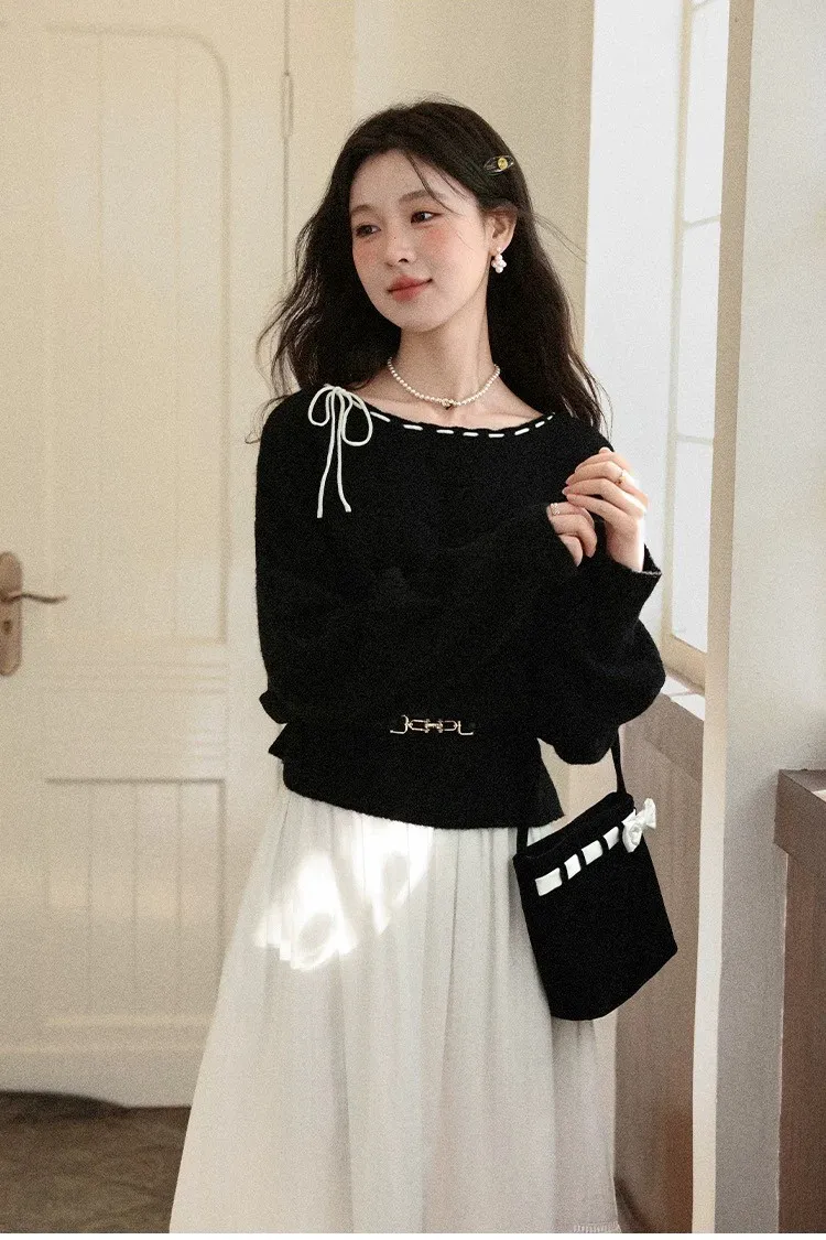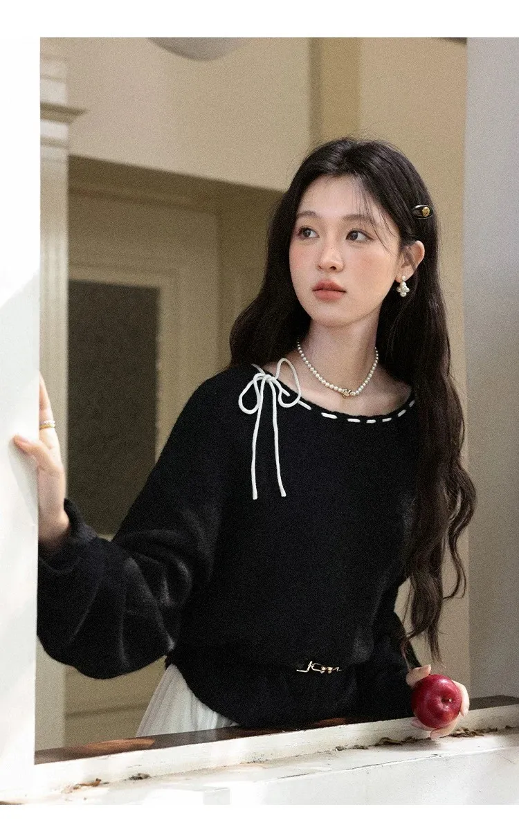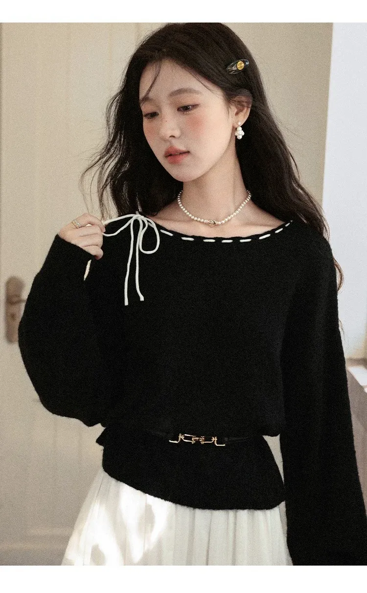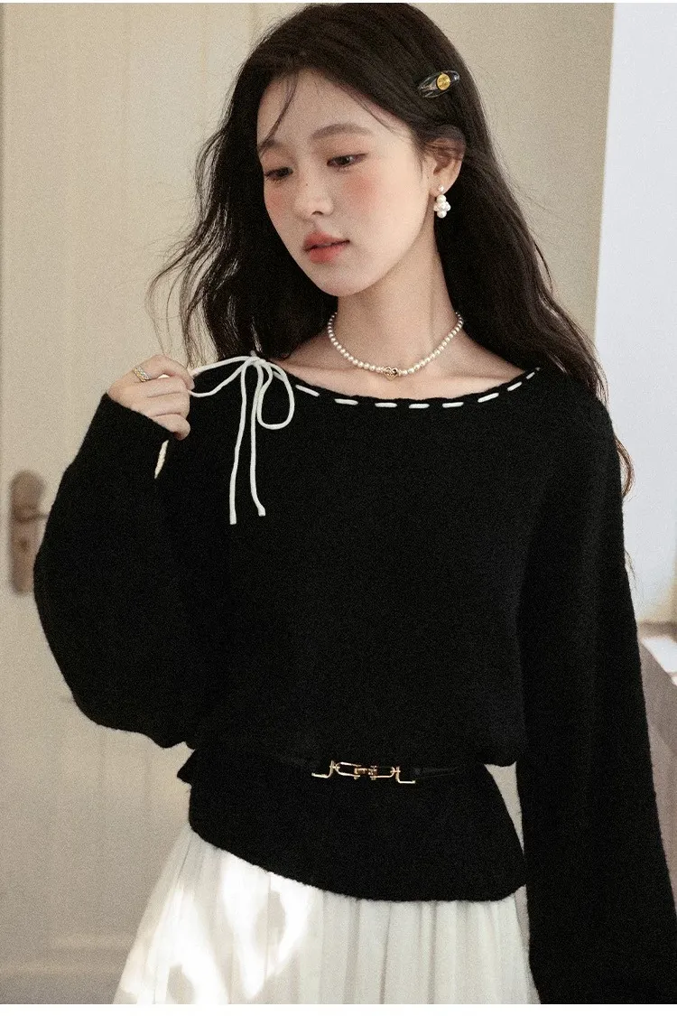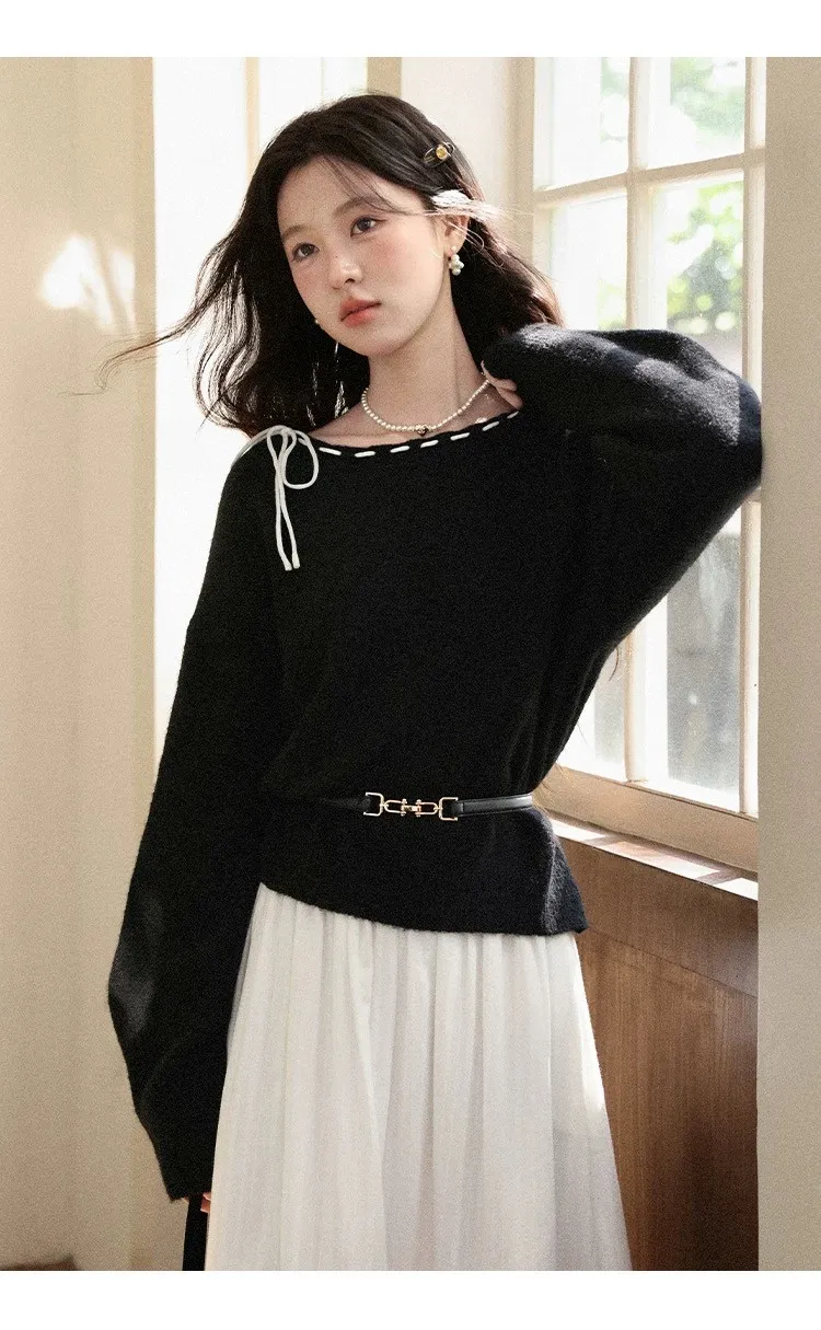 簡約蝴蝶結繫帶高級感配色針織上衣