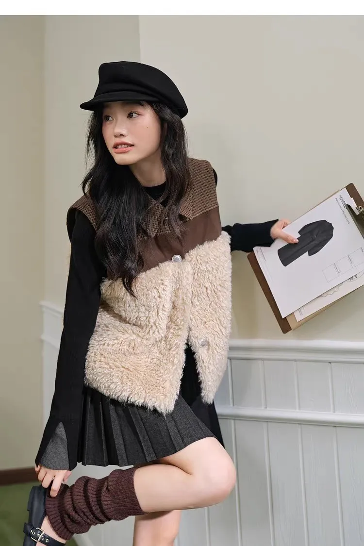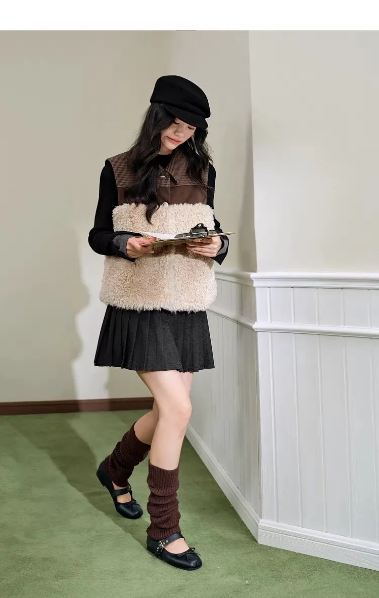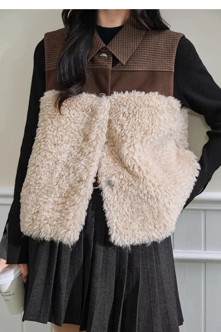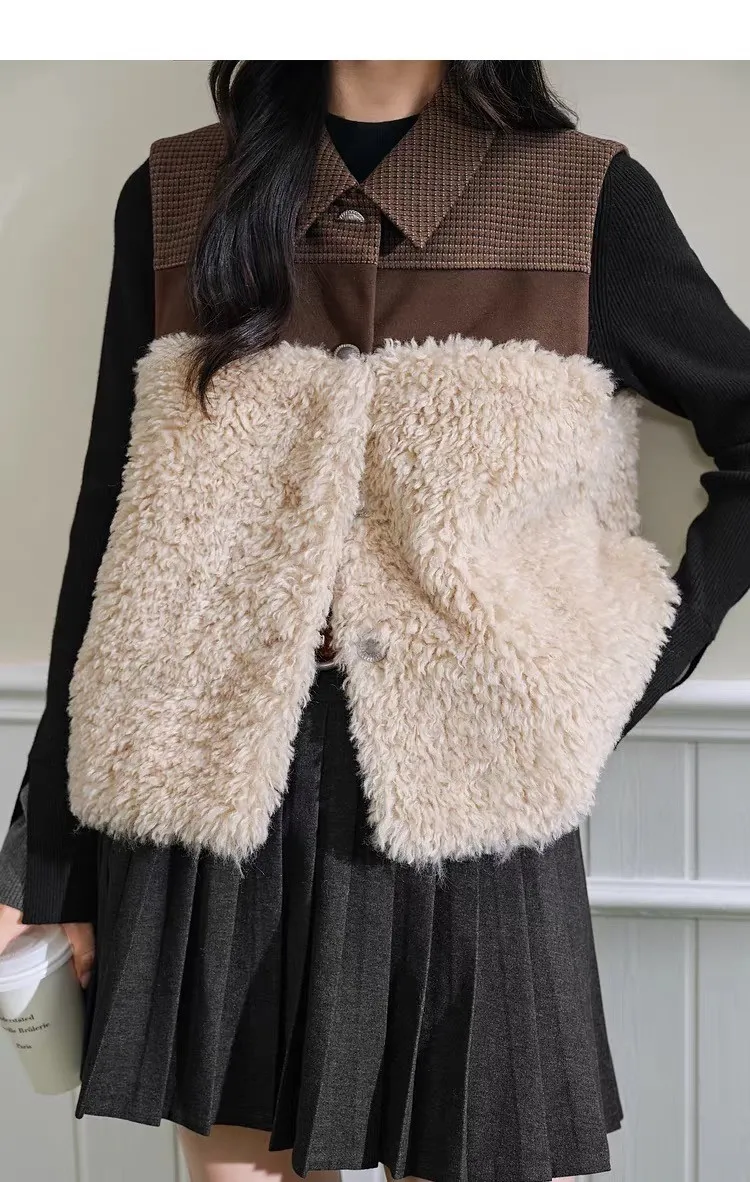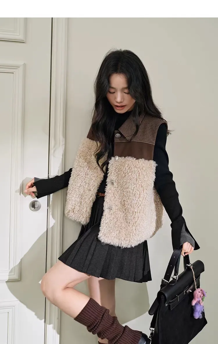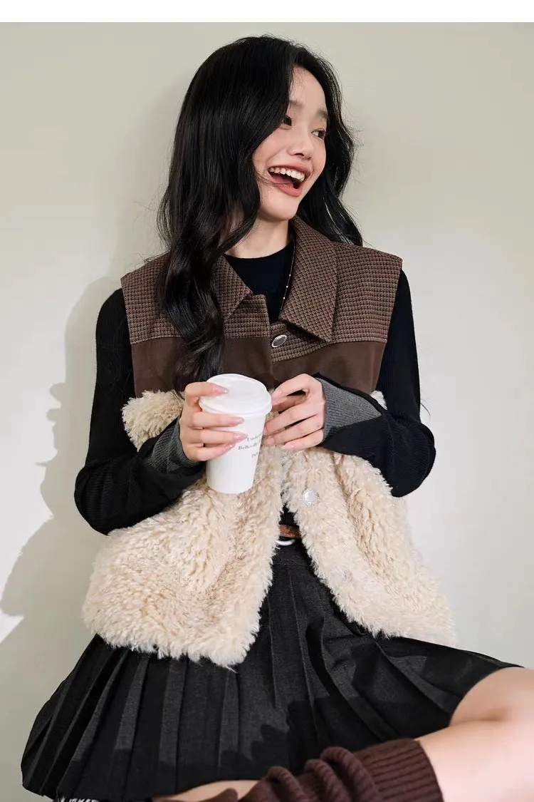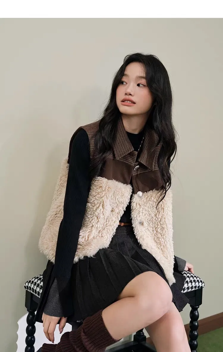 小眾拼接設計格紋毛茸茸馬甲背心