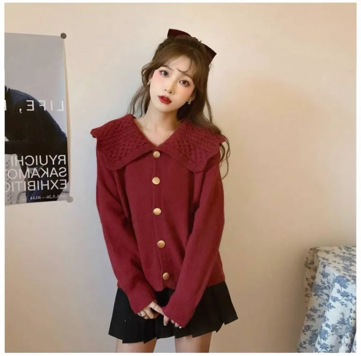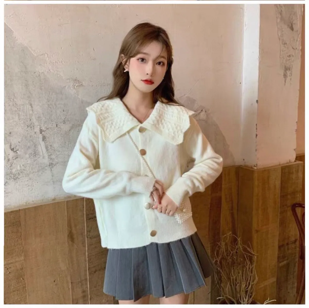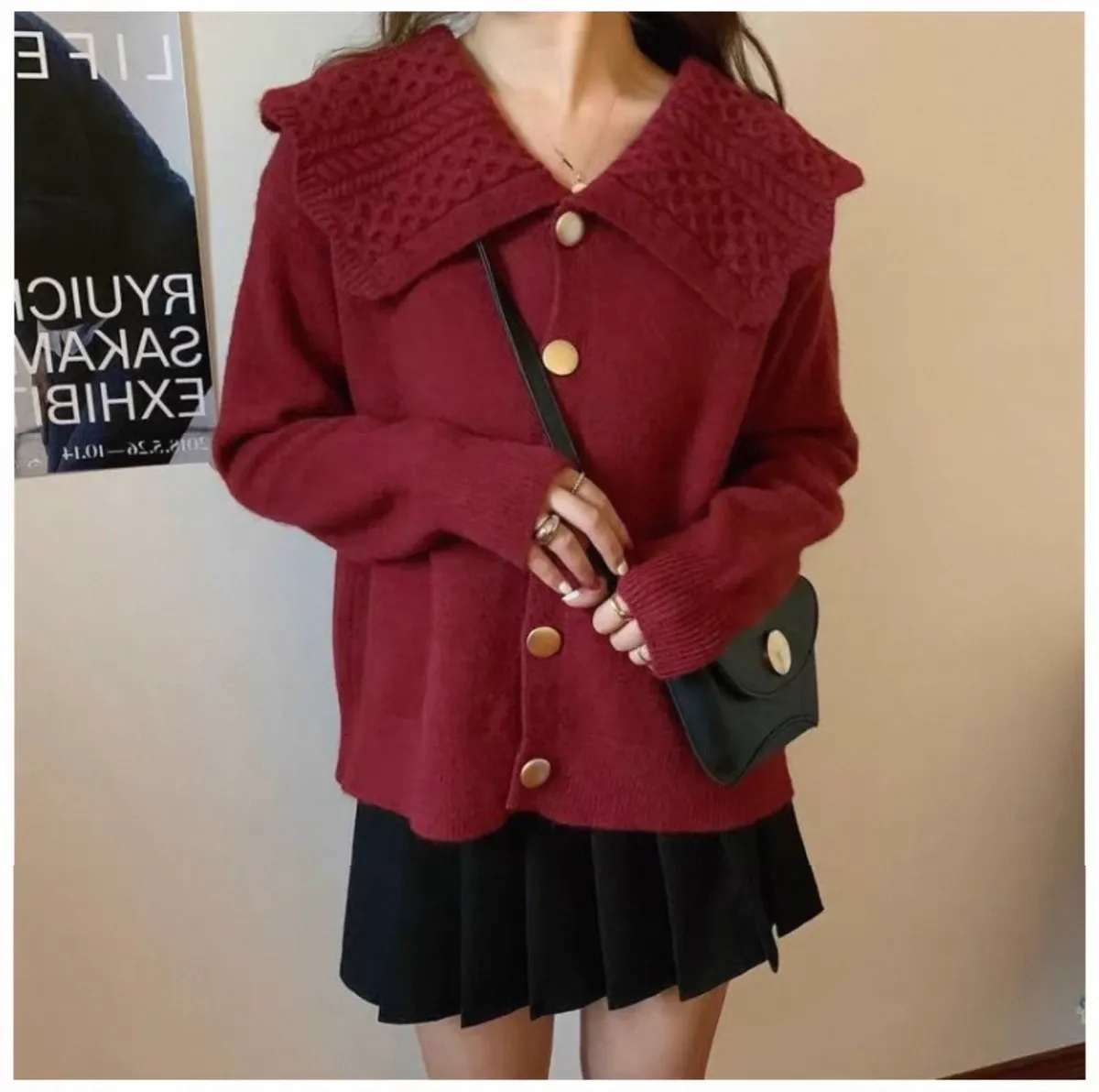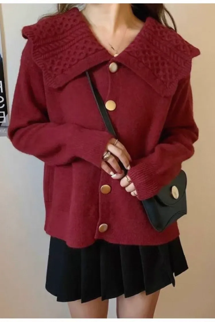 娃娃麻花翻領大圓釦針織開衫