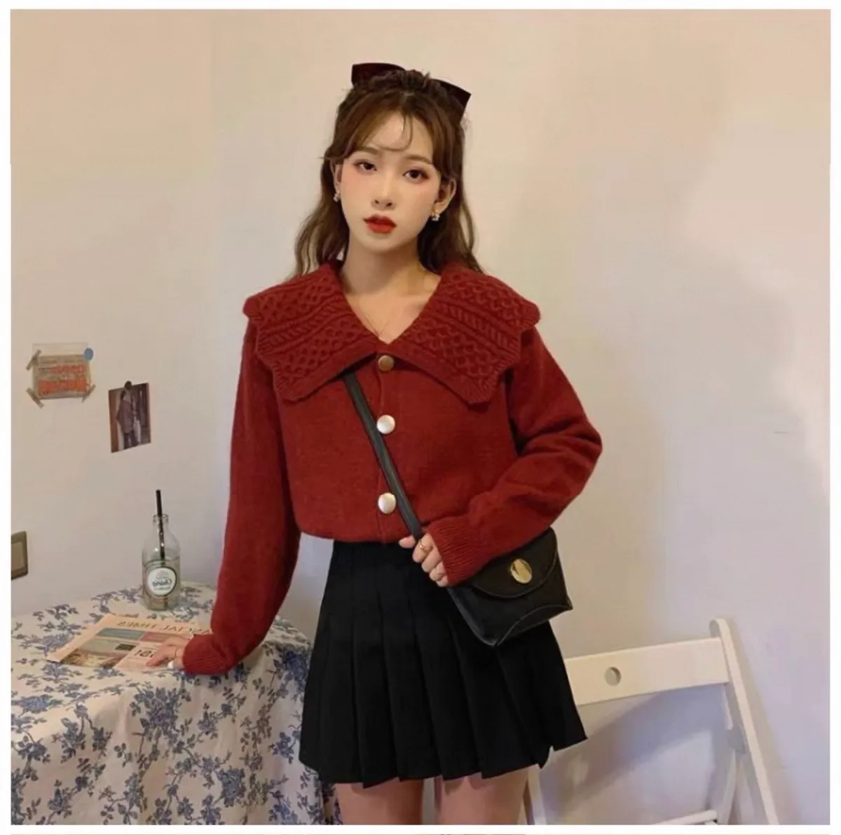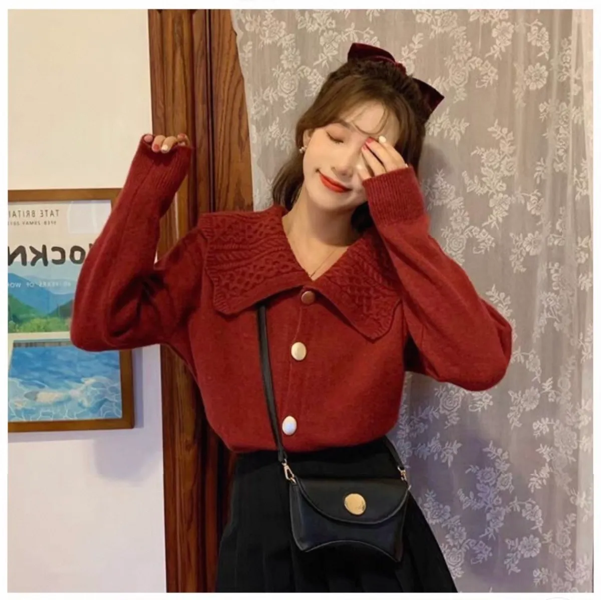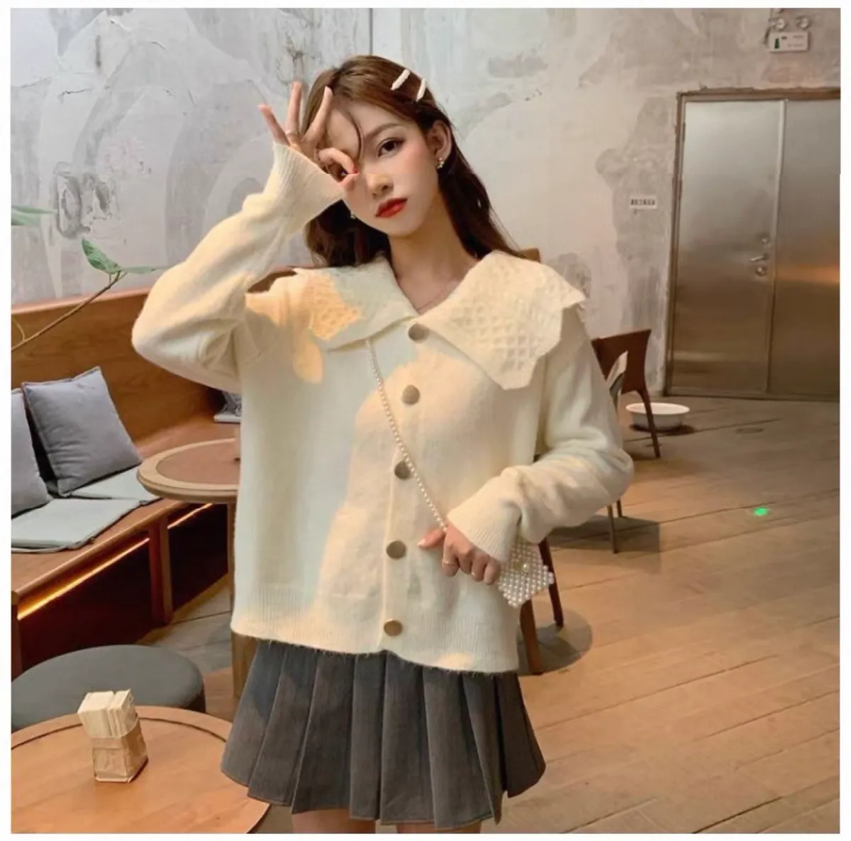 娃娃麻花翻領大圓釦針織開衫