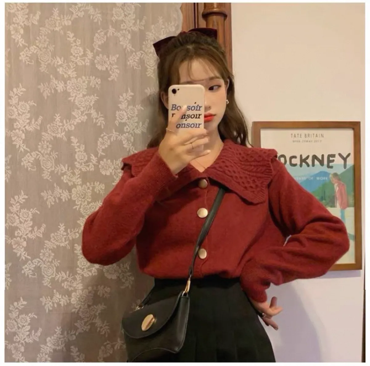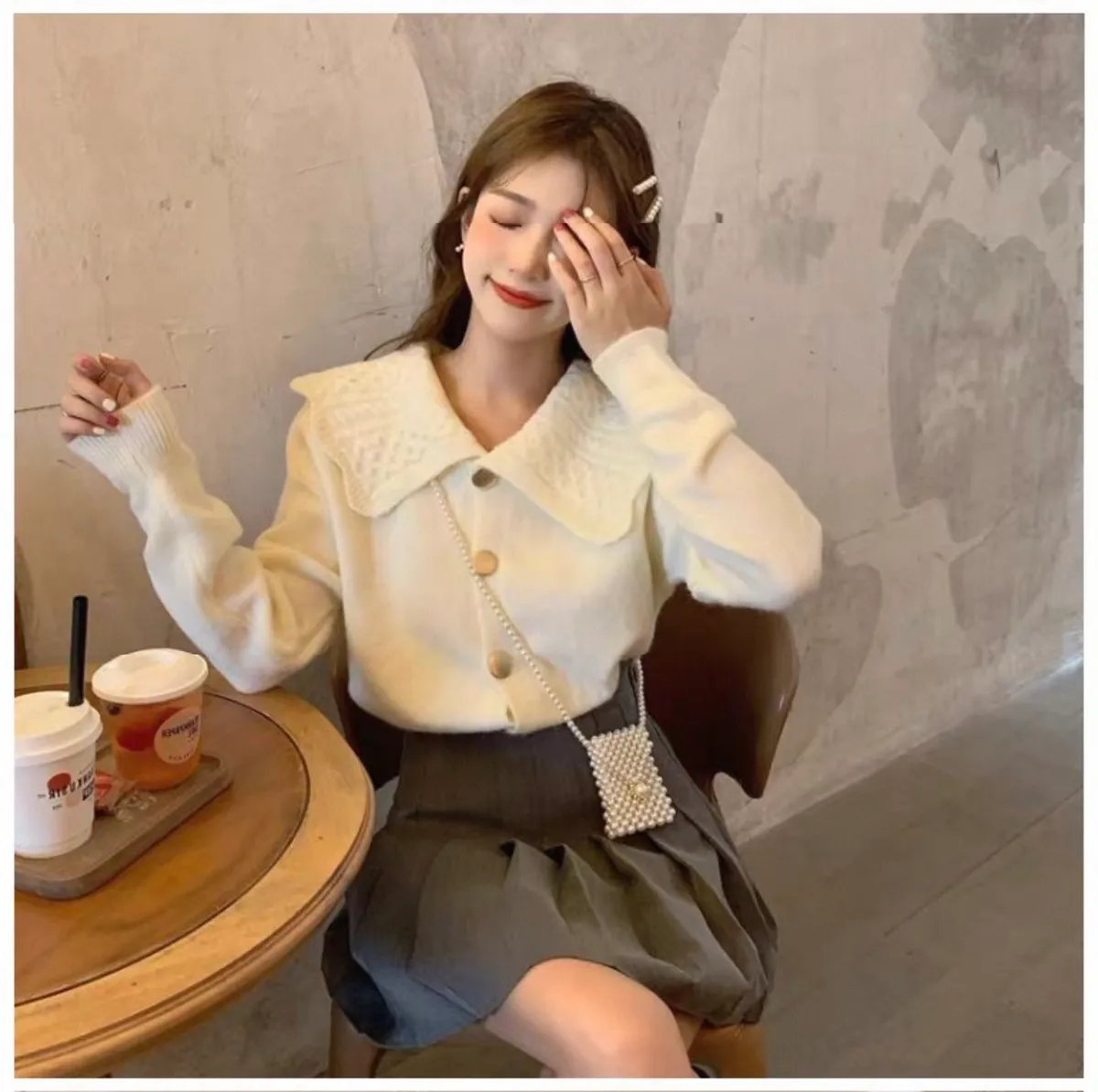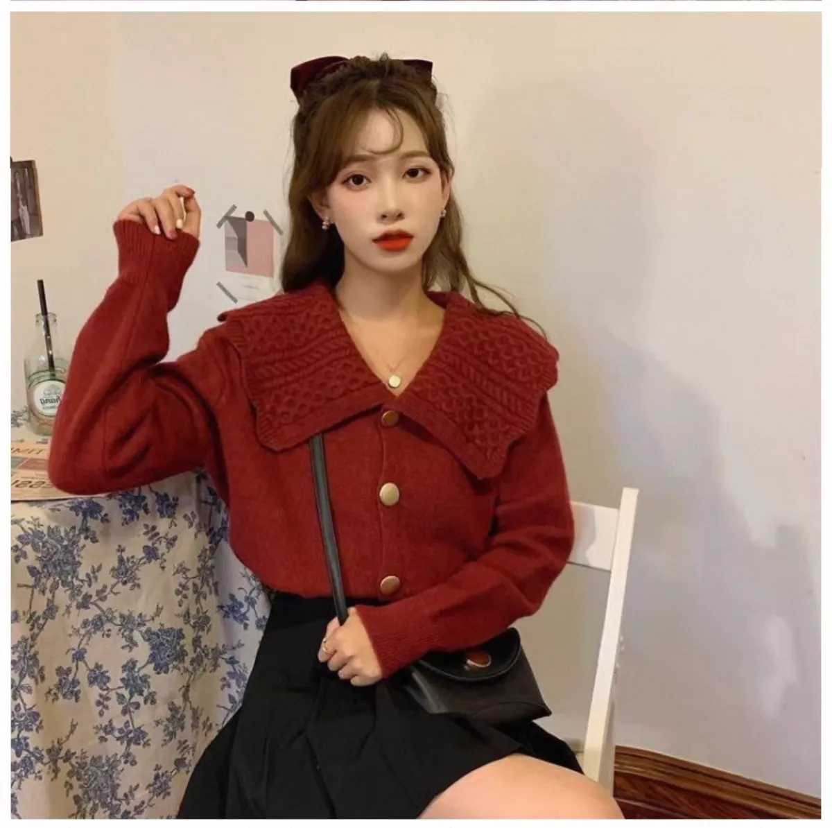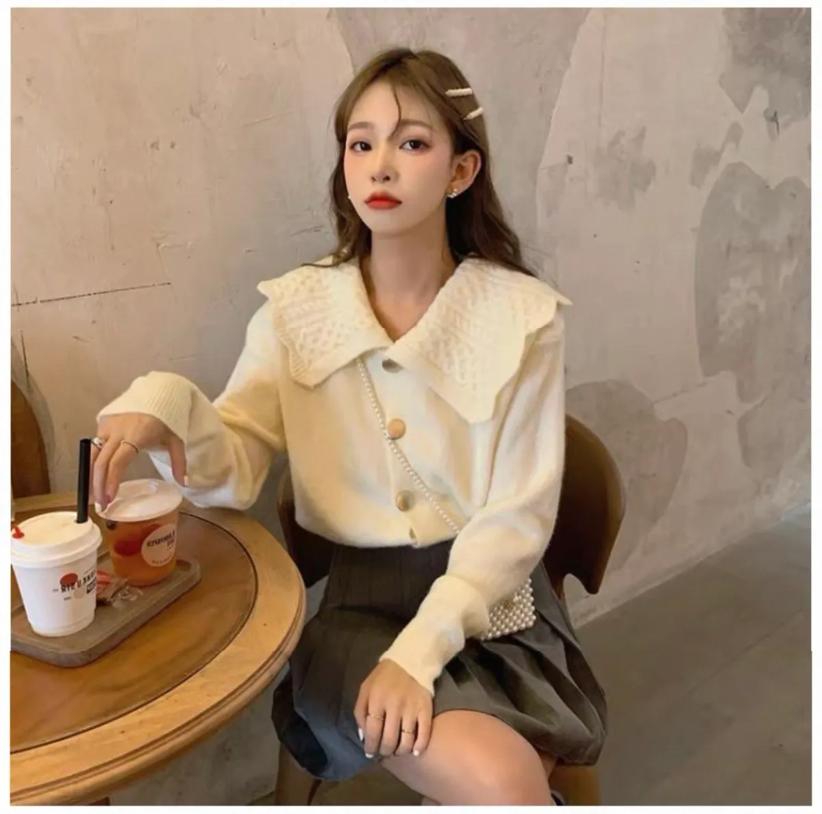 娃娃麻花翻領大圓釦針織開衫