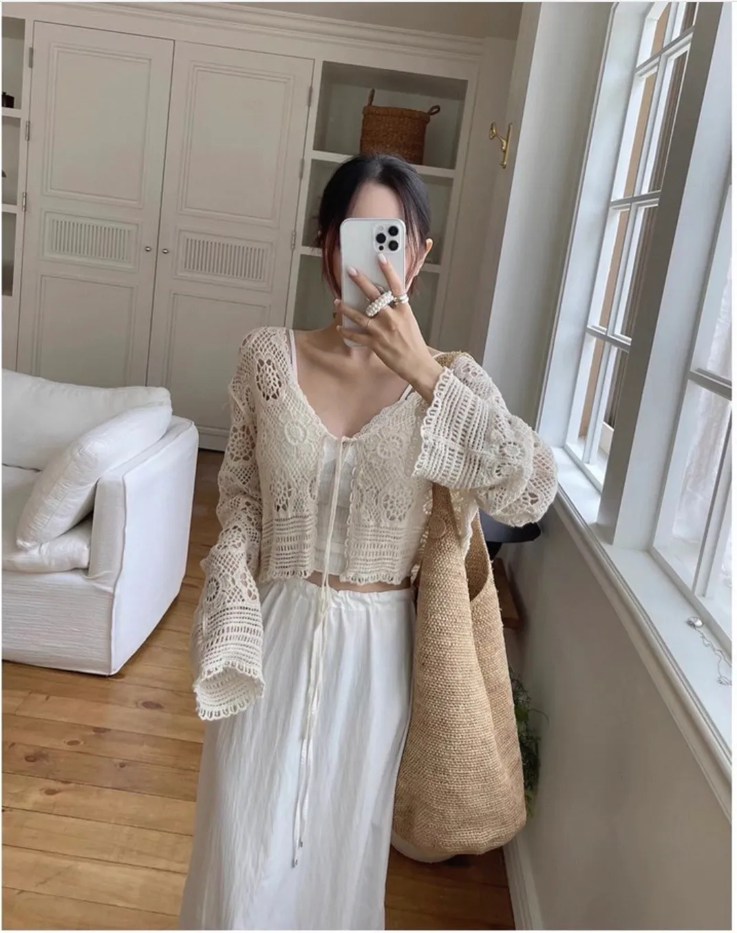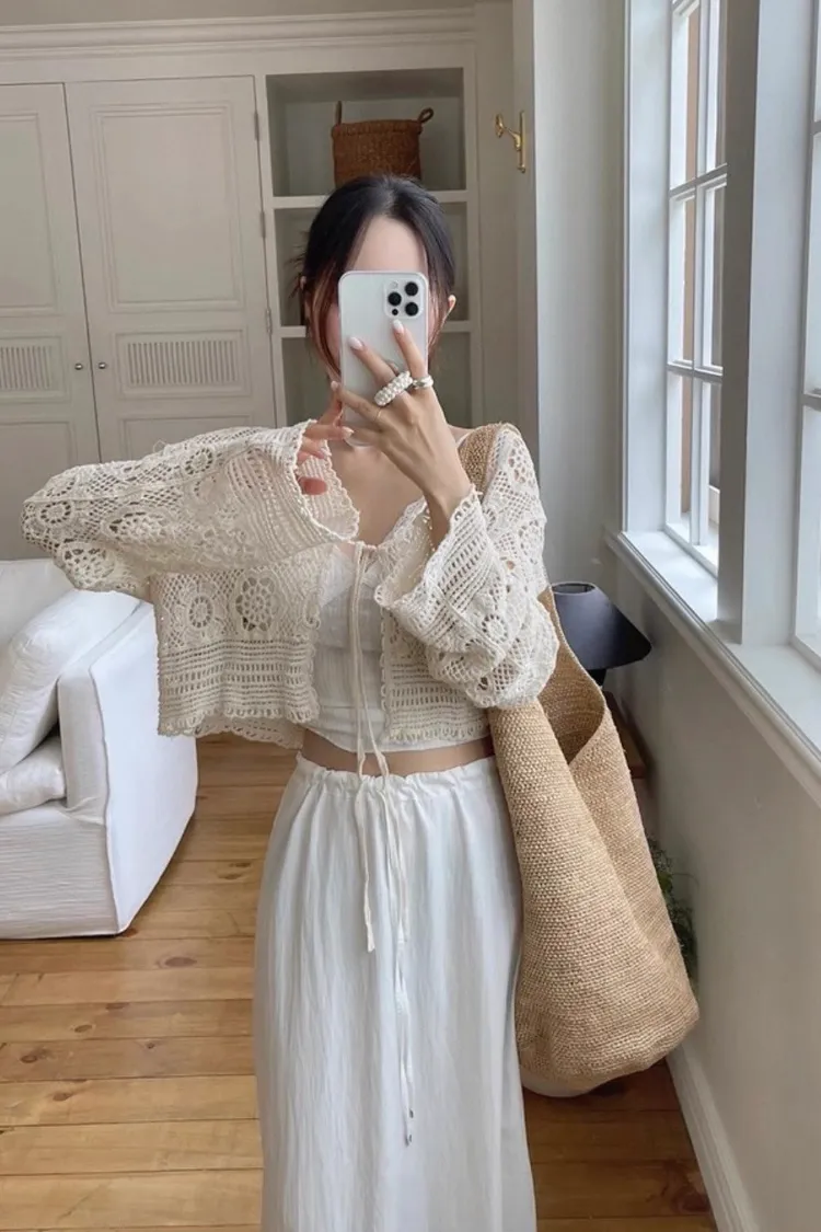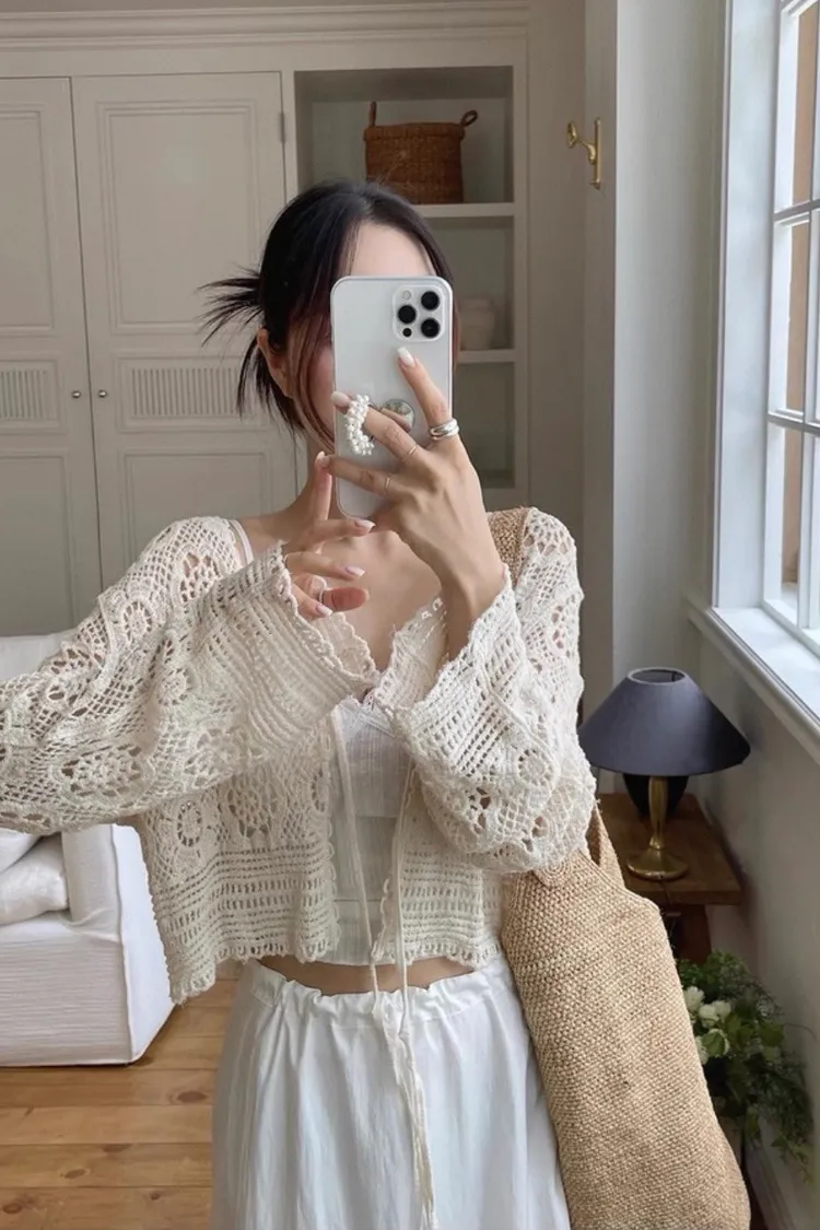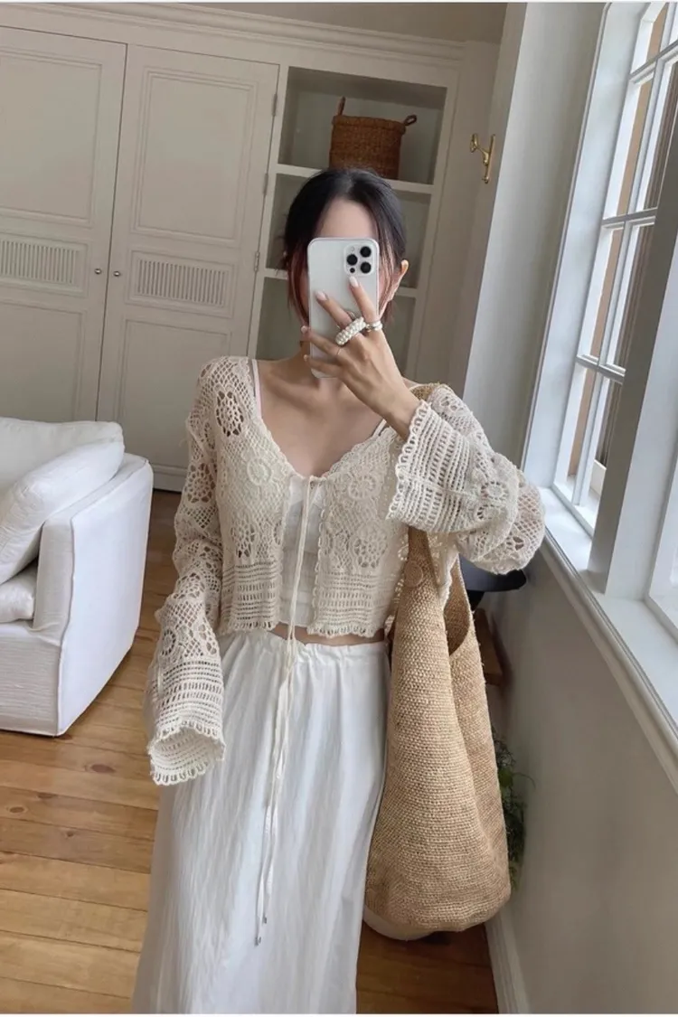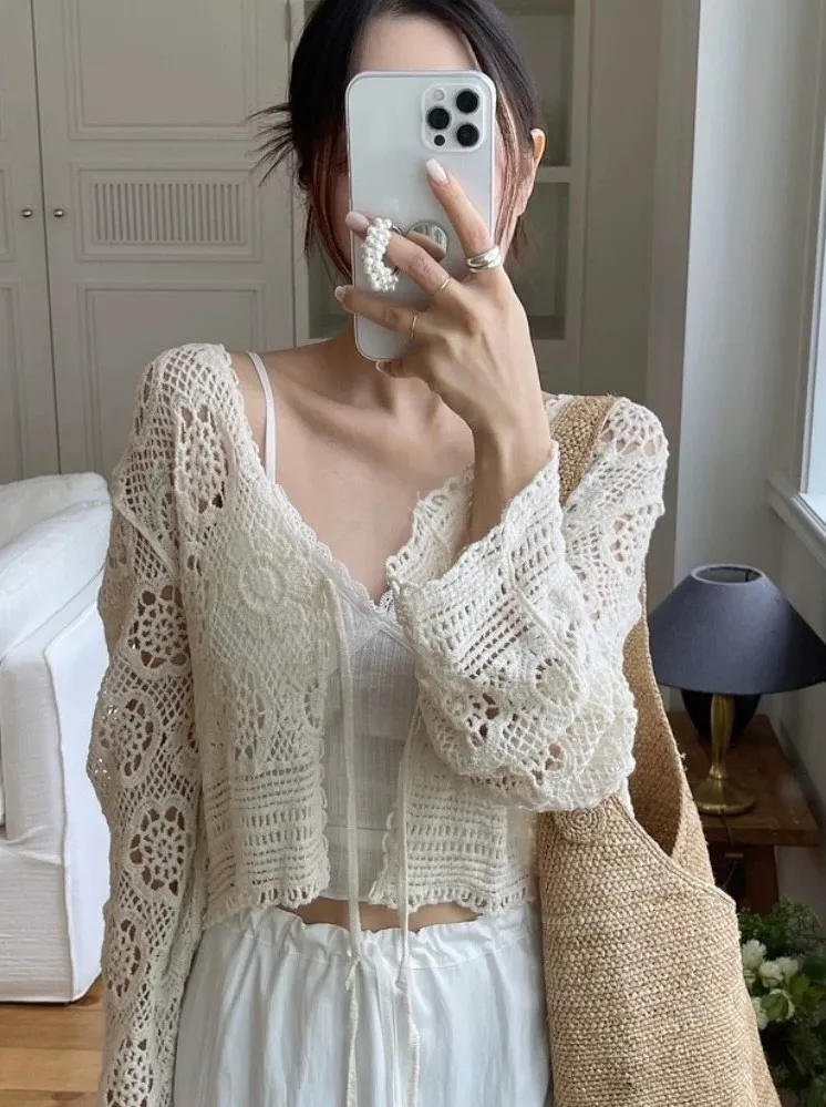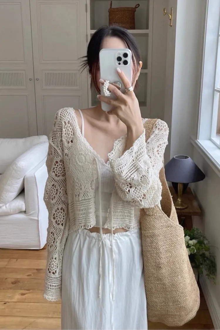 鏤空鉤花針織綁帶罩衫外套