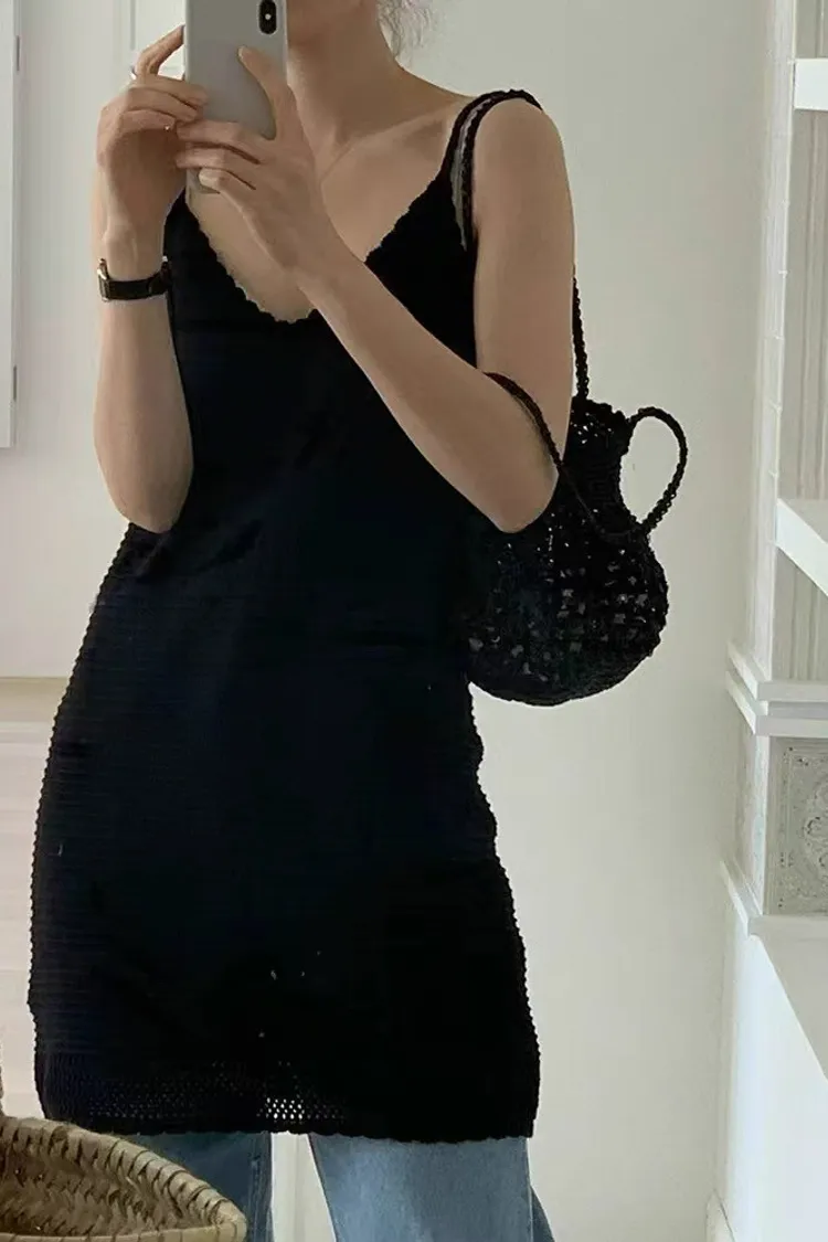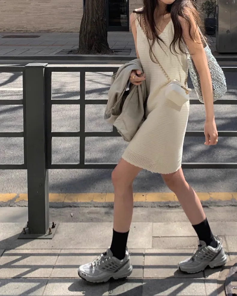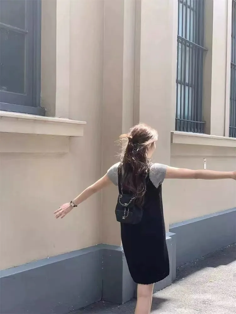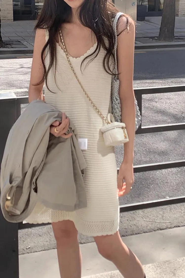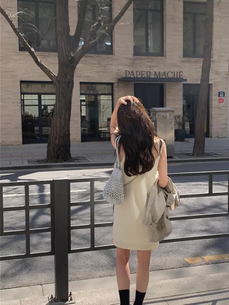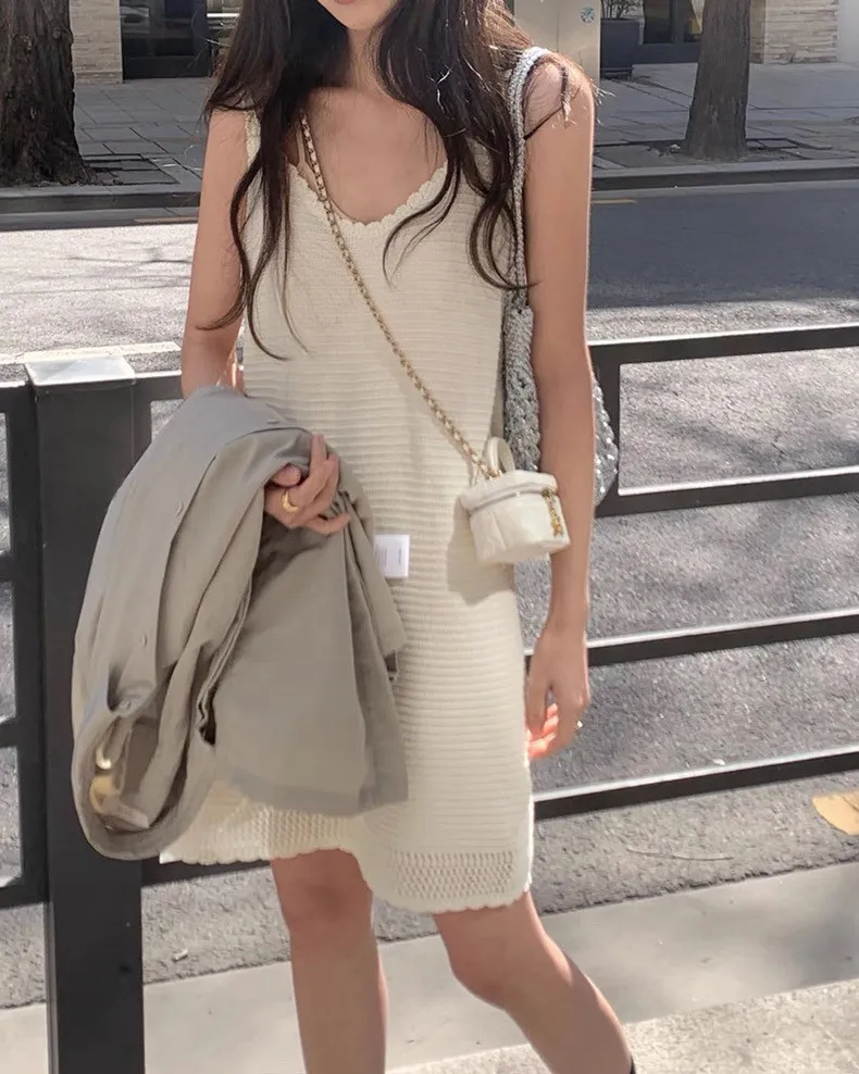 韓系Chic高級感坑條無袖針織背心連身裙
