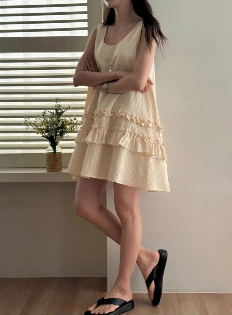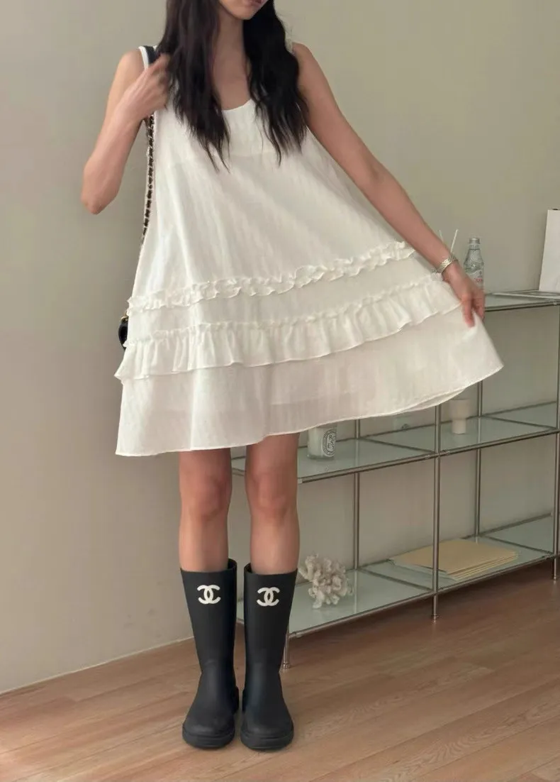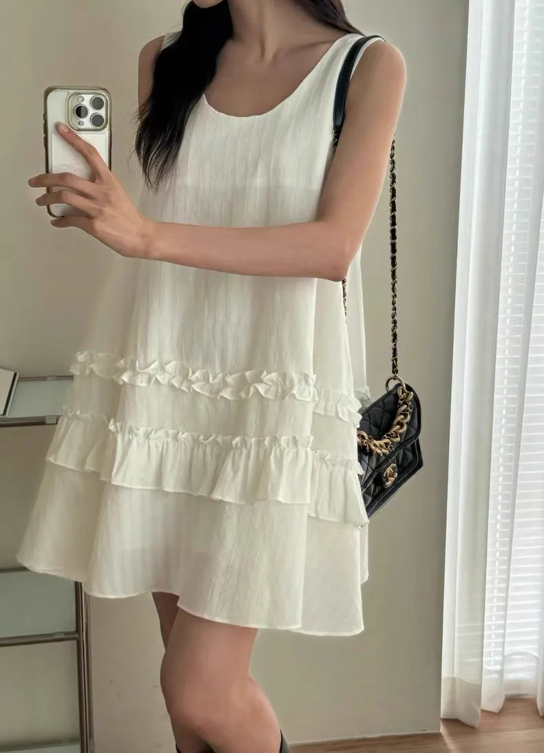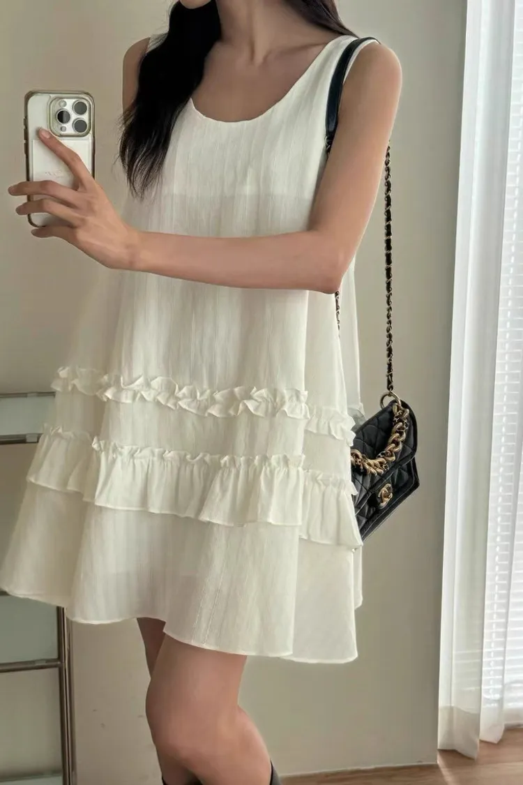 法式拼接木耳花邊甜美無袖蛋糕裙