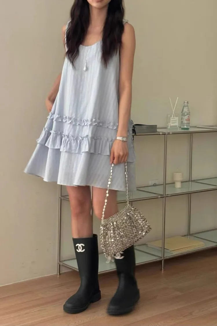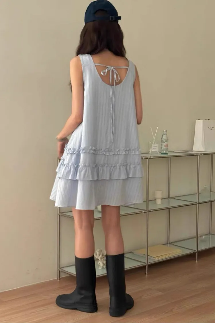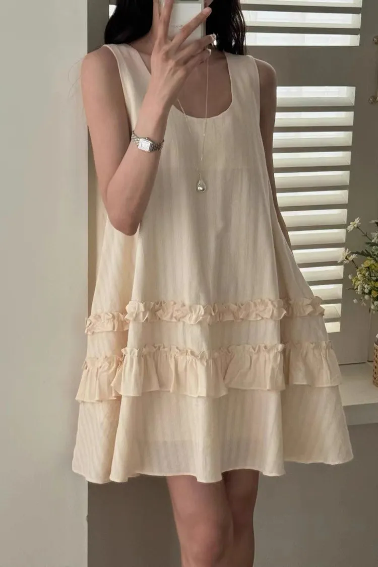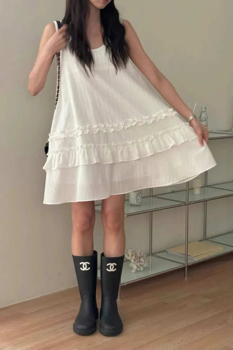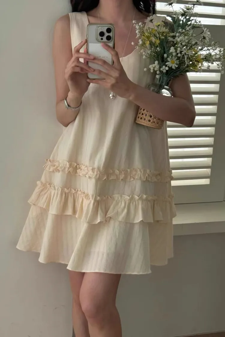 法式拼接木耳花邊甜美無袖蛋糕裙