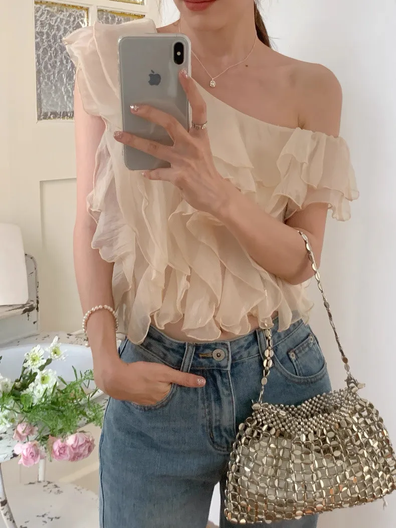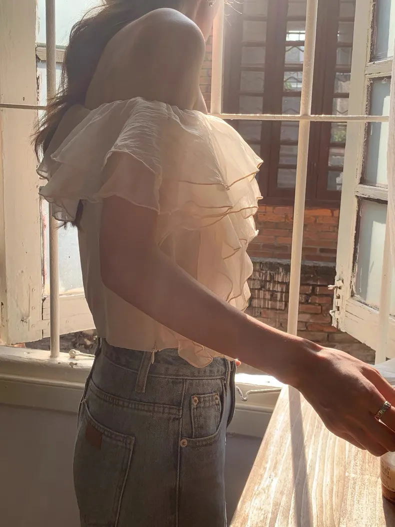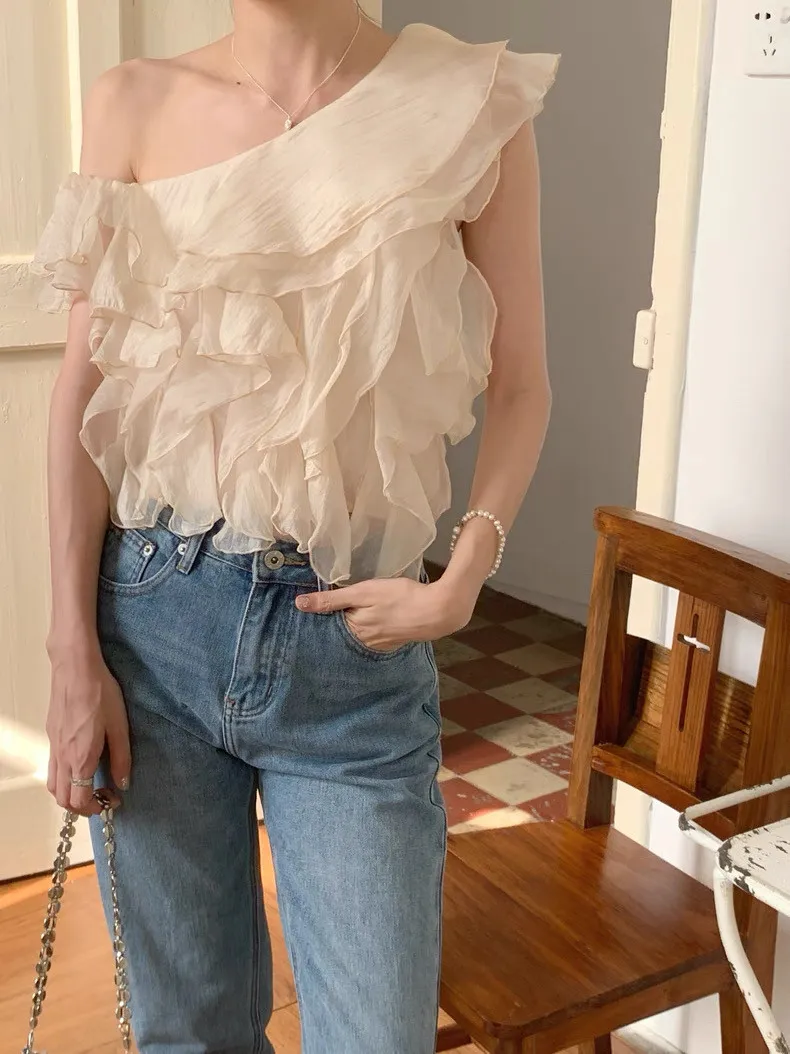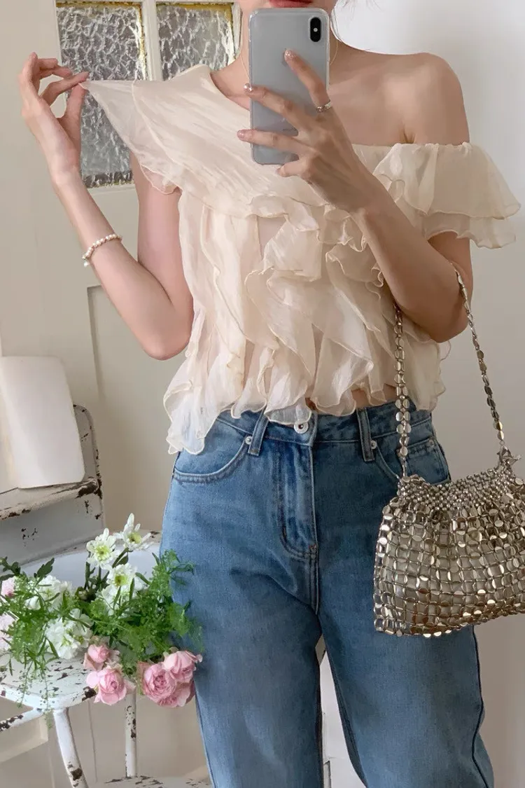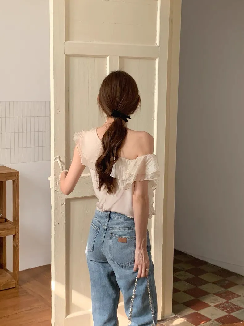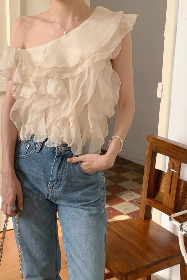 韓系斜領露肩拼接不規則荷葉邊短版褶皺襯衫