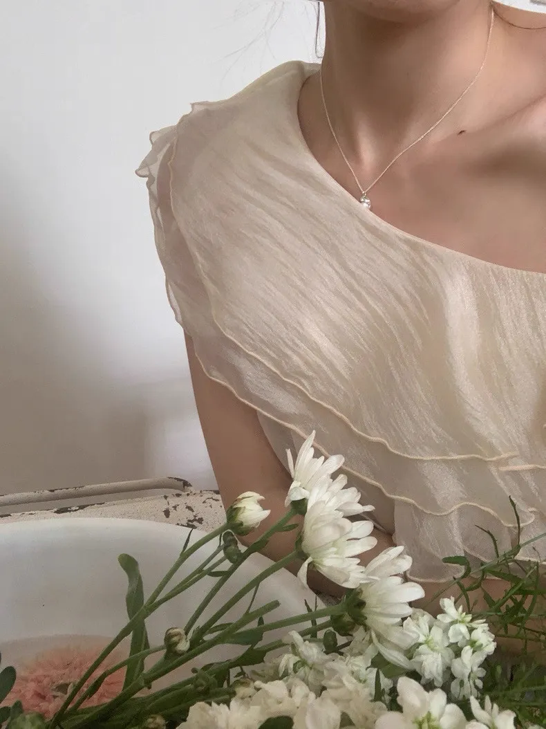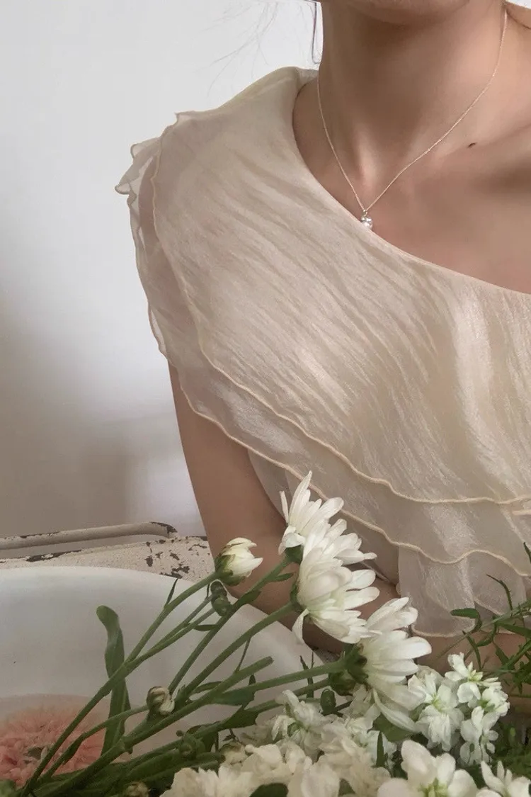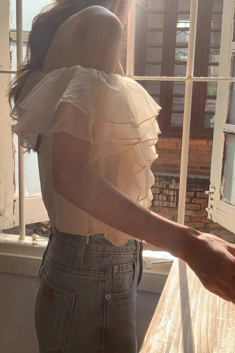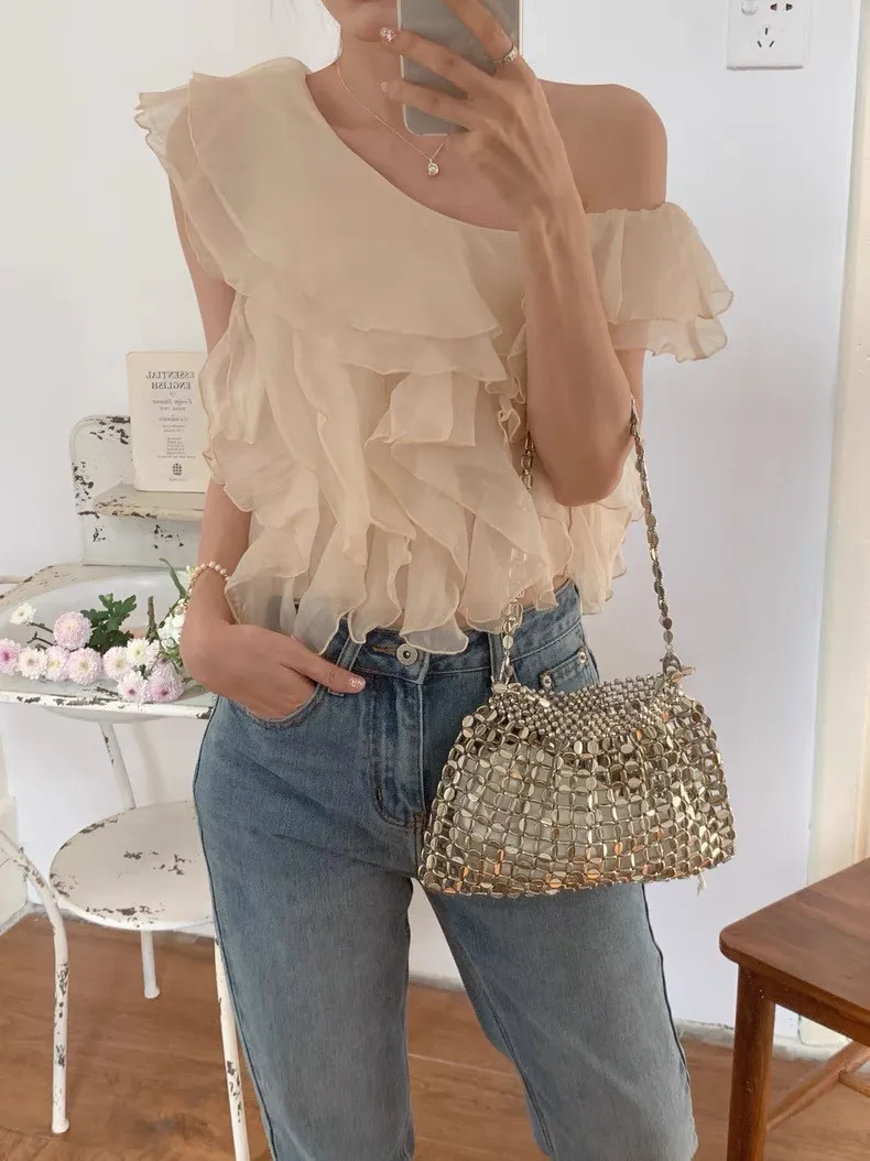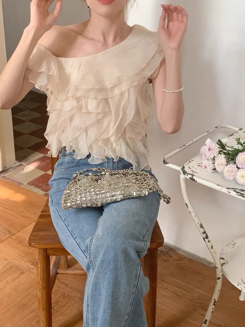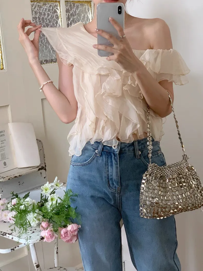 韓系斜領露肩拼接不規則荷葉邊短版褶皺襯衫