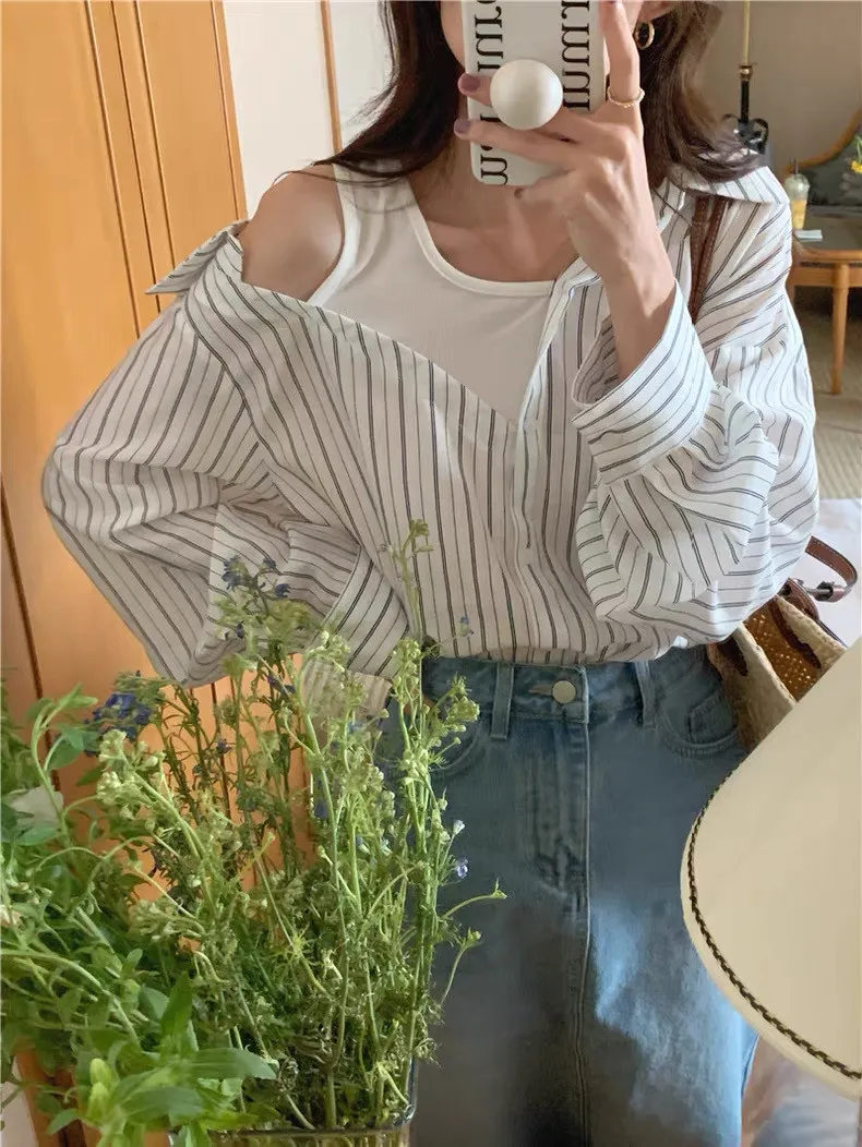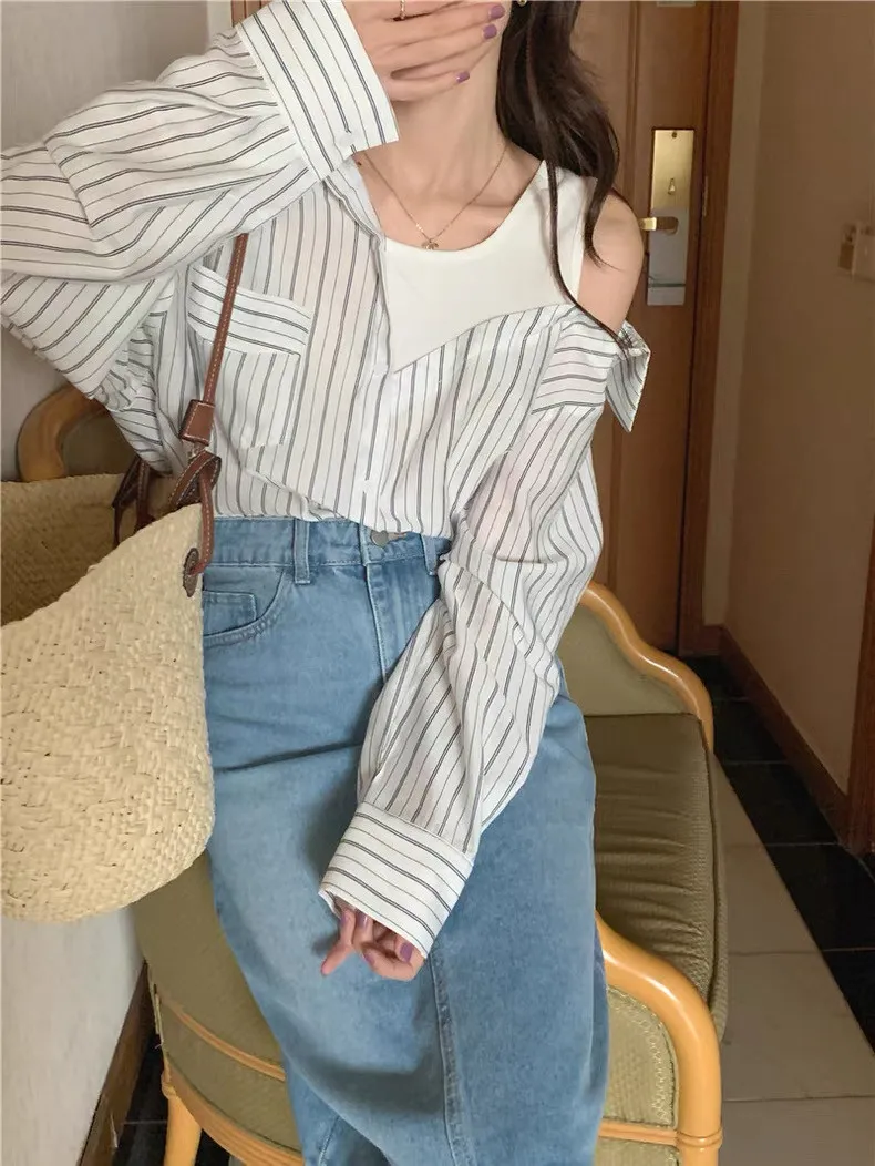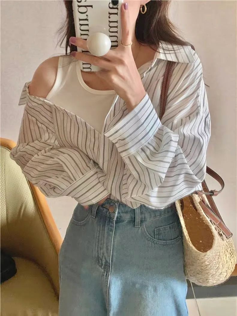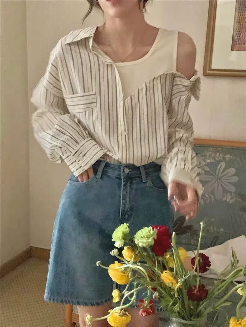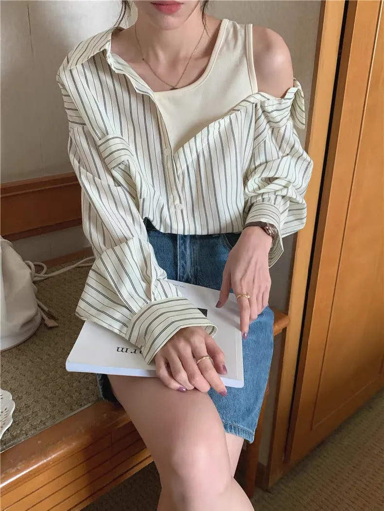 韓系小眾設計翻領假兩件露肩條紋襯衫