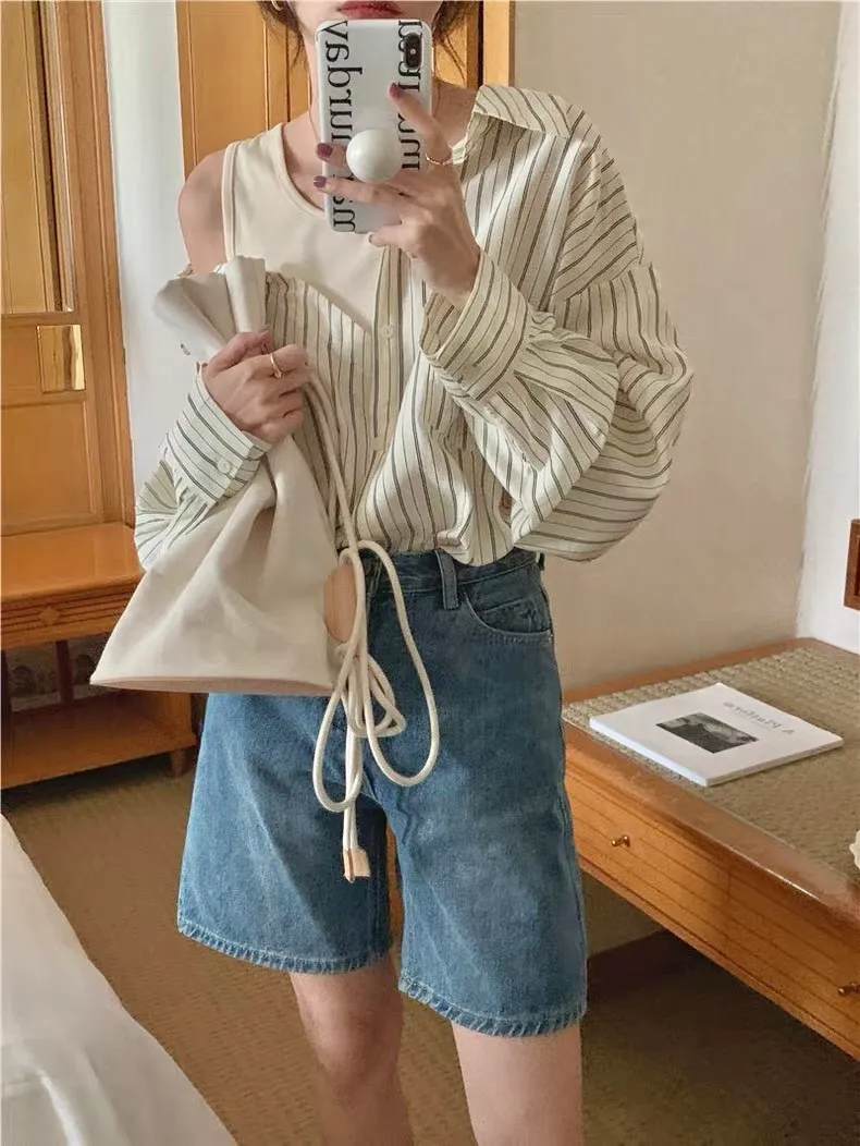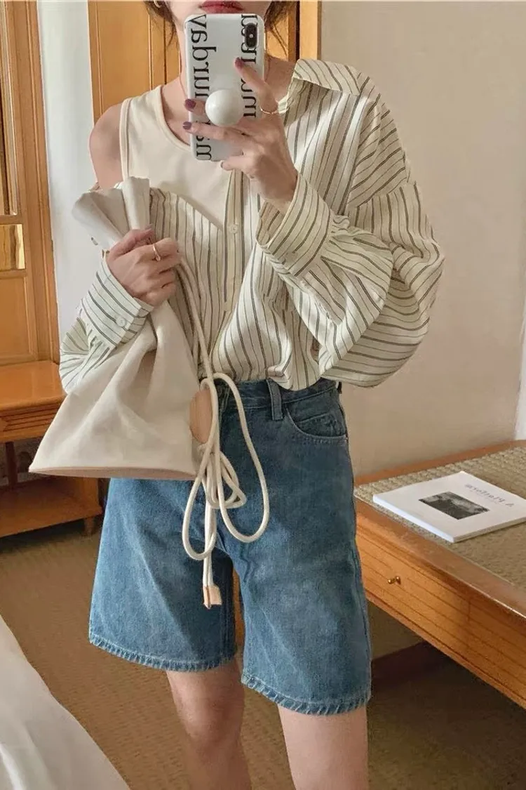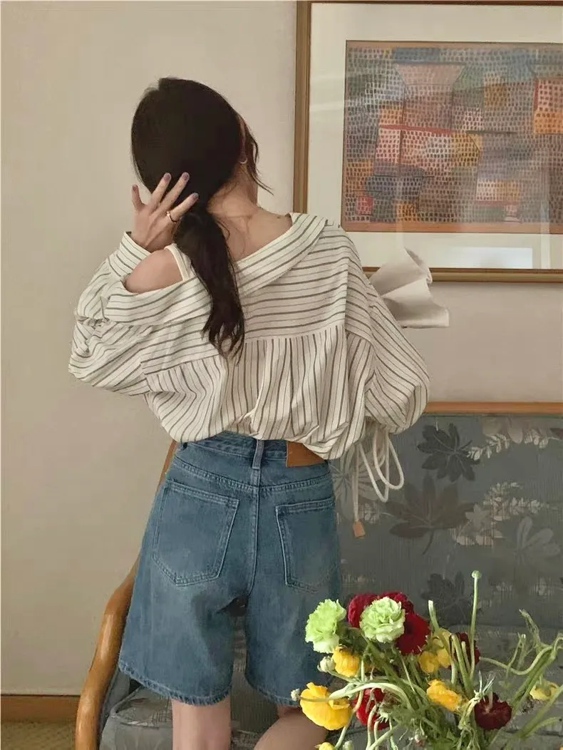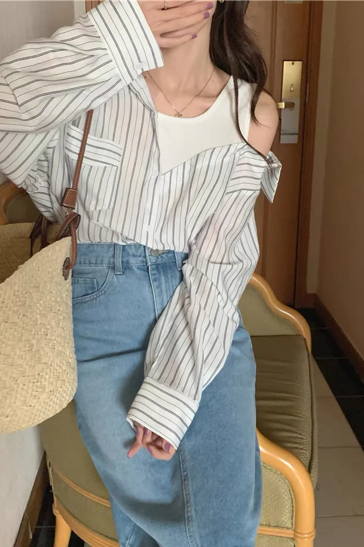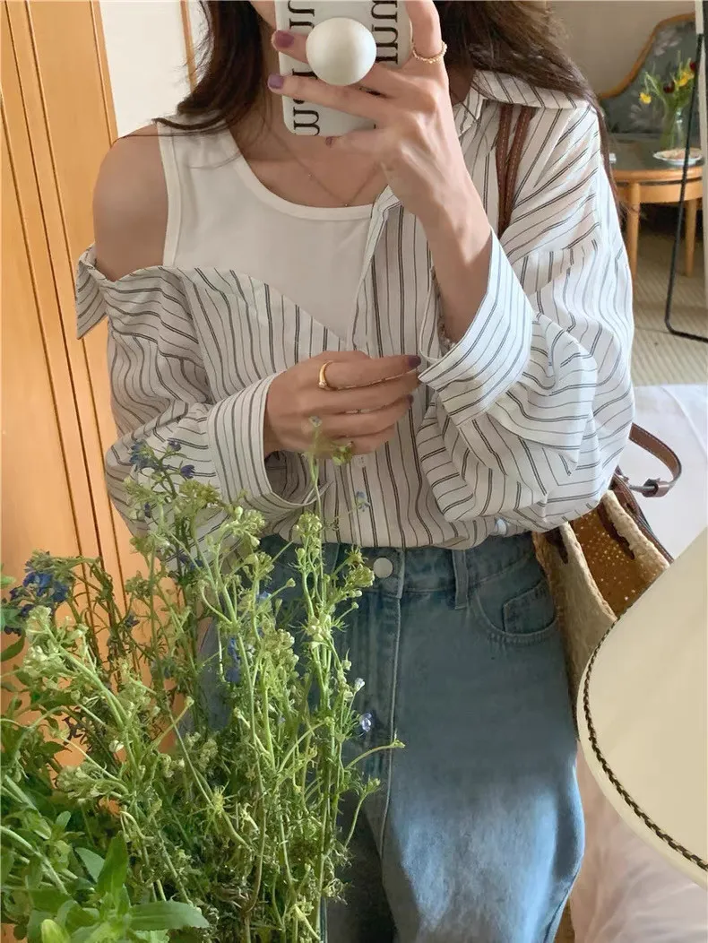 韓系小眾設計翻領假兩件露肩條紋襯衫