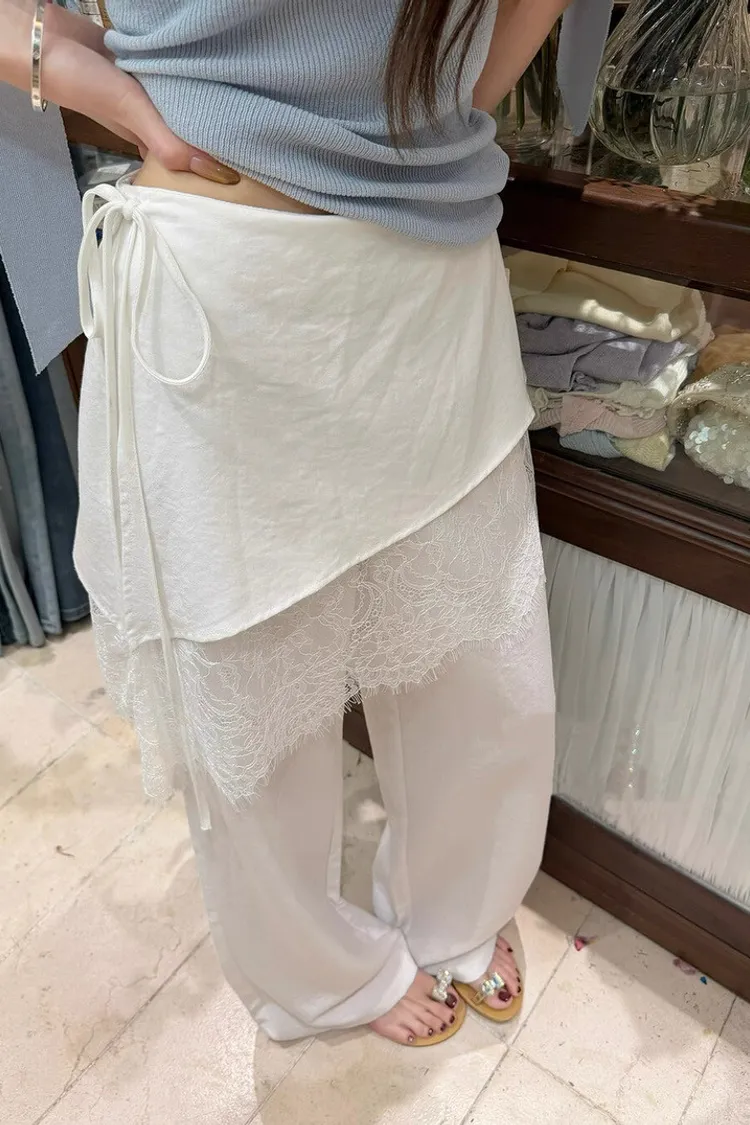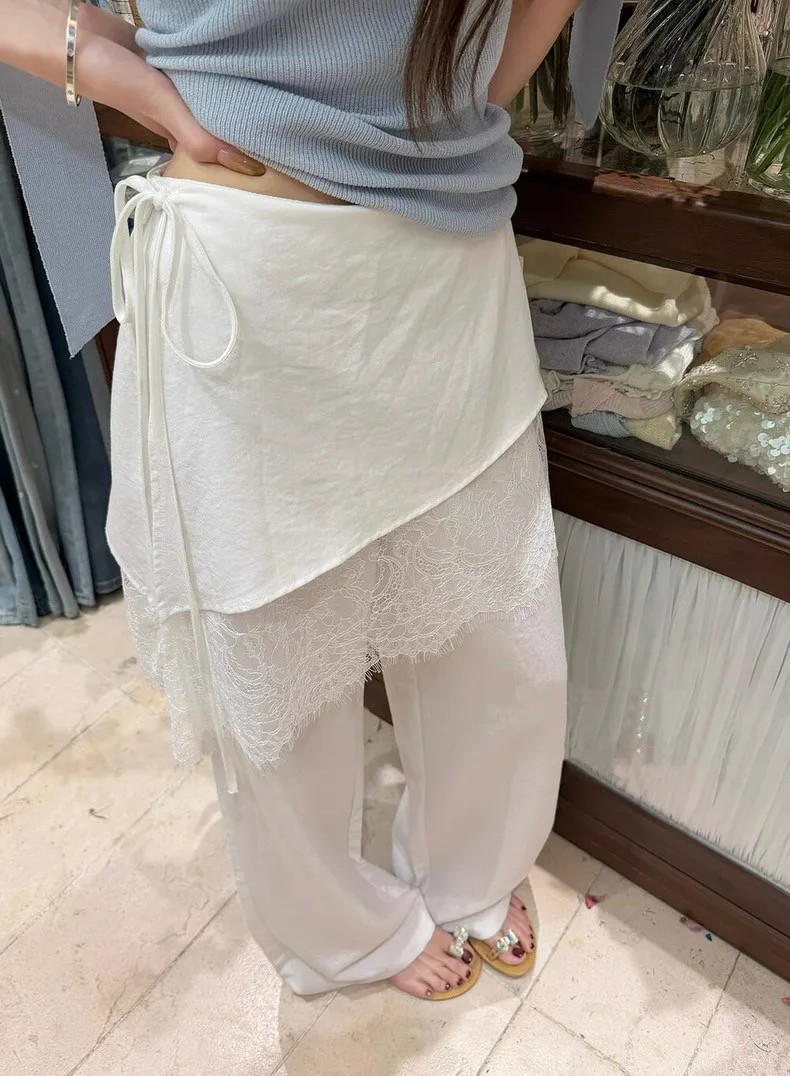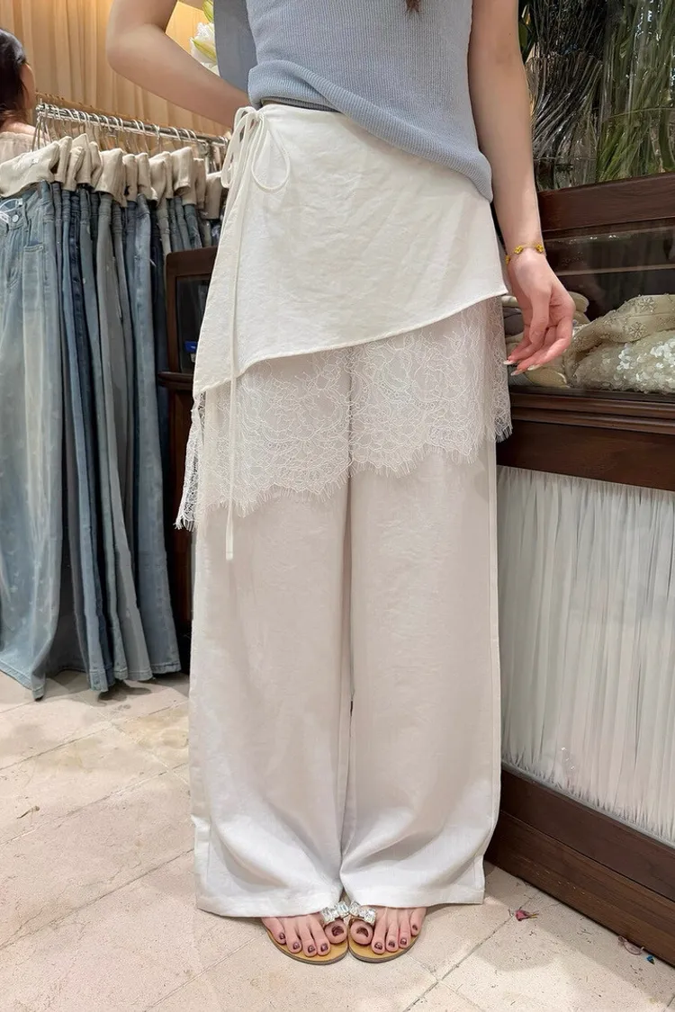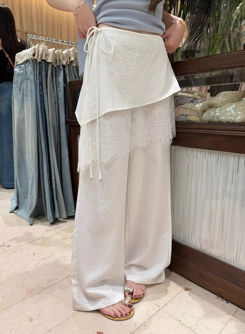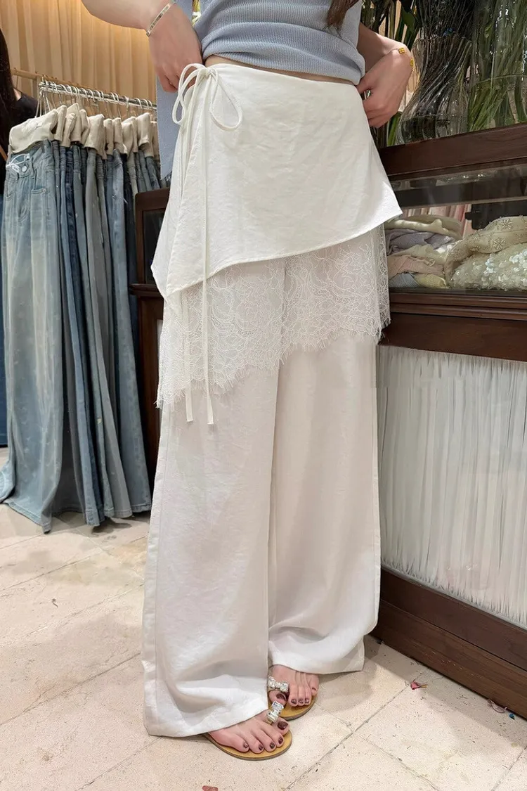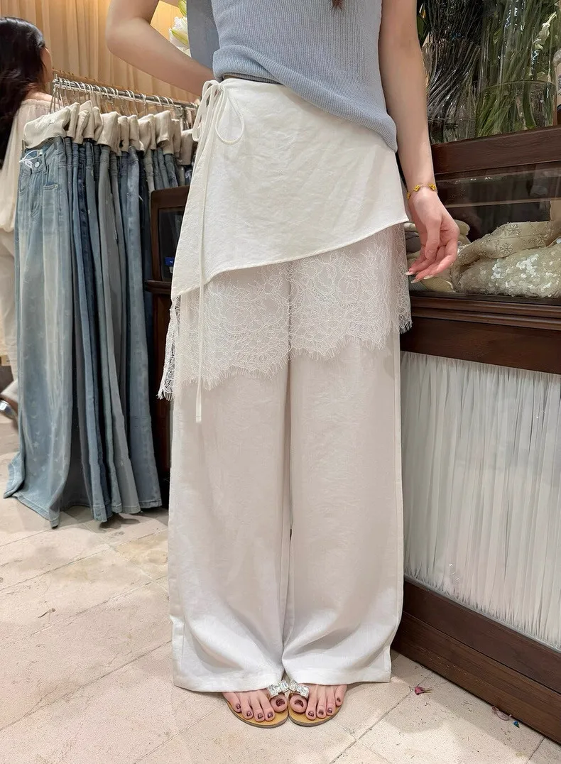 設計感蕾絲拼接繫帶高腰假兩件休閒褲