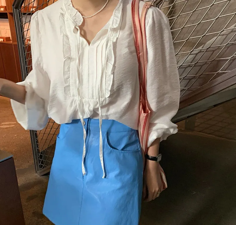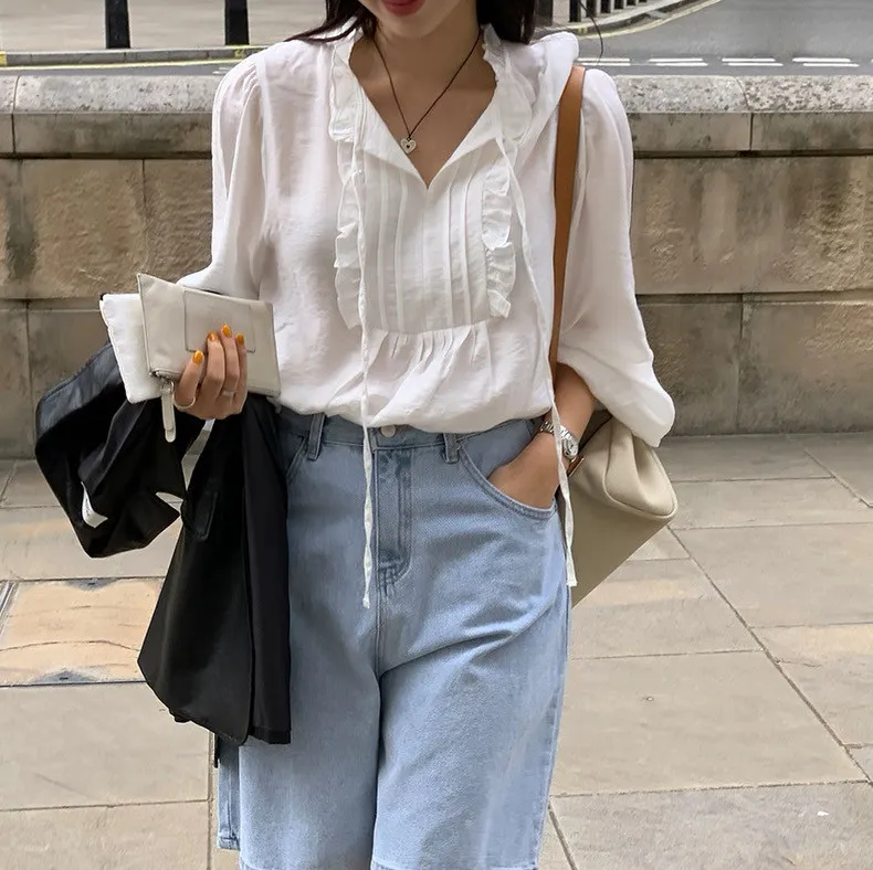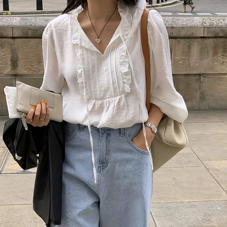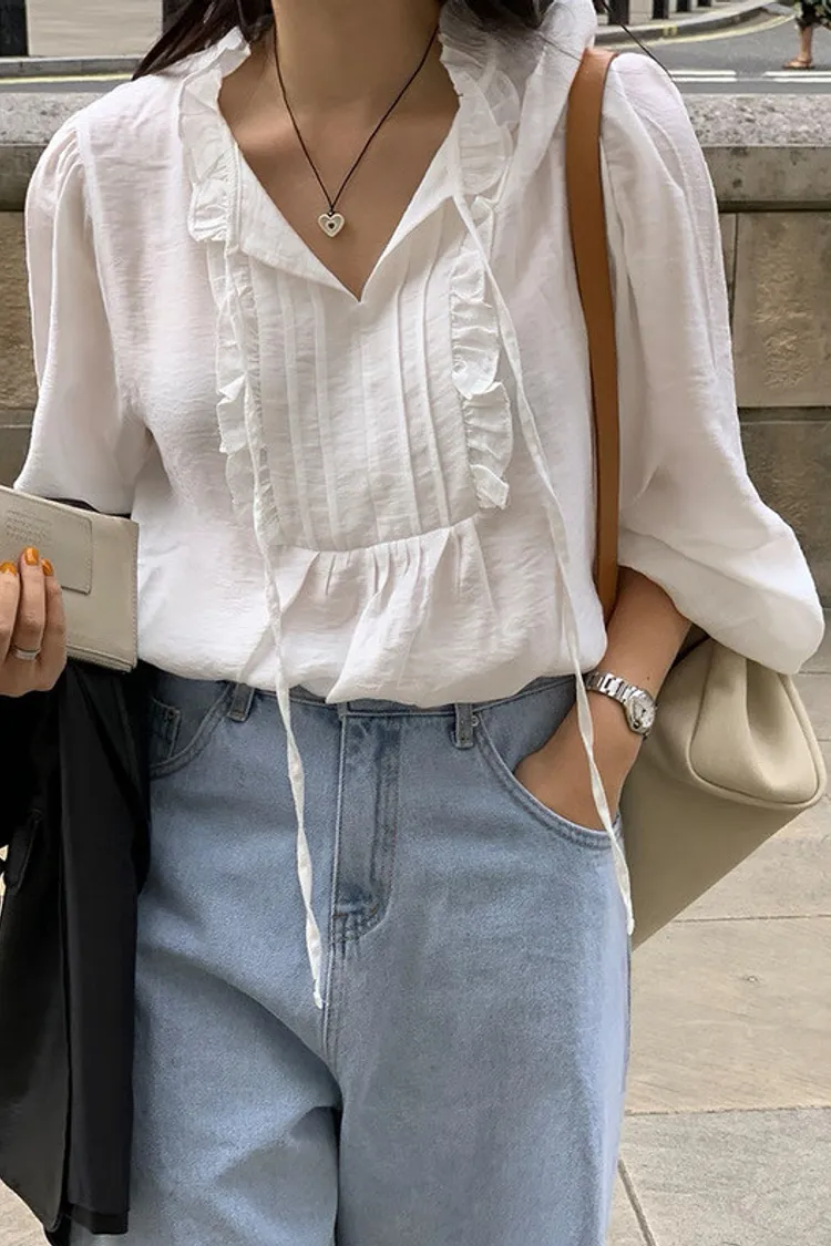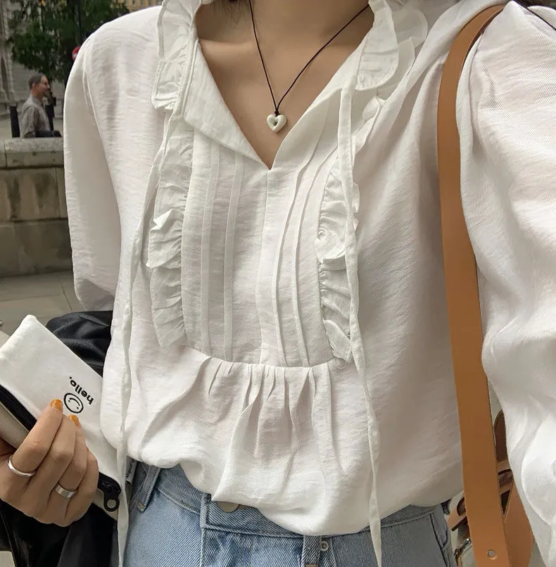 高級甜美木耳花邊娃娃領繫帶襯衫