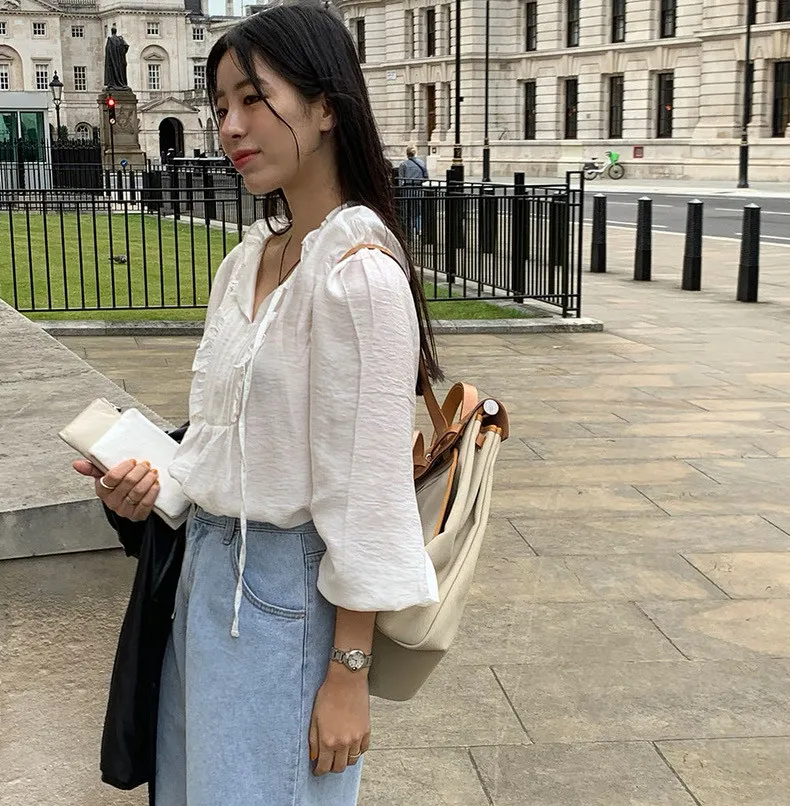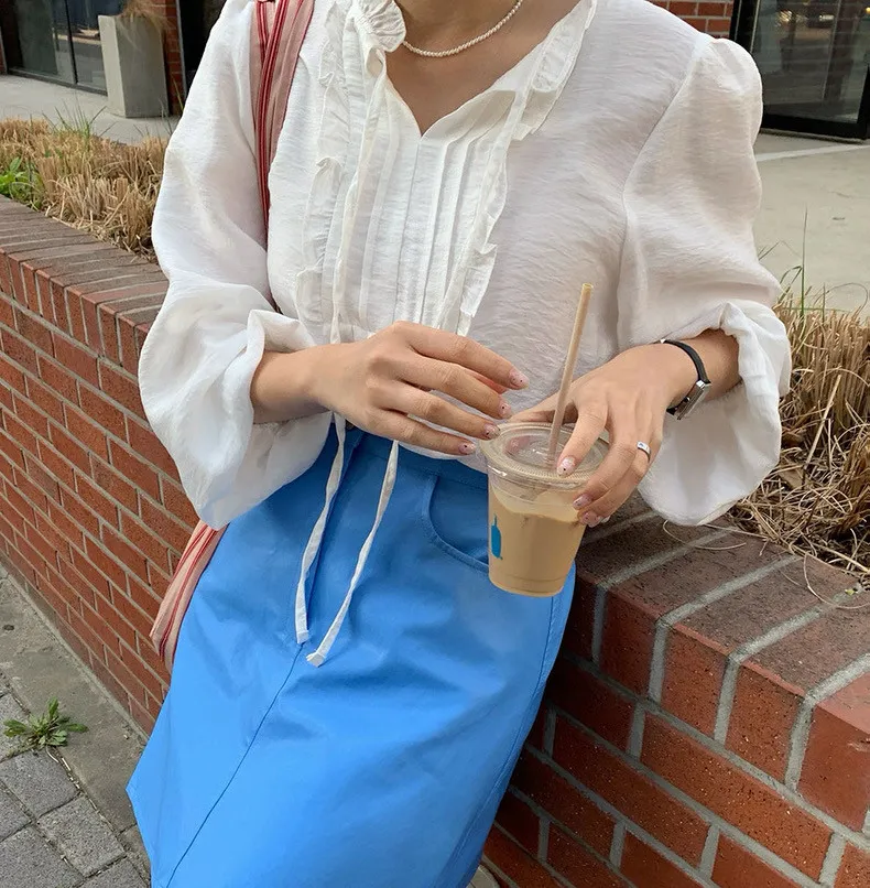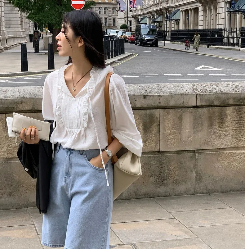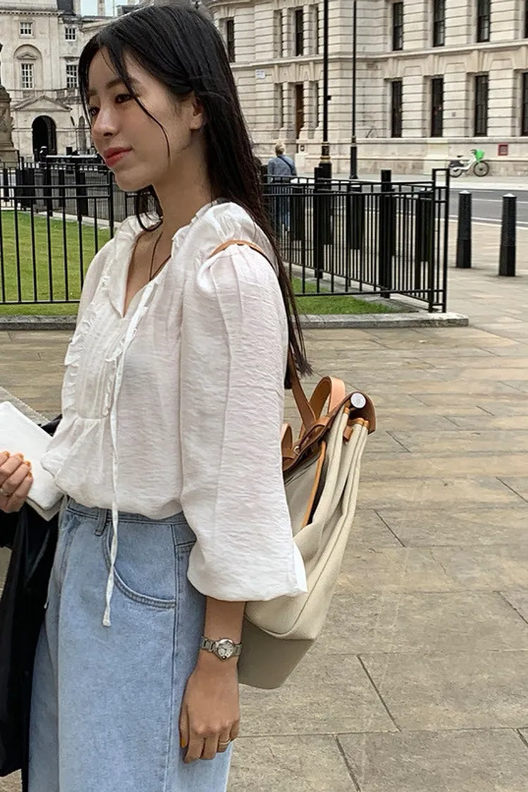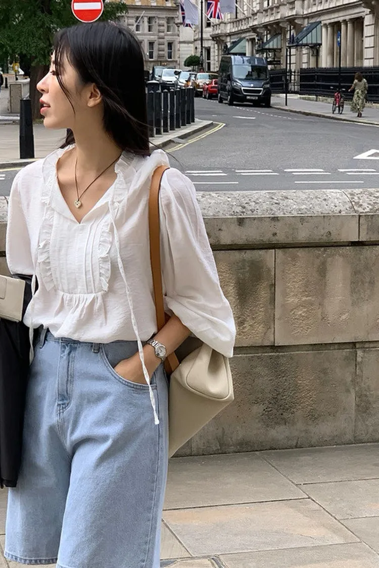 高級甜美木耳花邊娃娃領繫帶襯衫