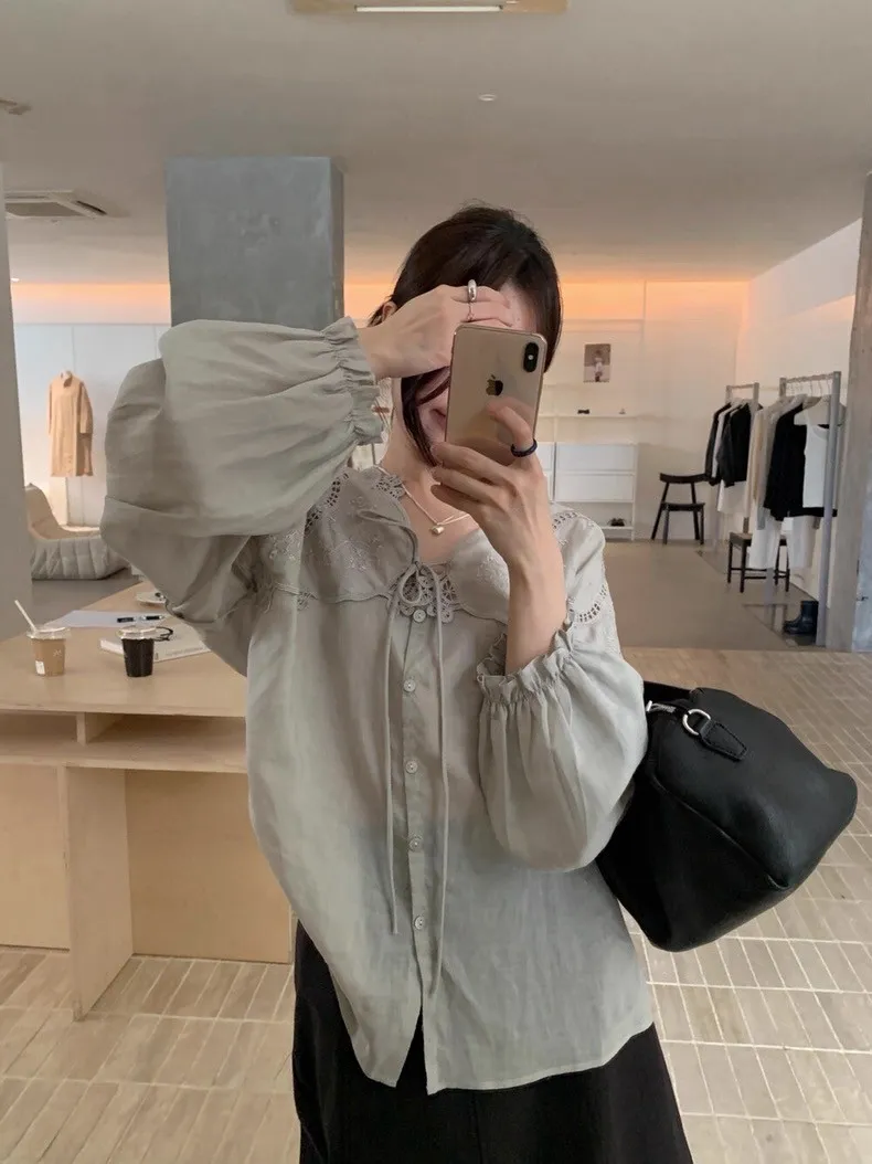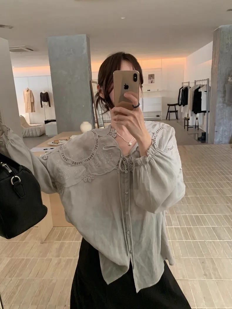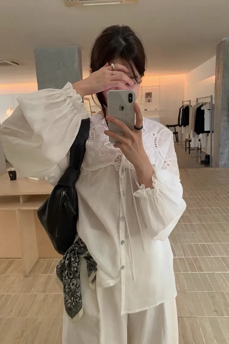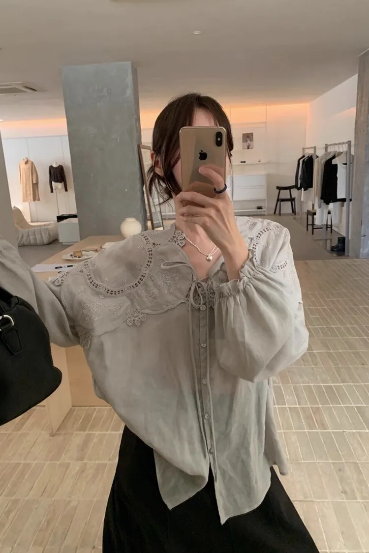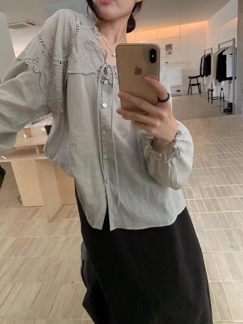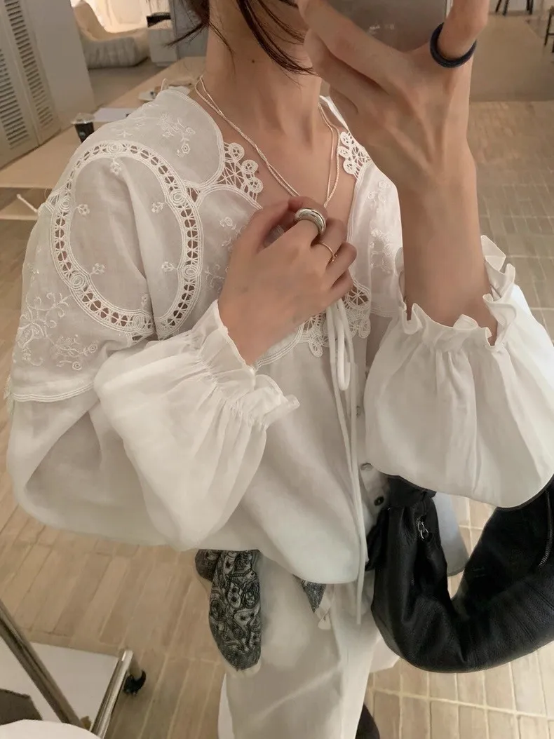 法式鏤空雕花蕾絲長袖襯衫