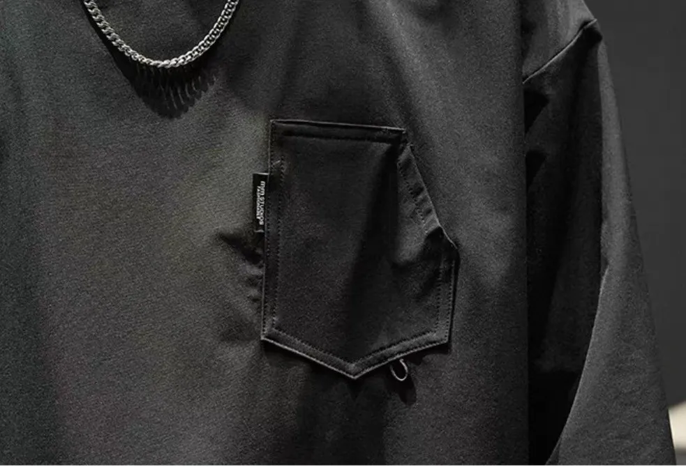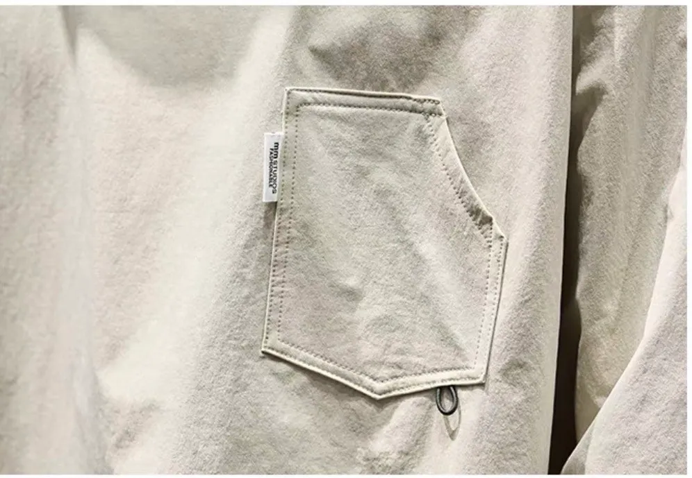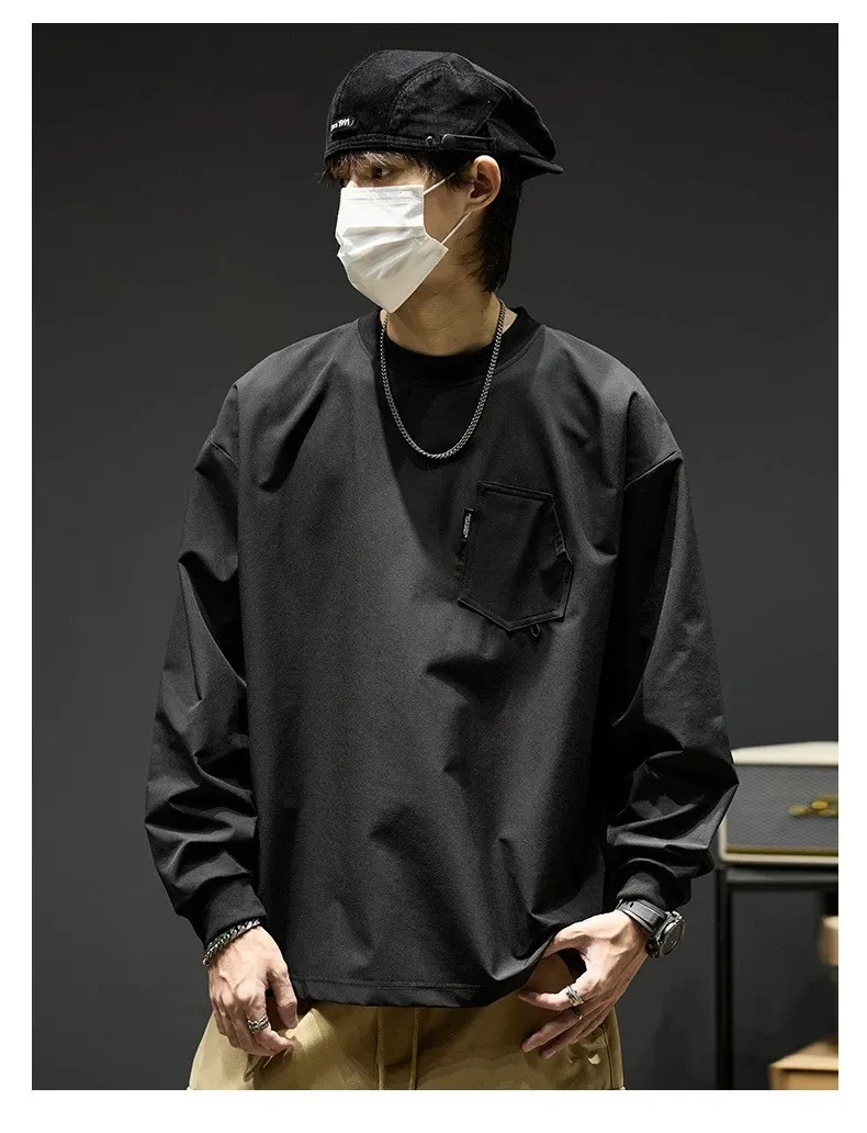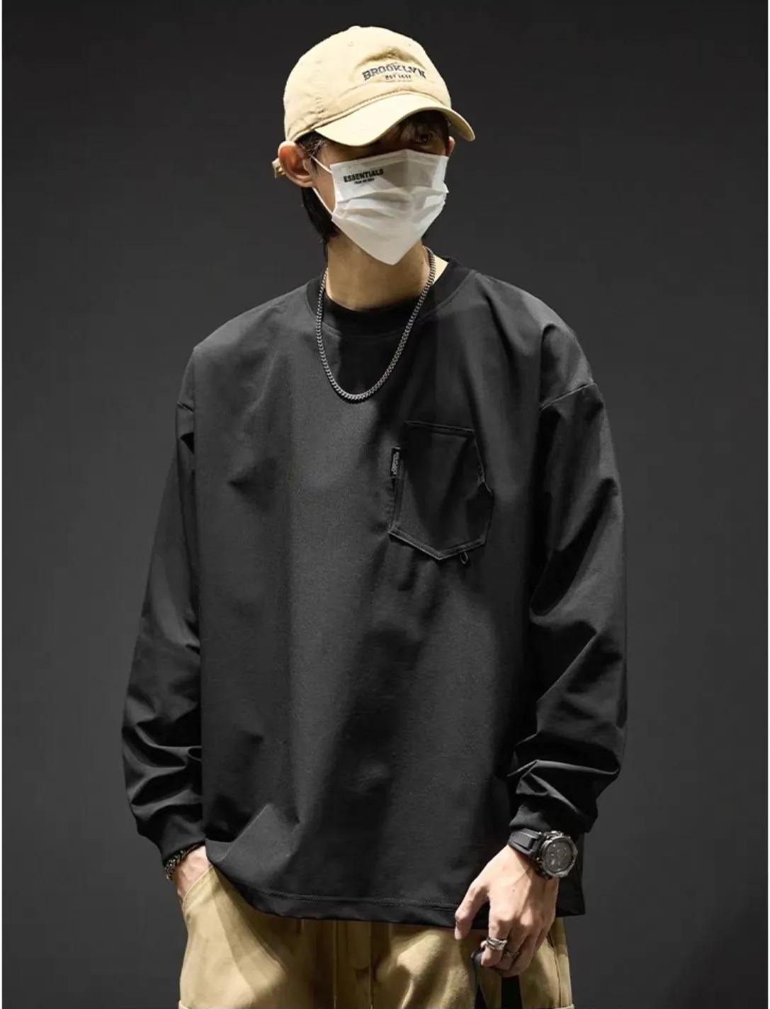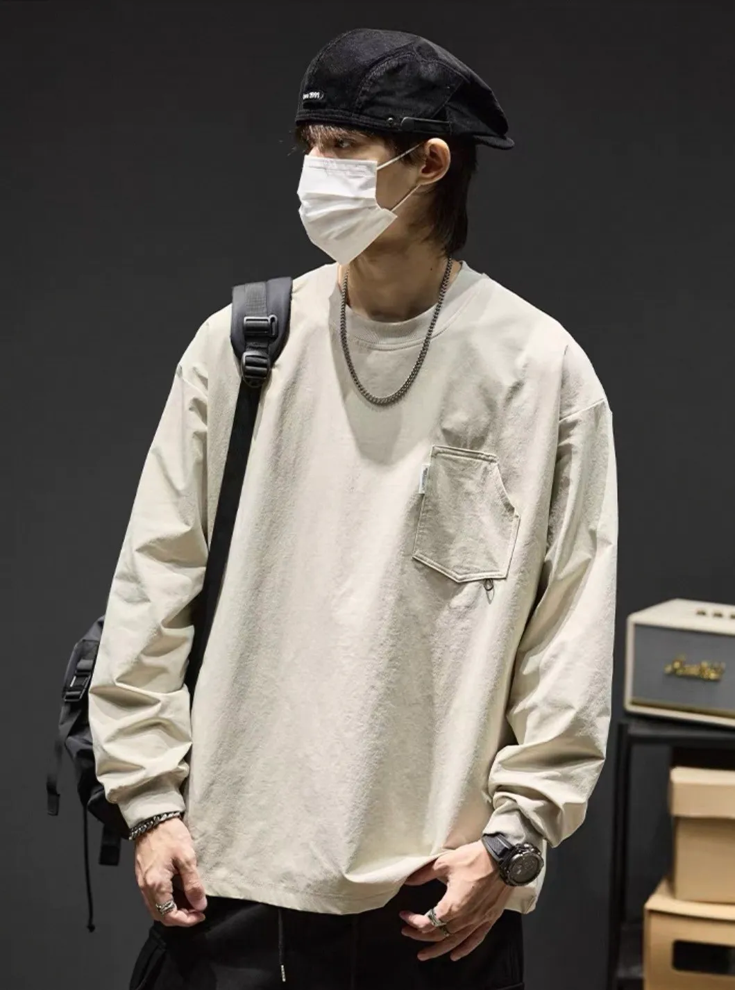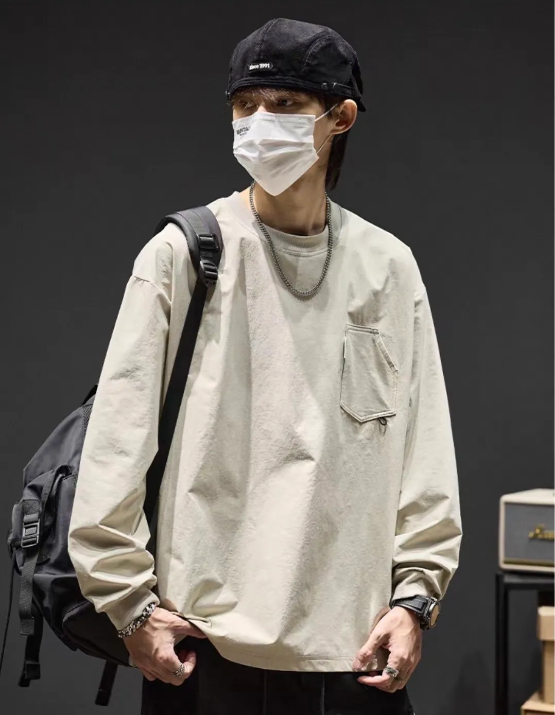 日系簡約寬鬆純色圓領口袋長袖上衣