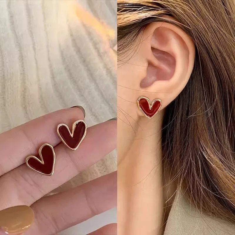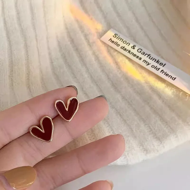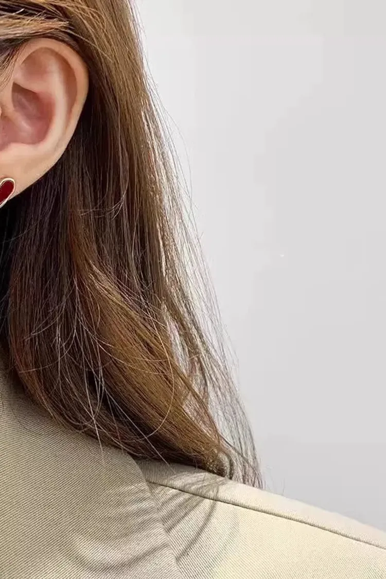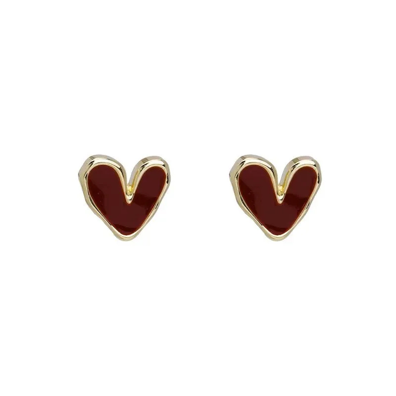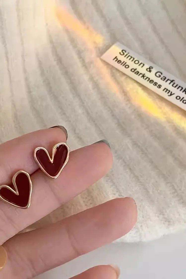 小眾高級感酒紅色愛心小耳針925銀針