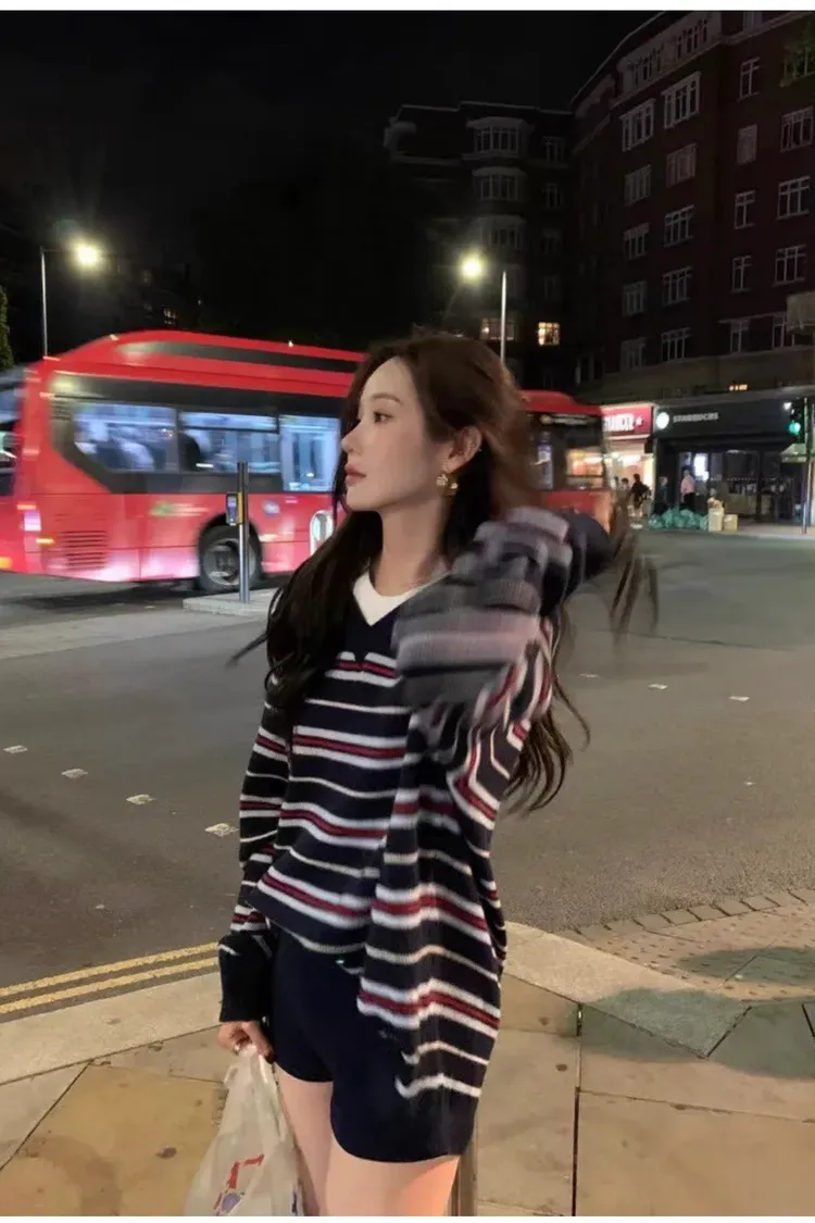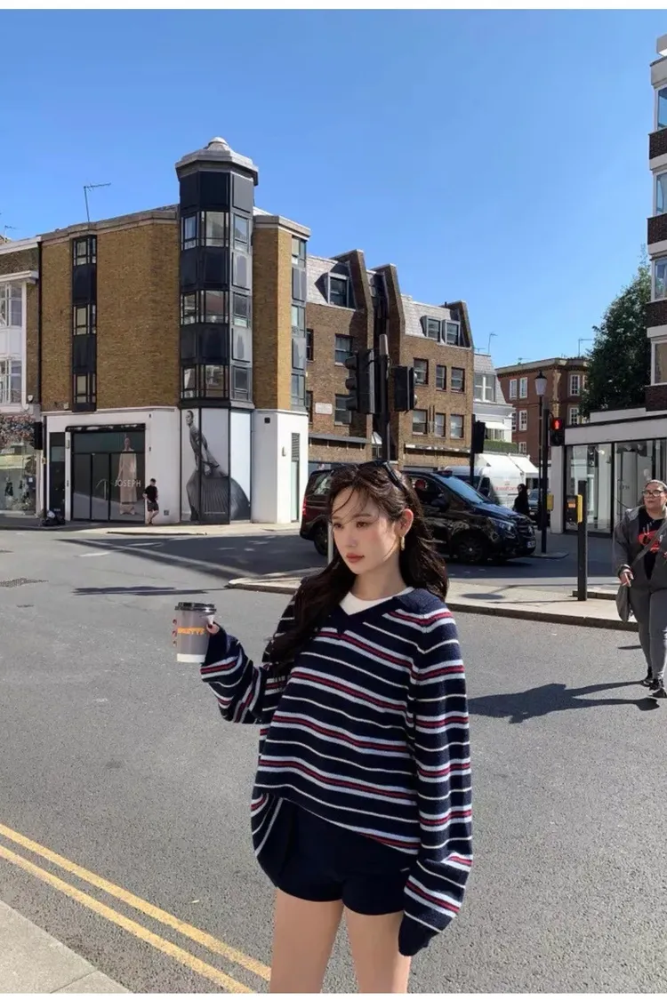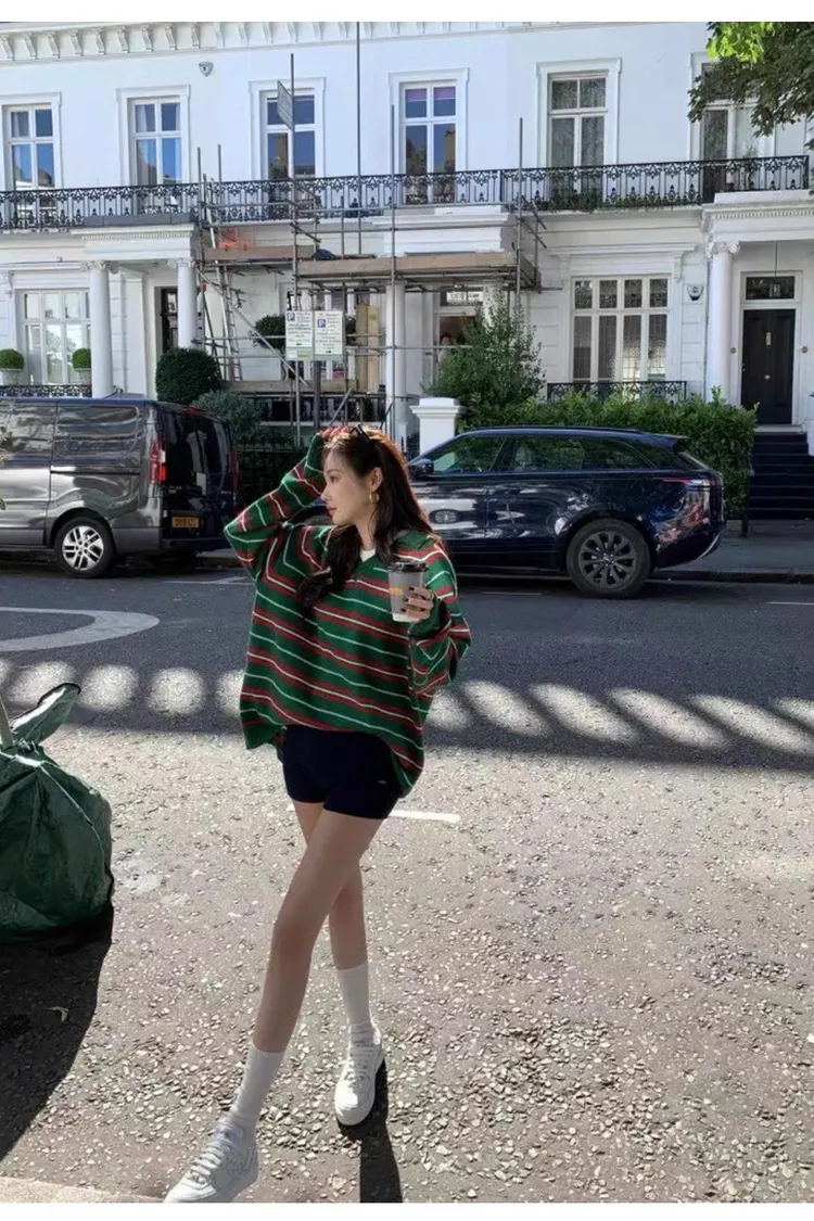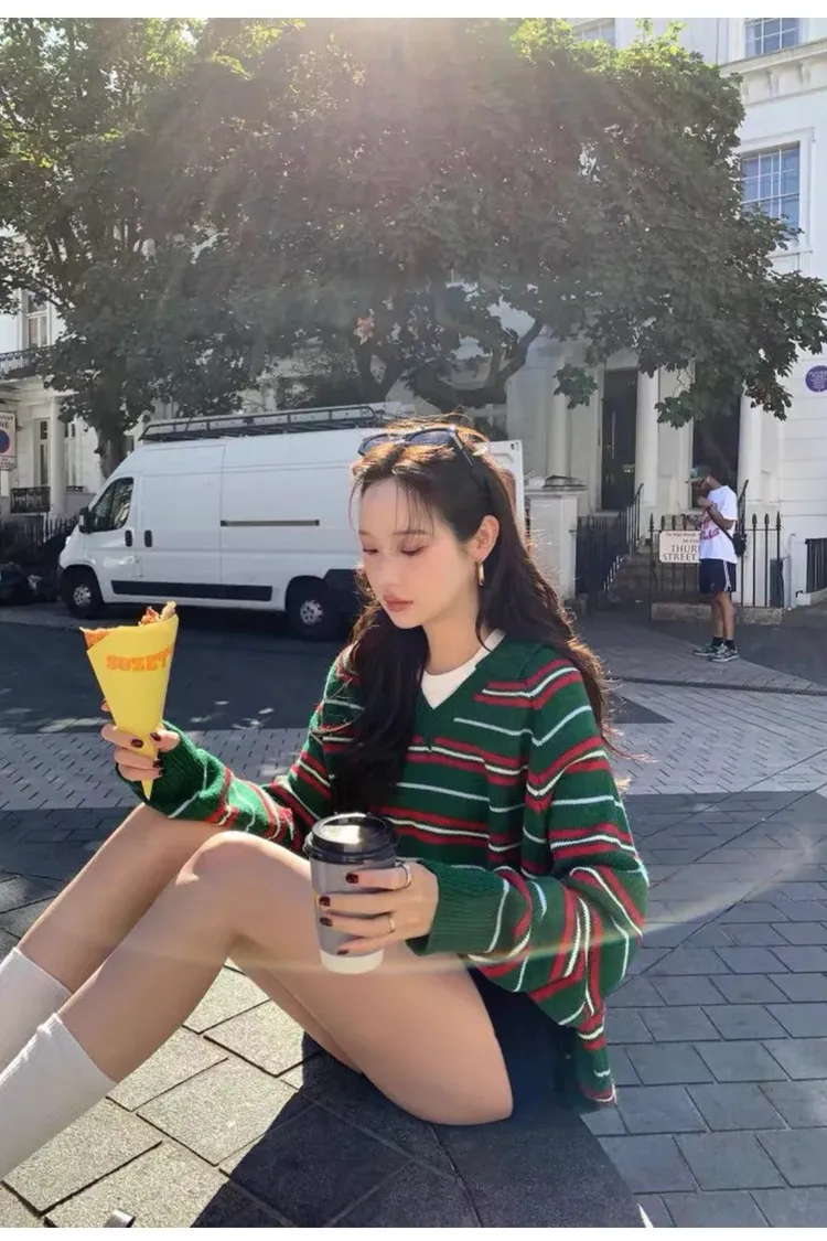 今年的秋冬三大要素 條紋、polo衫、寬鬆針織 這件本人手感也是極致的軟糯跟舒適 單穿在身上,也不會刺刺的 是非常舒服的面料 領口是小v領的 疊穿白t或是襯衫都非常好看長度剛好蓋到屁股冬天也可以搭配鯊魚褲也很有造型感