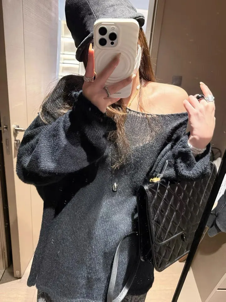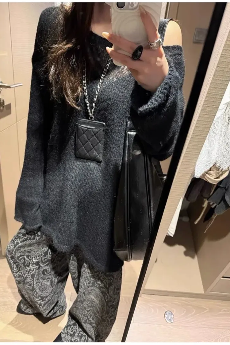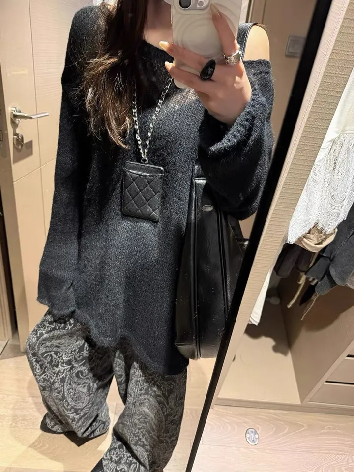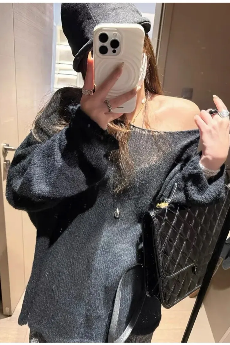 慵懶風透膚軟糯斜肩薄針織衫-黑色
