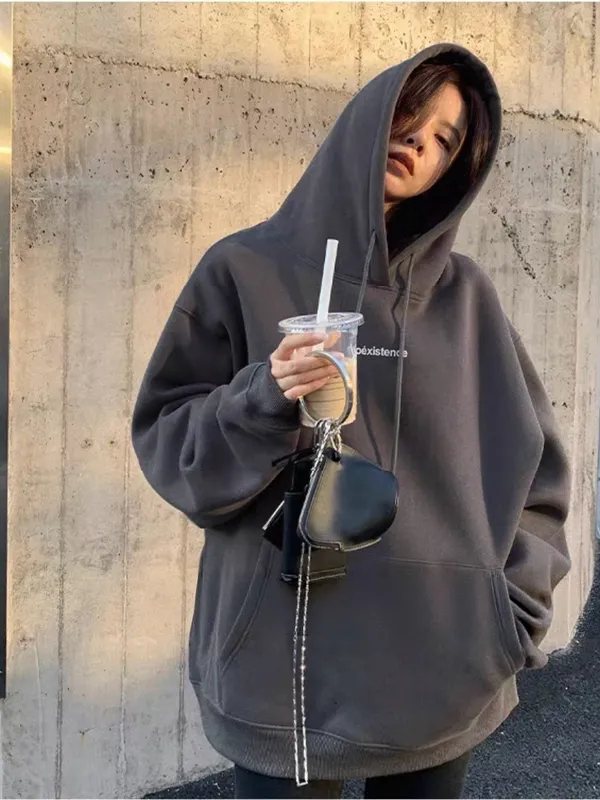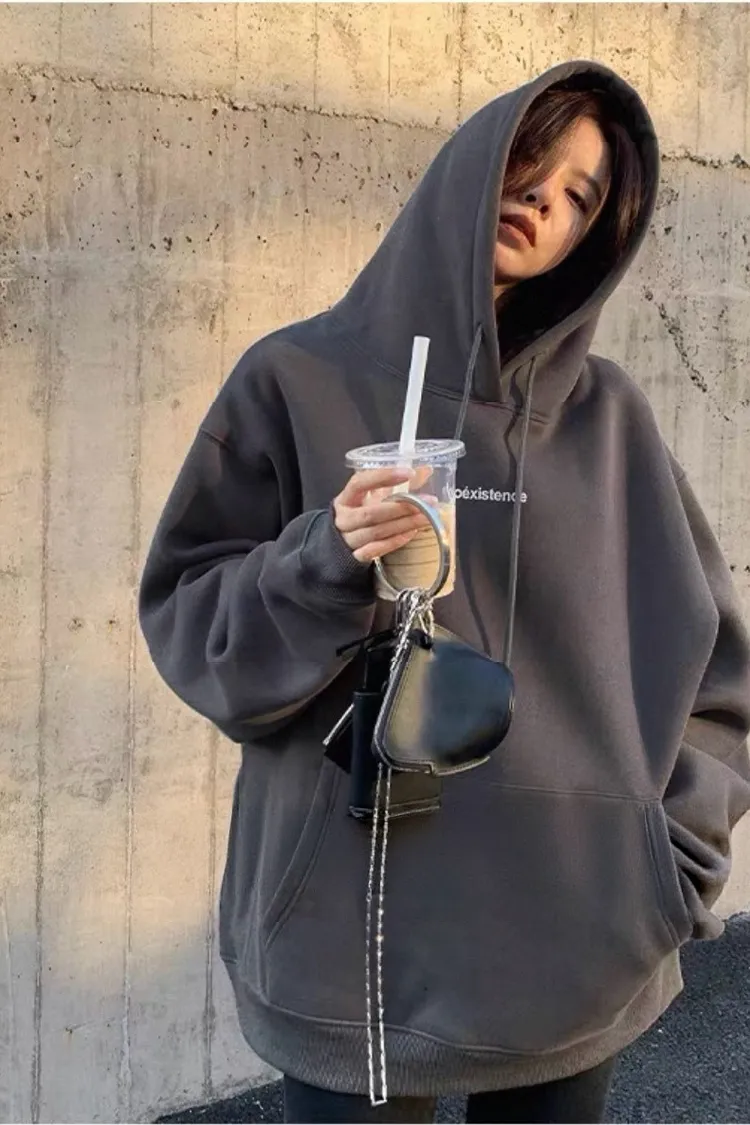 純色英文小印花寬鬆刷毛大學帽T-深灰L