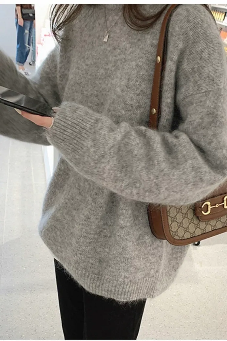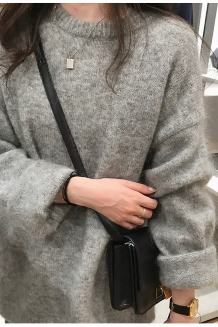 純色馬海毛軟糯慵懶感圓領針織毛衣-灰L